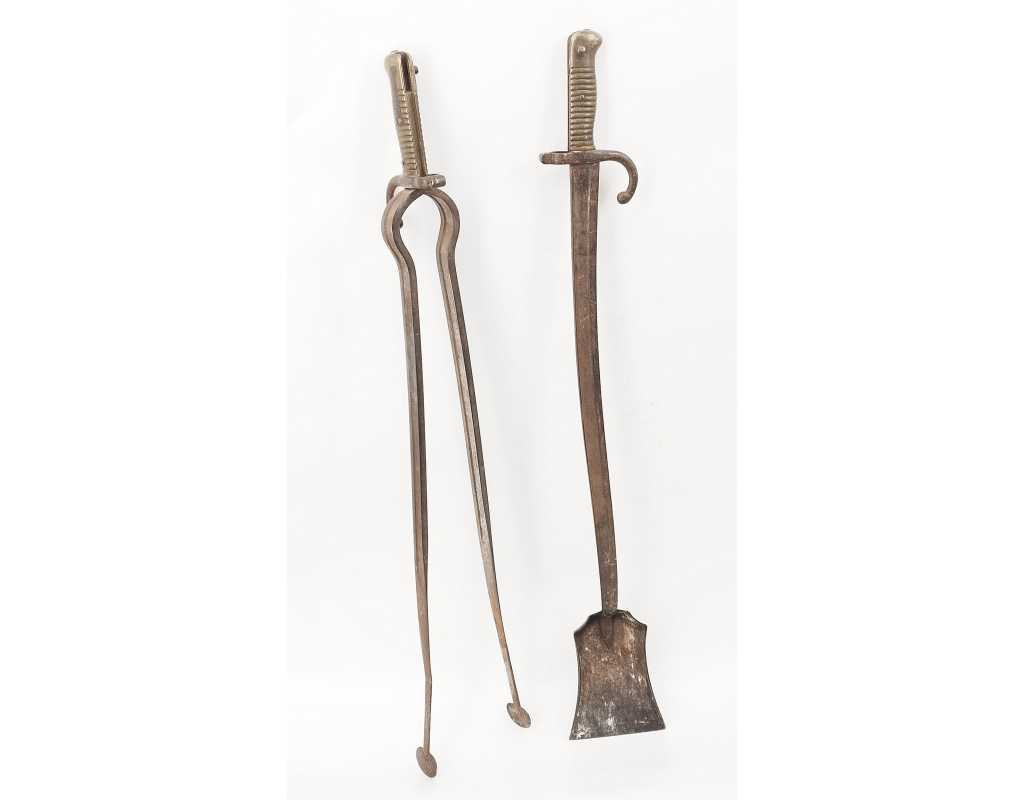BAÏONNETTES CHASSEPOT 1866 TRANSFORMÉES EN PELLE ET PINCE USTENSILES DE CHEMINÉES