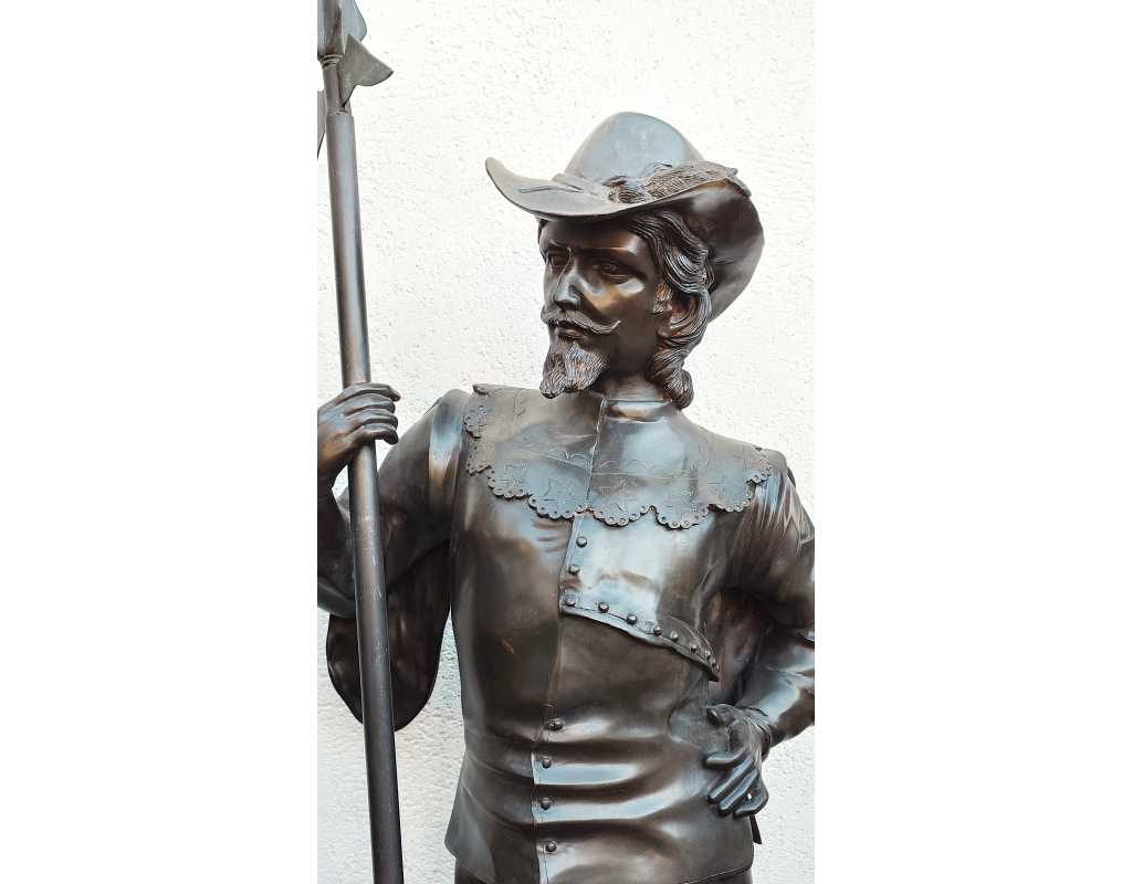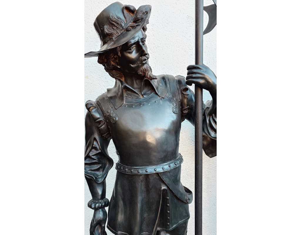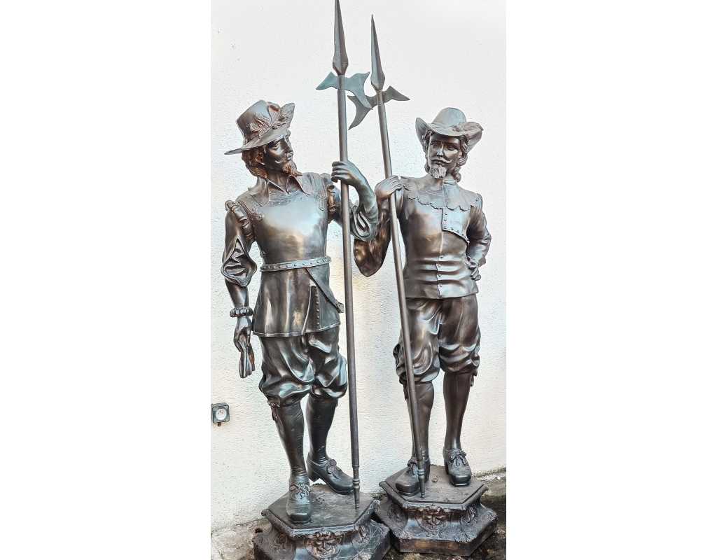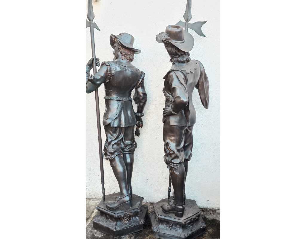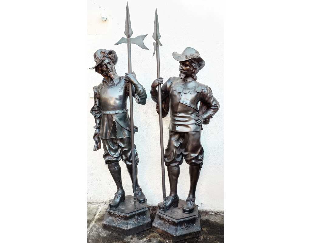 Paire de statues de cavaliers mousquetiares en bronze, fonte du XXè, grand modèle à taille humaine.