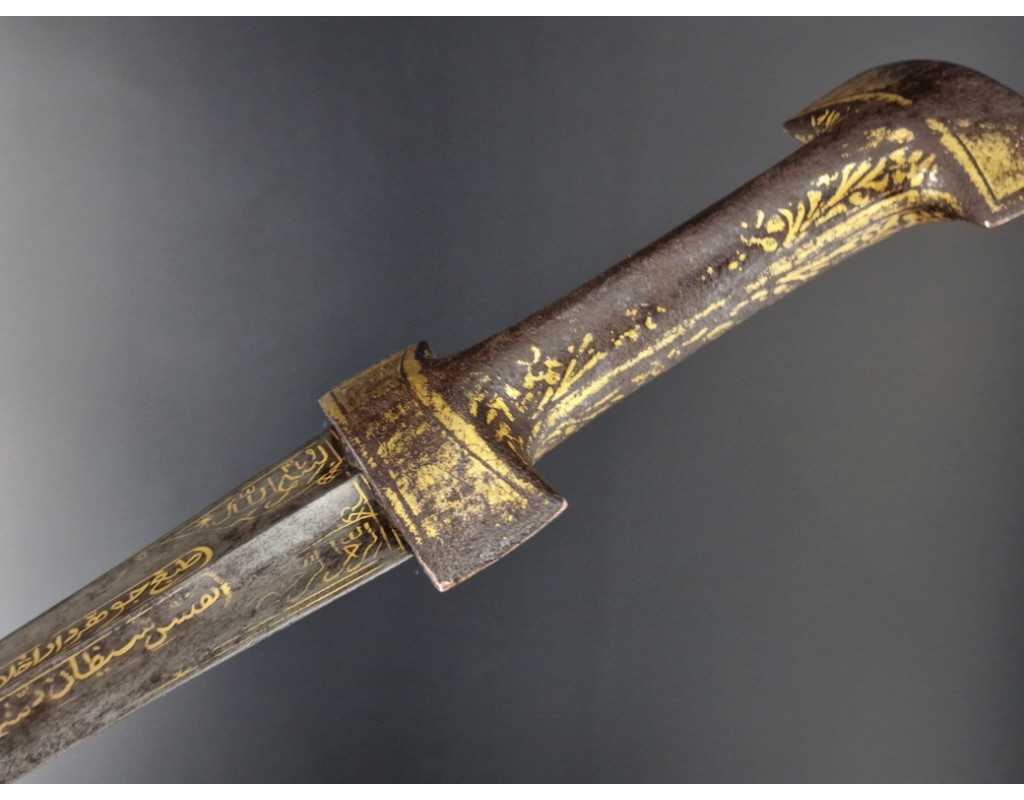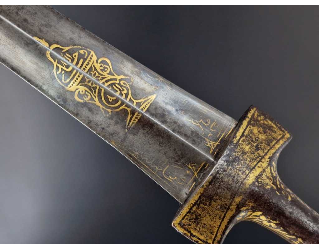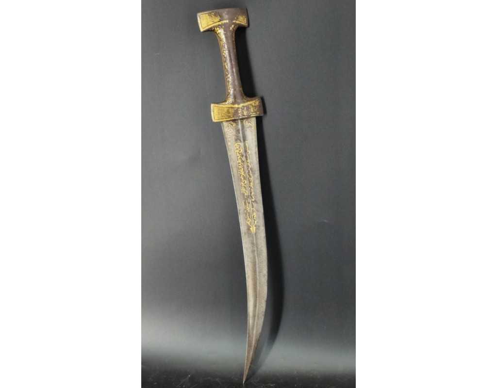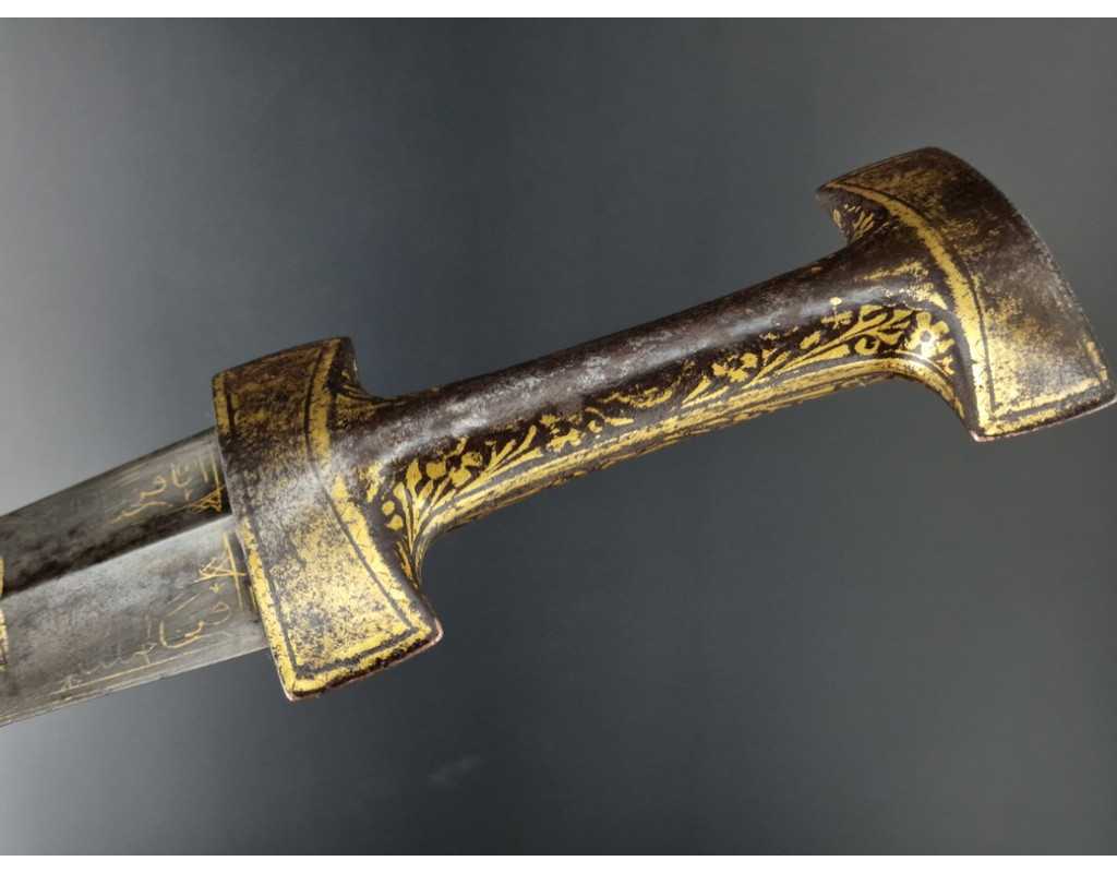 Poignard Kandjar Ottoman du XIXè vers 1850. Poignée en fer damasquiné d'or. Lame de 34cm courbe à arête médiane, décorée d'inscriptions arabes à l'or au talon. Longueur totale 47cm
