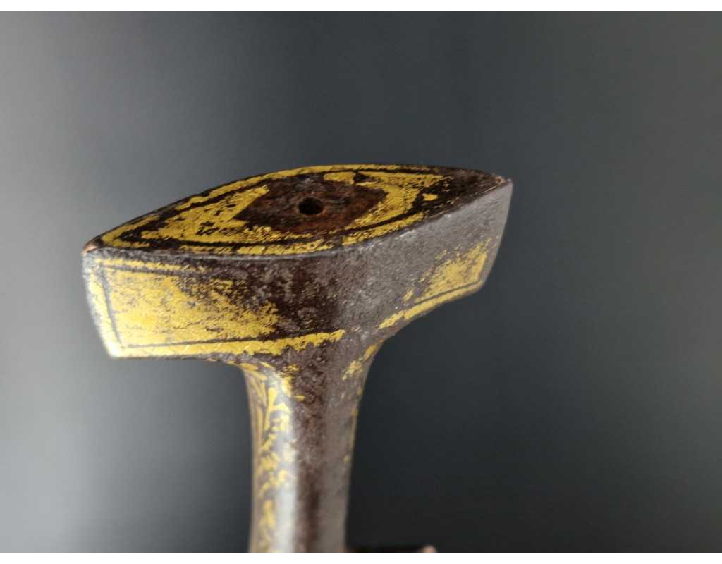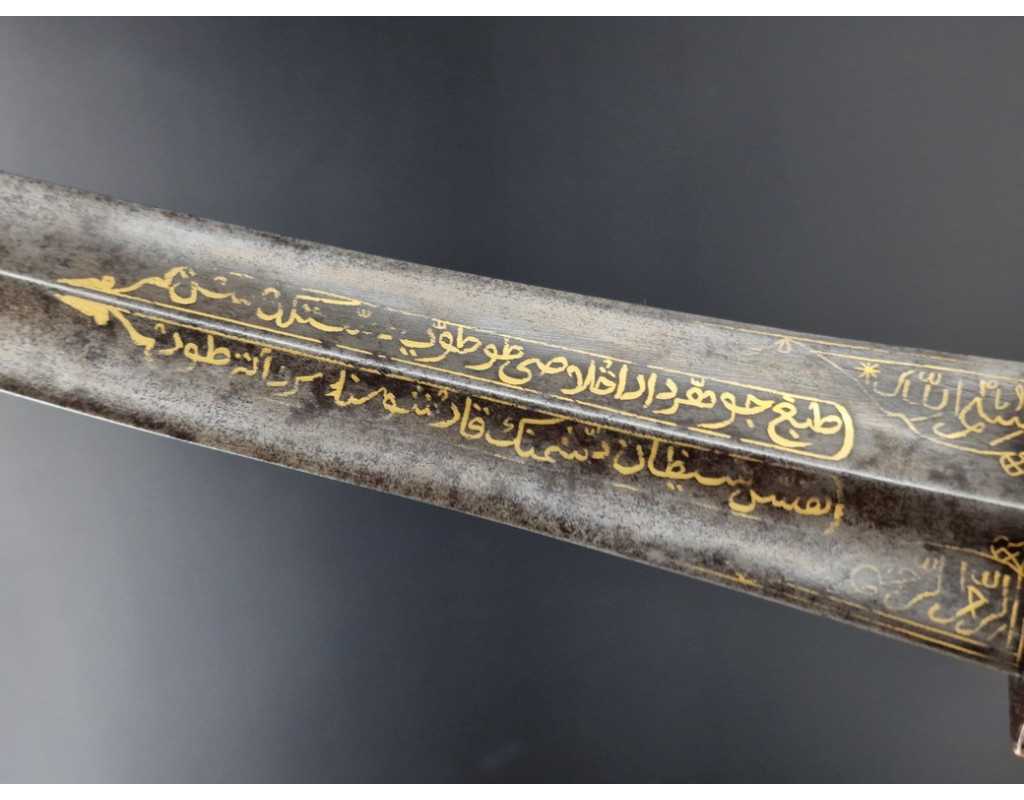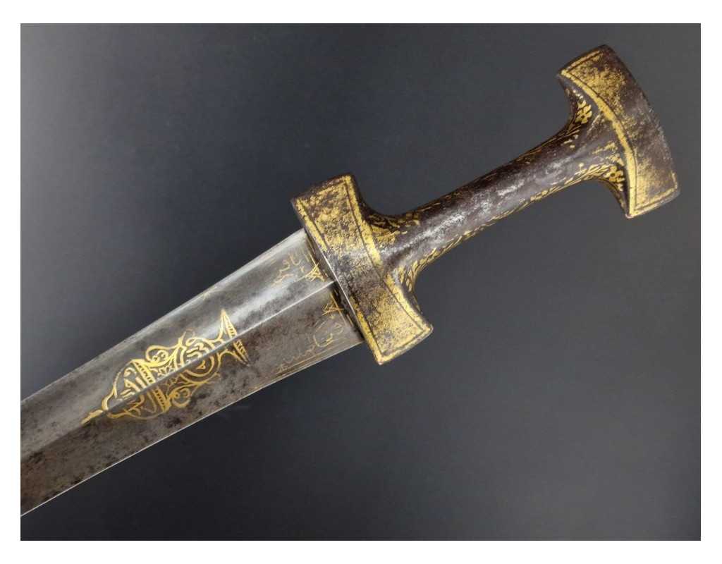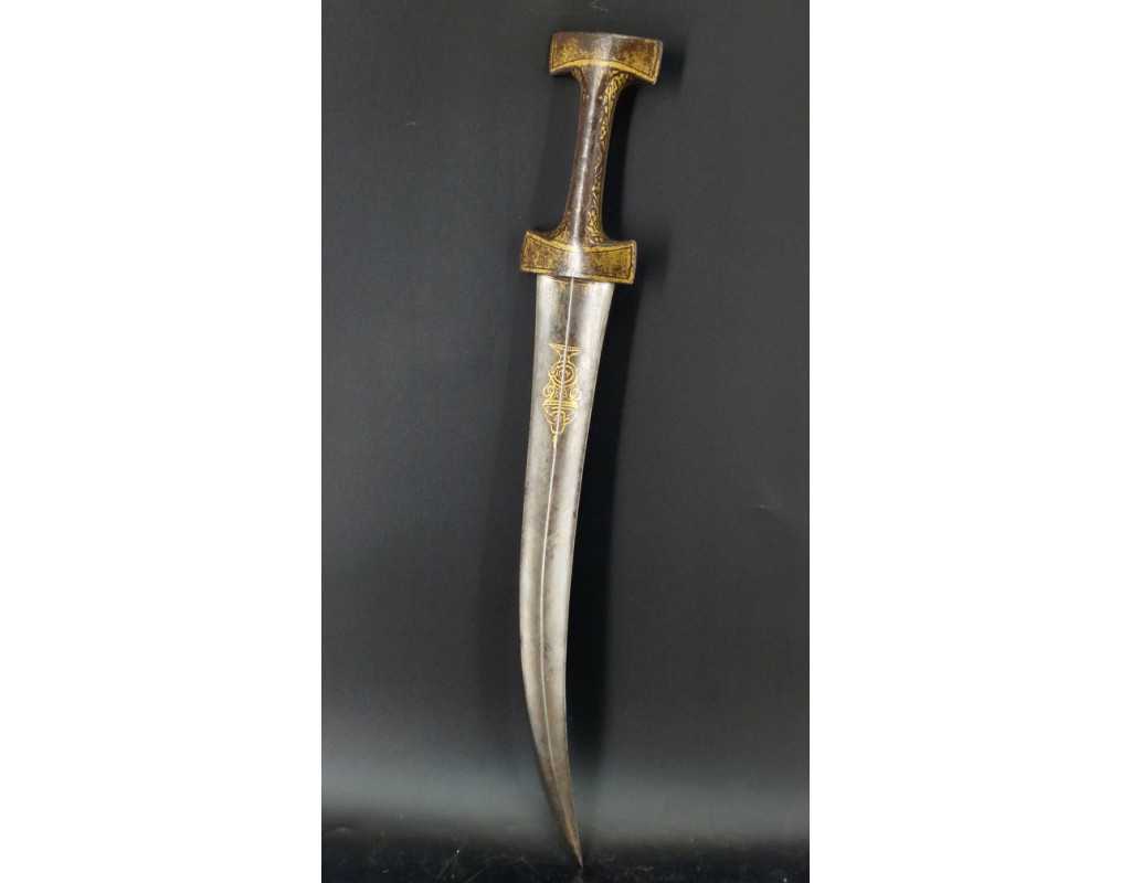 Poignard Kandjar Ottoman du XIXè vers 1850. Poignée en fer damasquiné d'or. Lame de 34cm courbe à arête médiane, décorée d'inscriptions arabes à l'or au talon. Longueur totale 47cm