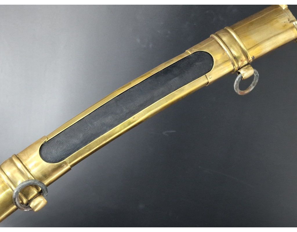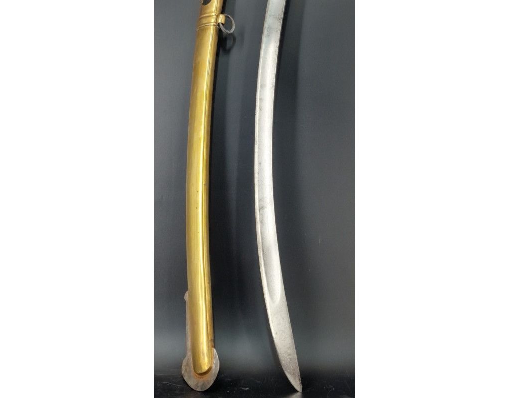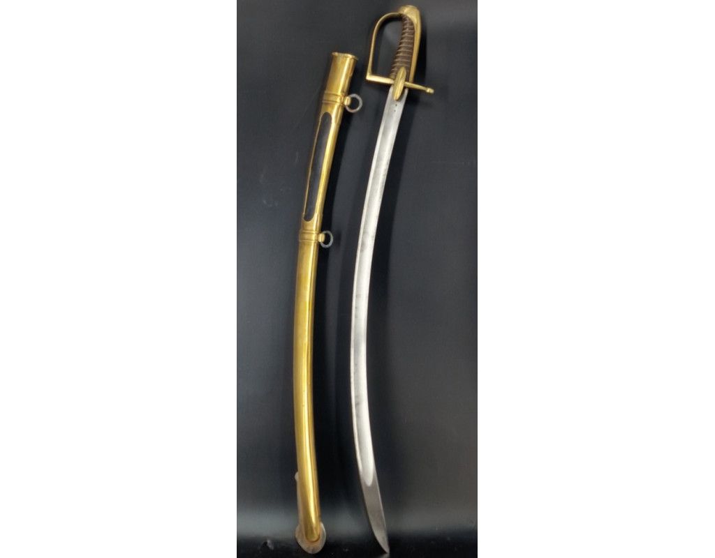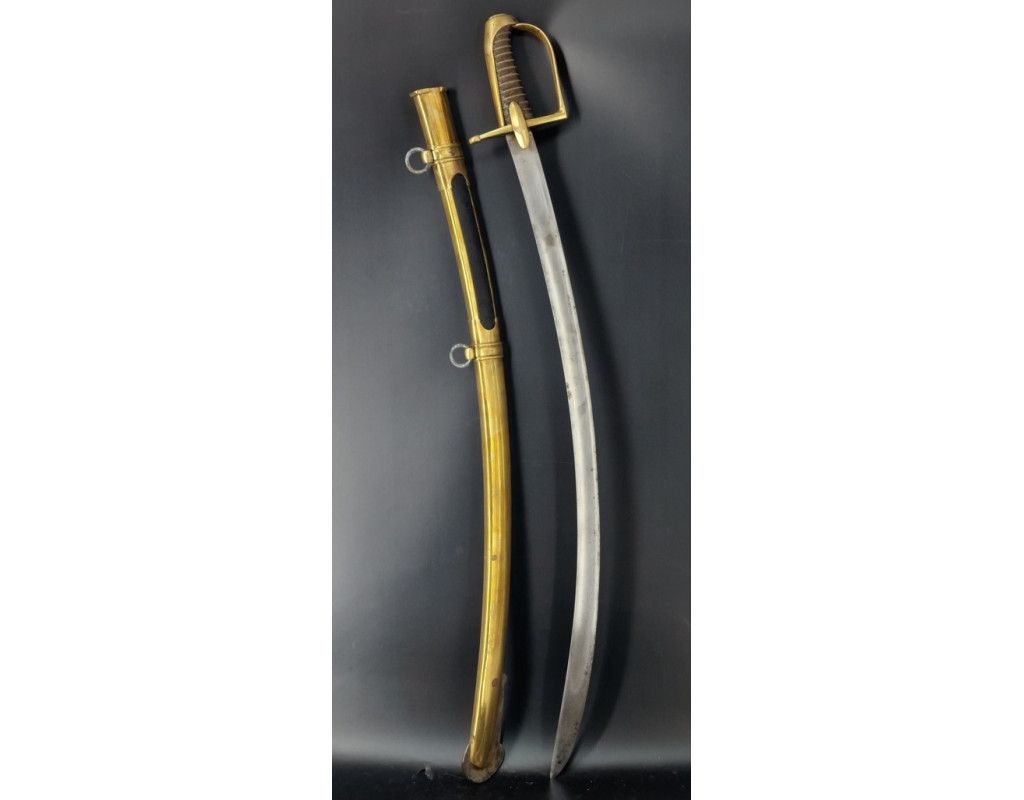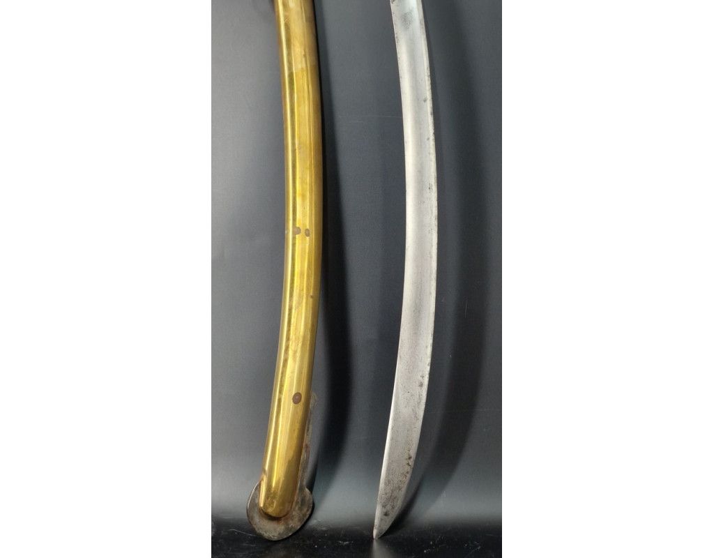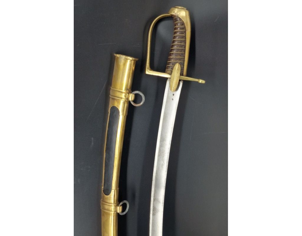 Monture à la hongroise, garde en laiton à une branche moulurée et deux oreillons à facettes, quillon à bouton, calotte à queue unie poinçonnée du " V " vérifié de la manufacture de Versailles et poignée recouverte de basane filigrané de laiton torsadé.. Lame courbe de 85.5cm signée sur le dos plat « Mfture Imple du Klingenthal Juin 1811 », poinçonnée au talon de J.PACHE inspecteur de 1811 à 1812 et F.L LOBSTEIN réviseur de 1804 à 1821, contre-tranchant et pans creux, fines taches localisées sans corrosion. Fourreau moderne à fût de bois à attelles et longues garnitures laiton et crevée en cuir, chape maintenue par une vis, deux anneaux de suspente, dard en fer.
