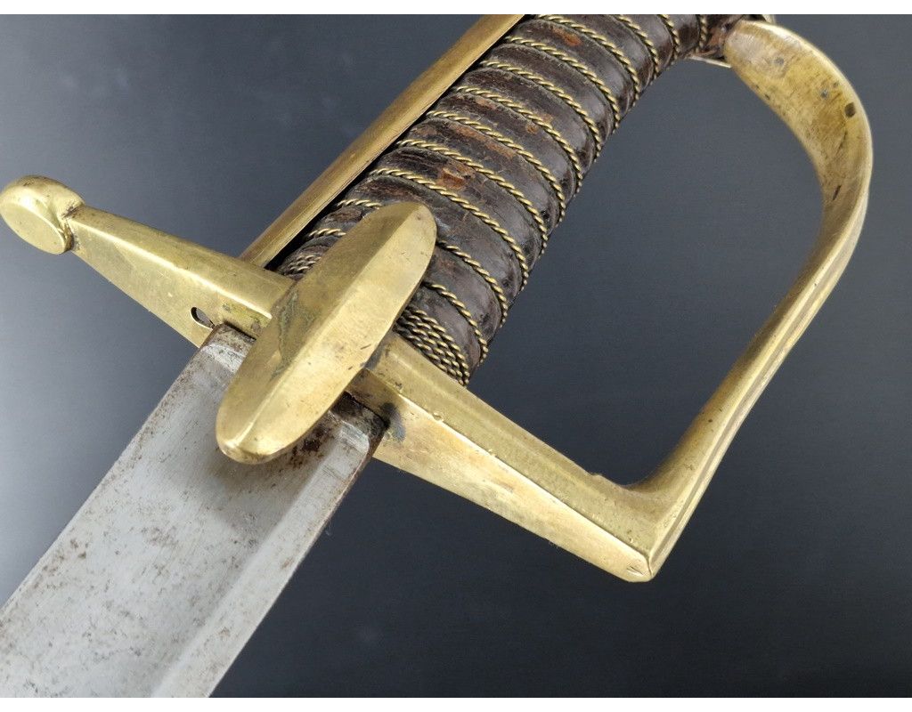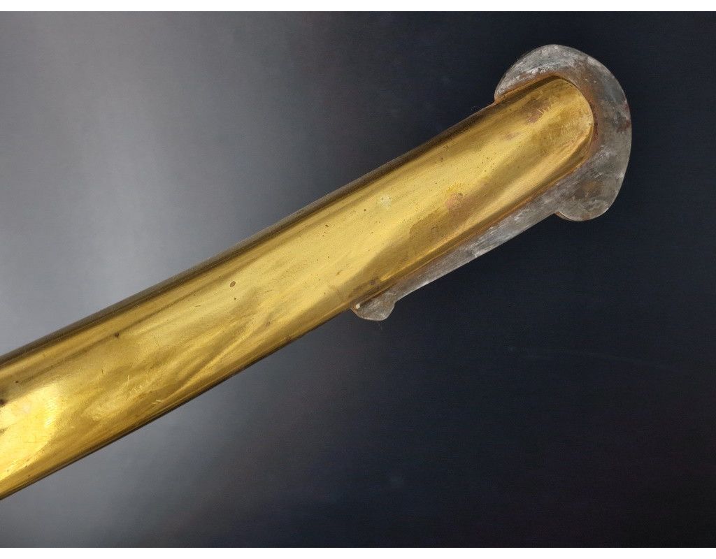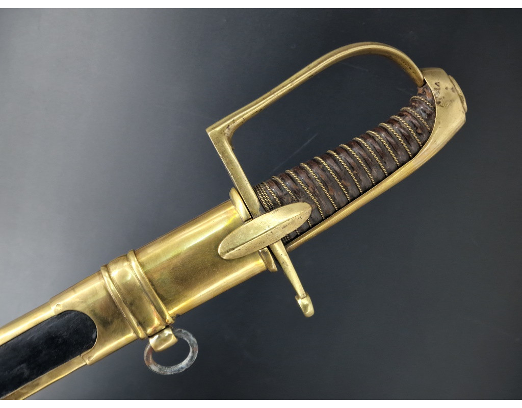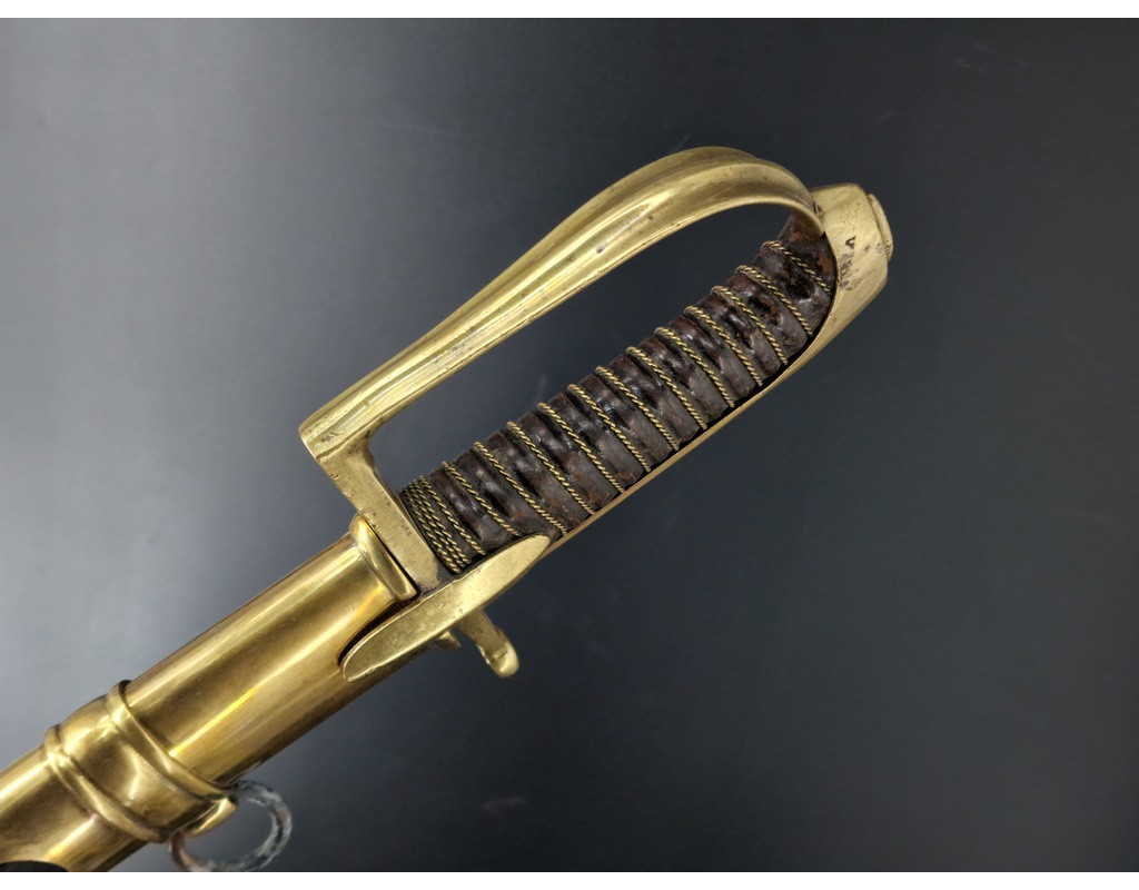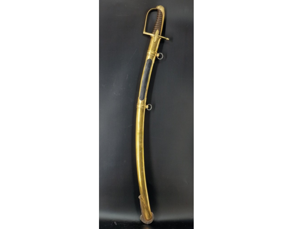 Monture à la hongroise, garde en laiton à une branche moulurée et deux oreillons à facettes, quillon à bouton, calotte à queue unie poinçonnée du " V " vérifié de la manufacture de Versailles et poignée recouverte de basane filigrané de laiton torsadé.. Lame courbe de 85.5cm signée sur le dos plat « Mfture Imple du Klingenthal Juin 1811 », poinçonnée au talon de J.PACHE inspecteur de 1811 à 1812 et F.L LOBSTEIN réviseur de 1804 à 1821, contre-tranchant et pans creux, fines taches localisées sans corrosion. Fourreau moderne à fût de bois à attelles et longues garnitures laiton et crevée en cuir, chape maintenue par une vis, deux anneaux de suspente, dard en fer.
