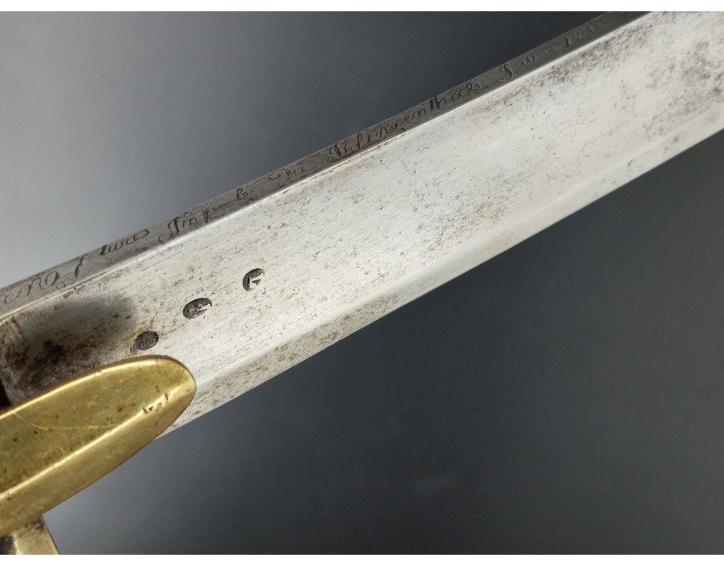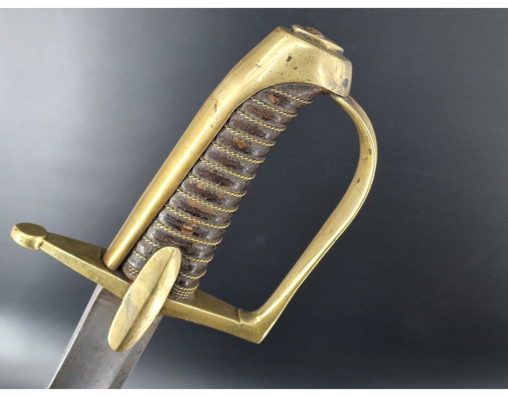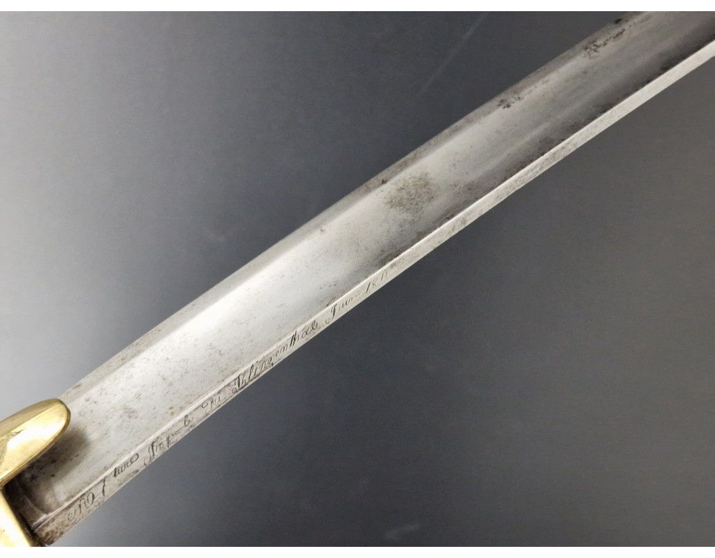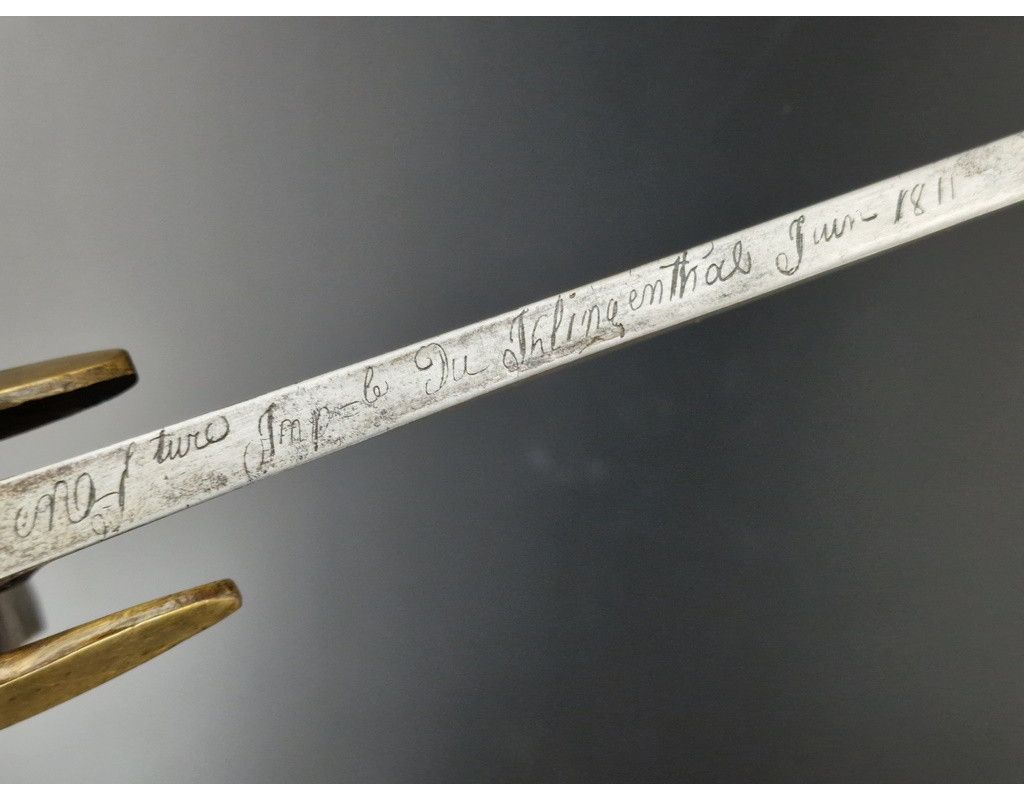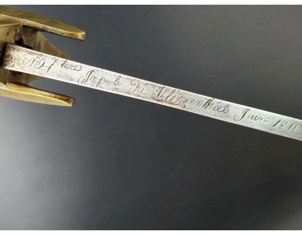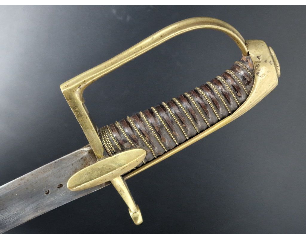 Monture à la hongroise, garde en laiton à une branche moulurée et deux oreillons à facettes, quillon à bouton, calotte à queue unie poinçonnée du " V " vérifié de la manufacture de Versailles et poignée recouverte de basane filigrané de laiton torsadé.. Lame courbe de 85.5cm signée sur le dos plat « Mfture Imple du Klingenthal Juin 1811 », poinçonnée au talon de J.PACHE inspecteur de 1811 à 1812 et F.L LOBSTEIN réviseur de 1804 à 1821, contre-tranchant et pans creux, fines taches localisées sans corrosion. Fourreau moderne à fût de bois à attelles et longues garnitures laiton et crevée en cuir, chape maintenue par une vis, deux anneaux de suspente, dard en fer.