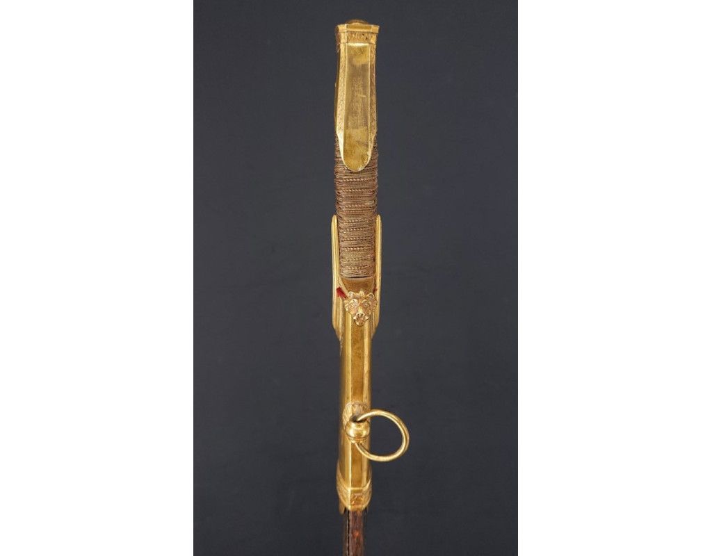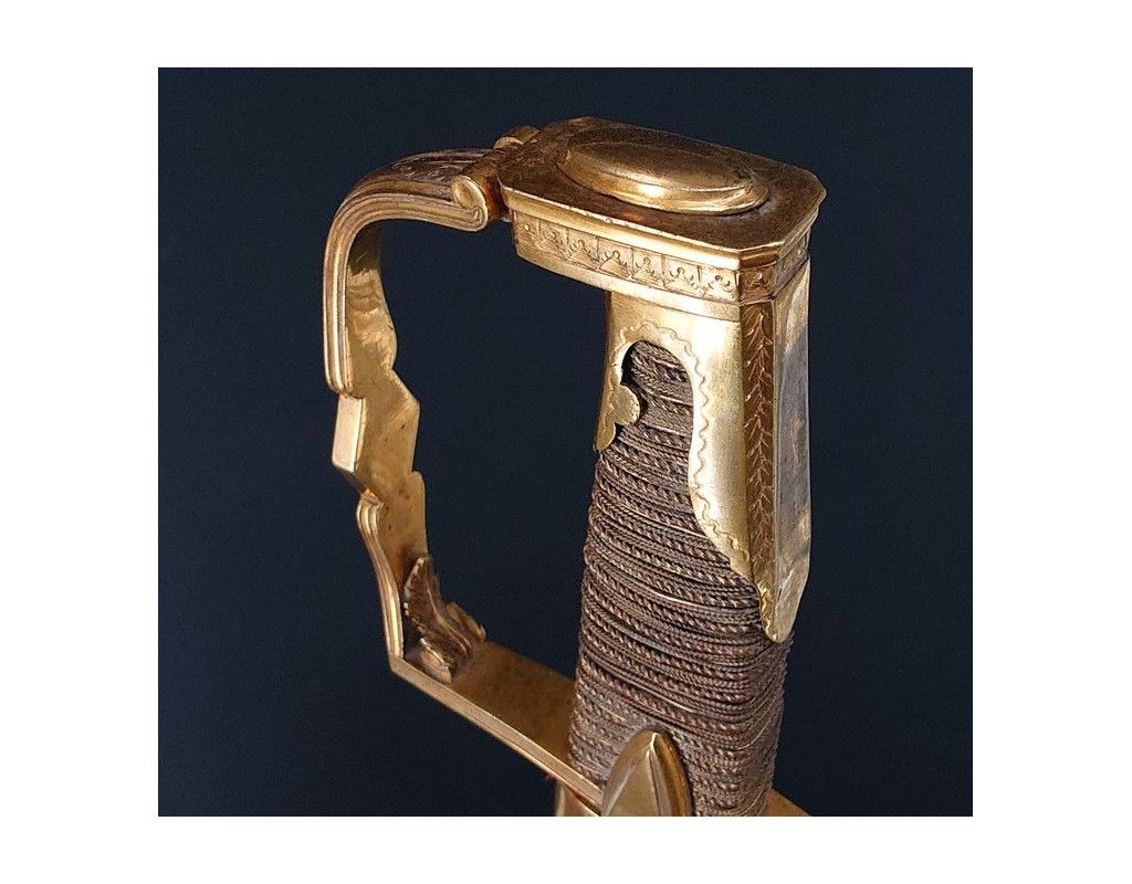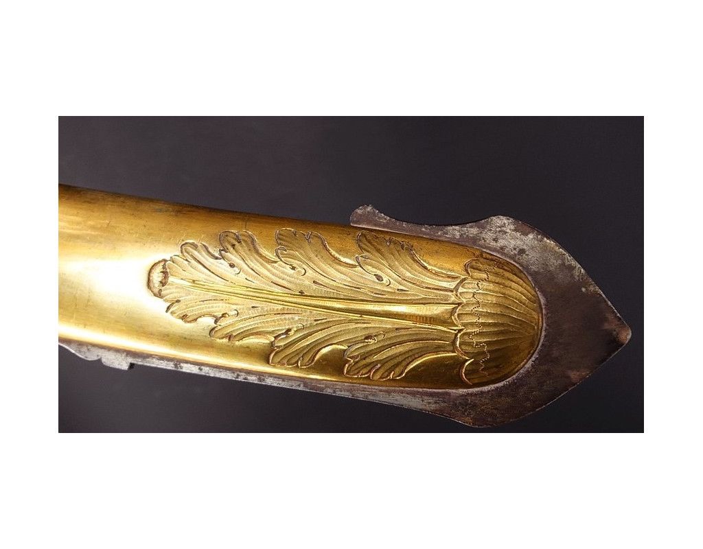 Monture de laiton ciselée et dorée à poignée de bois à quatre pans entièrement filigranée de fil de cuivre doré très fin, calotte courte à l'allemande à dôme supérieur ovale et gravée de plusieurs frises, branche de garde festonnée à médaillon centrale en forme de losange, renforcée par une palmette ciselée en feuille d'acanthe à la jonction de la croisière décorée aux traits, long oreillons symétriques et quillon à tête léonine tenant une orbe entre ses dents. Lame en damas de 86cm courbe à pans creux et dos plat signé "Pierre Guillaume Knecht fabriquant à Soligen", fort contre tranchant élargi, talon large de 38mm gravé en relief sur fond doré d'un trophée d'armes à gauche et de fausses inscriptions coraniques à droite surmonté d'une pyramide, aux premiers tiers des inscriptions arabisantes gravées à l'acide puis dorées. Habillé de son fourreau bois recouvert de chagrin à deux très longues garnitures de laiton dorées et décorées en suite typique cette époque, deux pitons finement ciselés supportent les anneaux de bélière, entrée de chape parfaitement ajustée, dard en fer, usure et manque au bois et au cuir des deux côtés de la crevée, fines taches sans corrosion sur la lame.