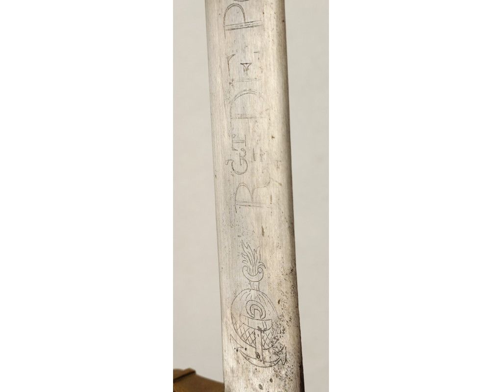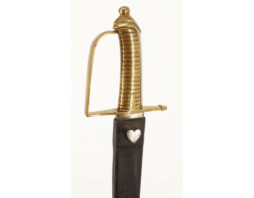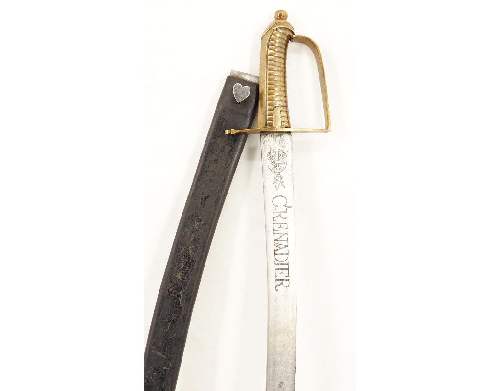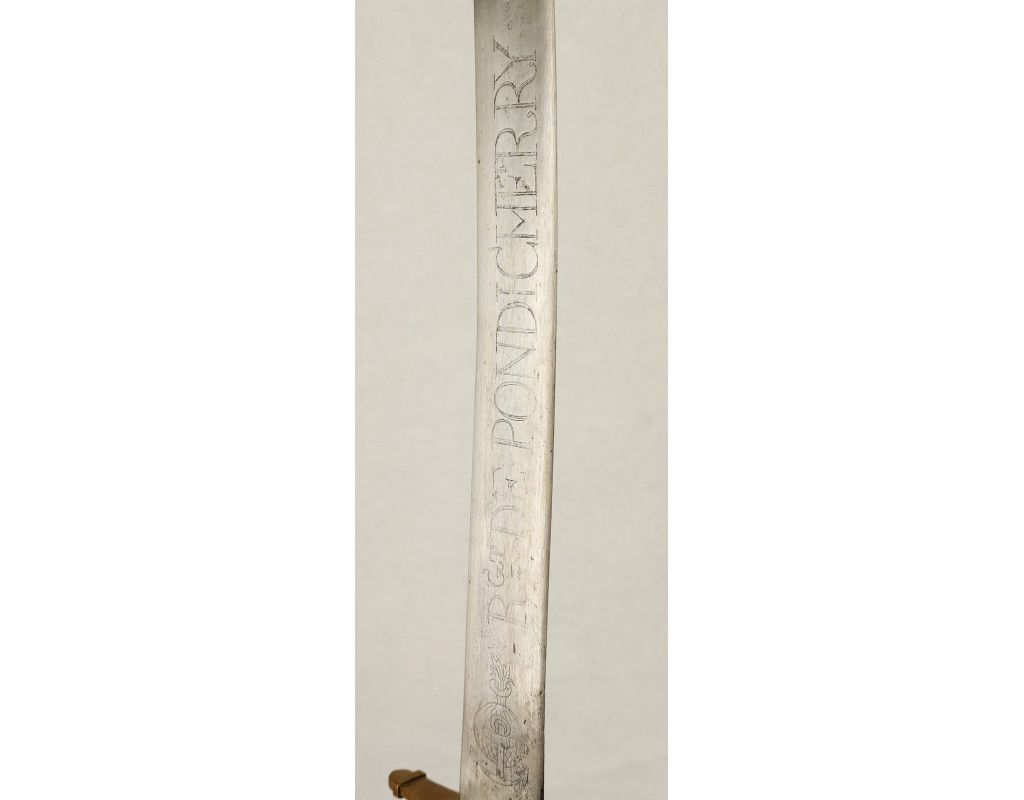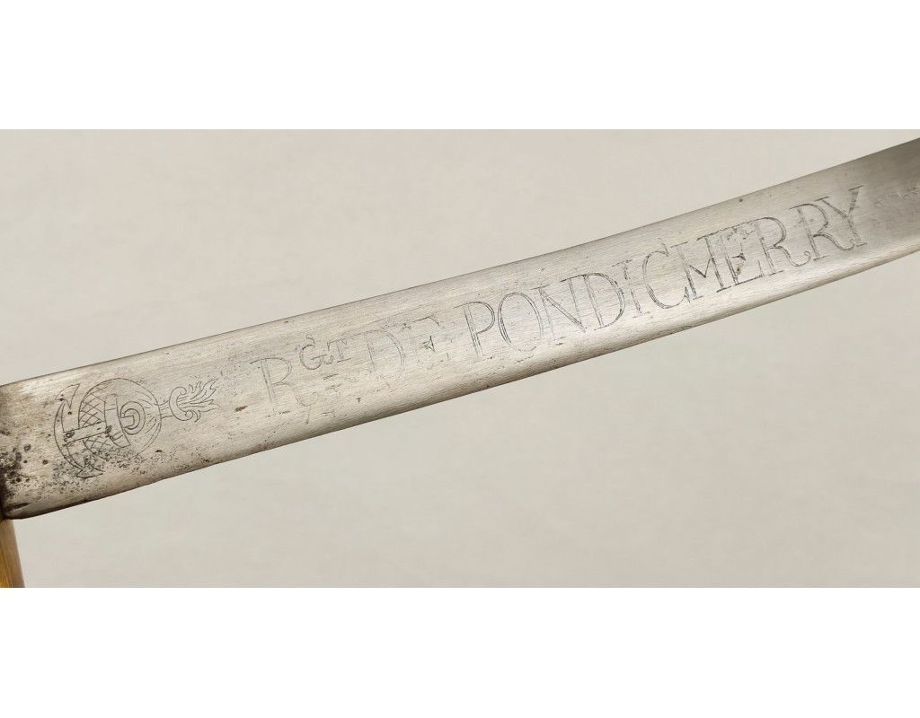 Monture en bronze monobloc du modèle 1767, garde à une branche, poignée cannelée de 19 torons. Lame courbe et plate, dos gravé « M = fture R = le d’Alsace », gravée sur une face d’une bombe enflammée avec ancre de marine et de l’inscription « GRENADIER », et sur l’autre face d’une bombe enflammée avec ancre de marine et de l’inscription « Rgt DE PONDICHERY », L 59,2 cm. Fourreau de cuir fort et noirci à deux garnitures en fer maintenues par le cuir, chape à bouton en forme de cœur.