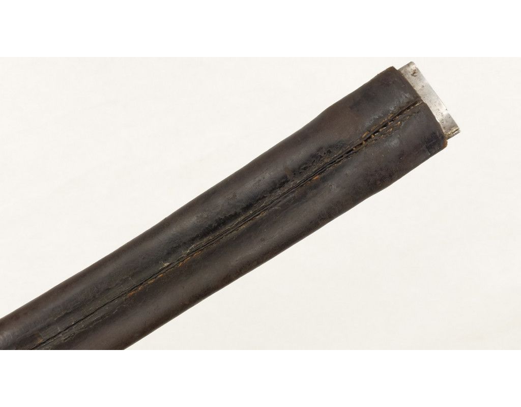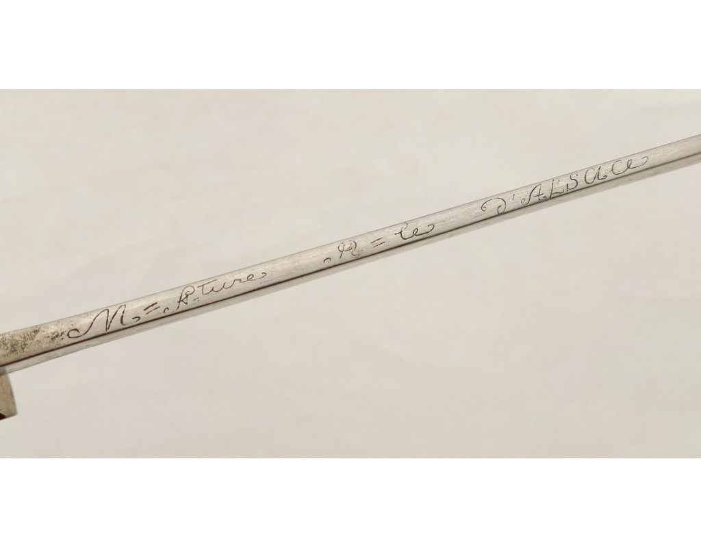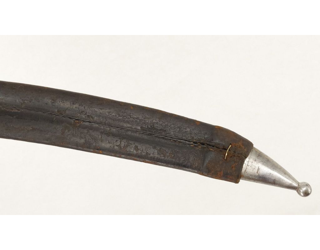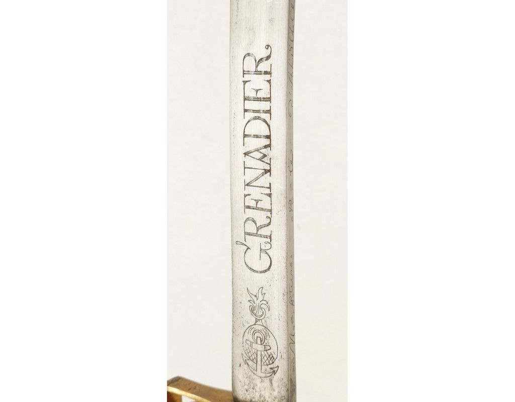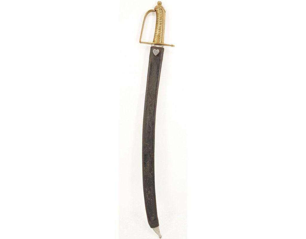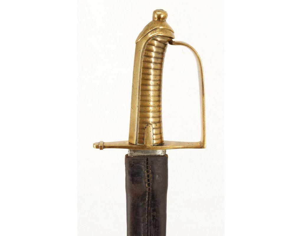 Monture en bronze monobloc du modèle 1767, garde à une branche, poignée cannelée de 19 torons. Lame courbe et plate, dos gravé « M = fture R = le d’Alsace », gravée sur une face d’une bombe enflammée avec ancre de marine et de l’inscription « GRENADIER », et sur l’autre face d’une bombe enflammée avec ancre de marine et de l’inscription « Rgt DE PONDICHERY », L 59,2 cm. Fourreau de cuir fort et noirci à deux garnitures en fer maintenues par le cuir, chape à bouton en forme de cœur.
