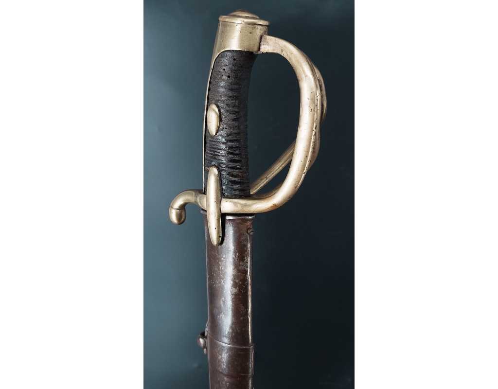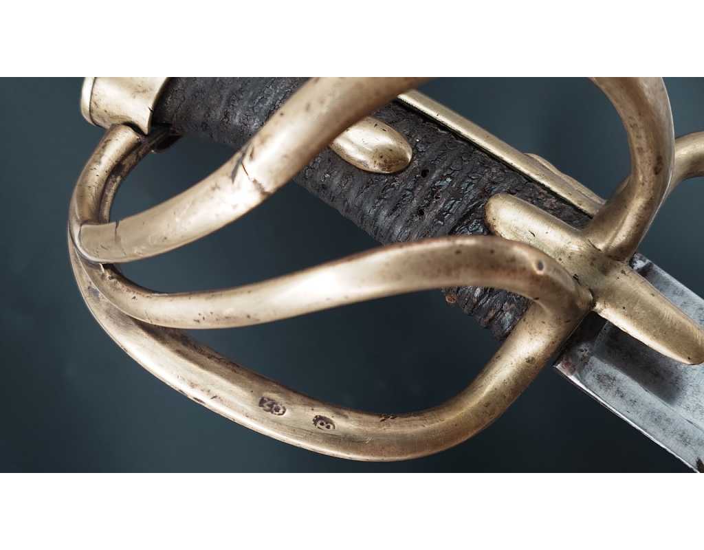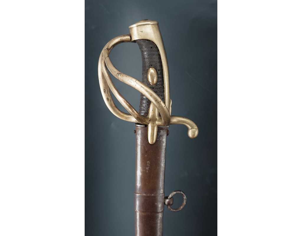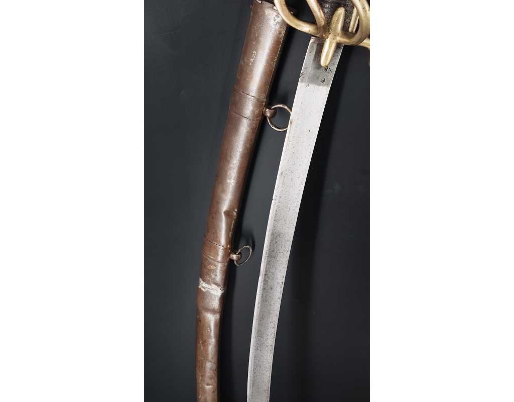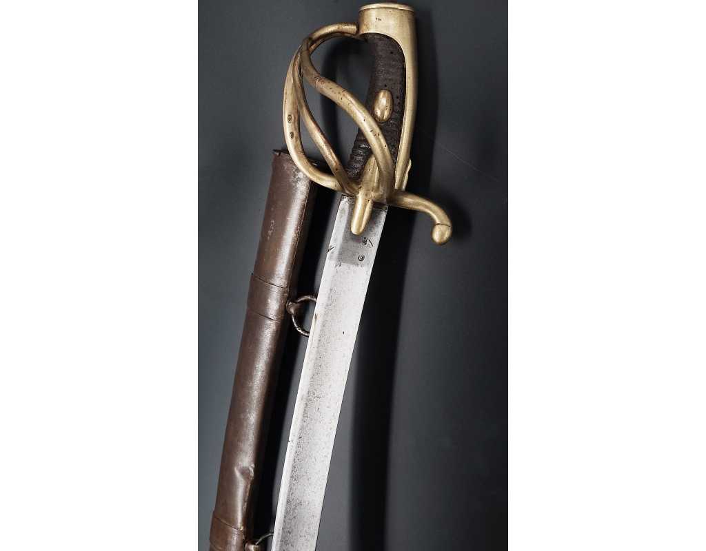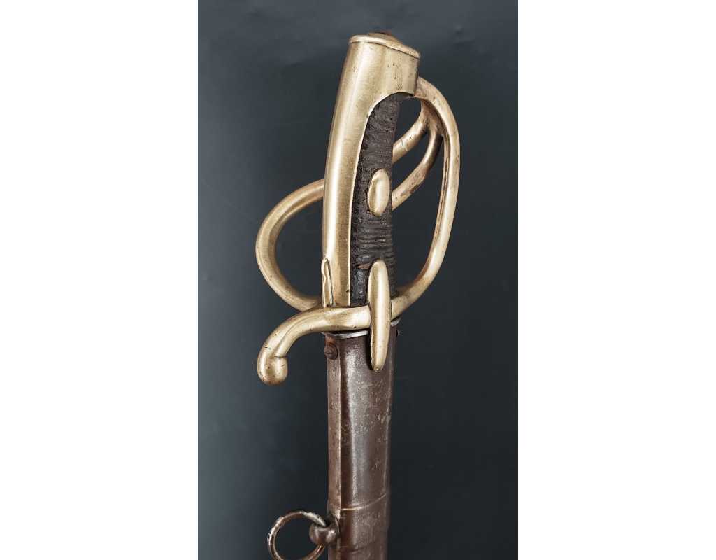 Fort et solide sabre pour la troupe de Cavalerie légère modèle An IX avec son bon fourreau du premier modèle, époque Consulat puis premier Empire. Garde en laiton multi-branches dont la principale poinçonnée des même contrôleurs que sur le talon de la lame J.J Mouton contrôleur 1ère classe de juillet 1798 à février 1809 et de Simon Beaumaretz 1803-1807, calotte à longue queue à bouton de rivure intact et sans jeu à la monture, fusée recouverte de basane peu usagée et de deux demi olive, craquelure sur les branches secondaires sans fragilisation.  Lame à dos et fort pan creux marquée "Manufacture Nationale du Klingenthal Coulaux Frères Entrepreneurs", longue de 88.5cm, fines traces d'oxydation. Fourreau léger en tôle de fer patiné gris avec multiples réparations d'usage, deux large bracelet et anneaux de bélière.