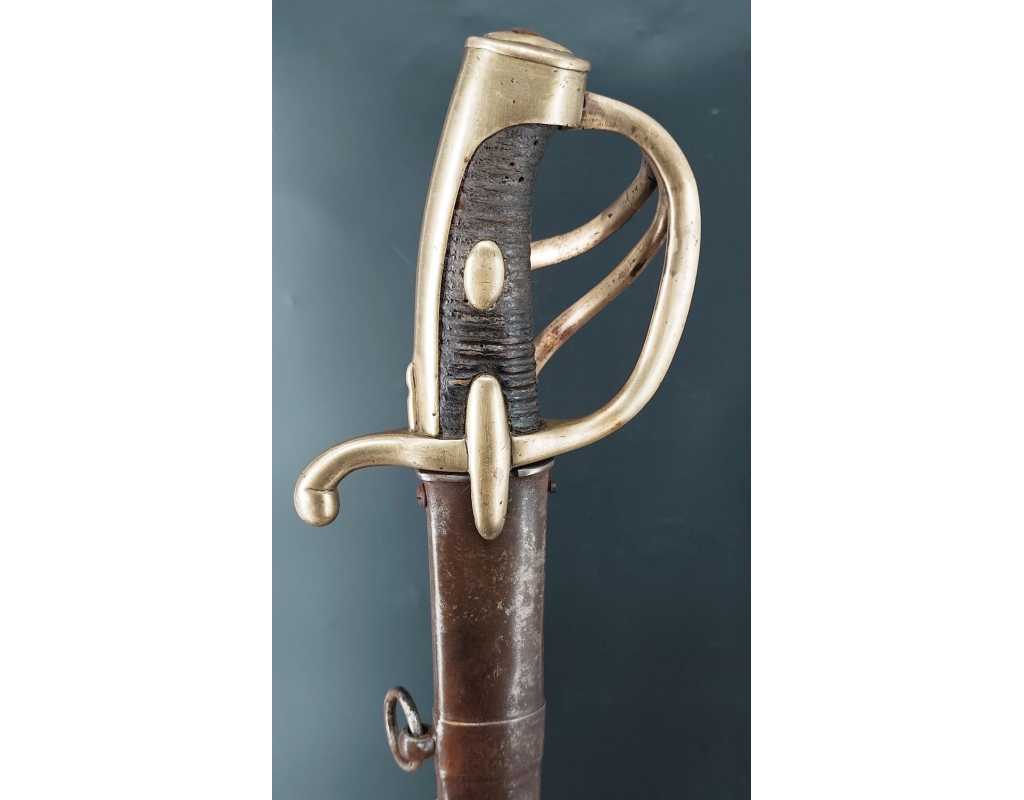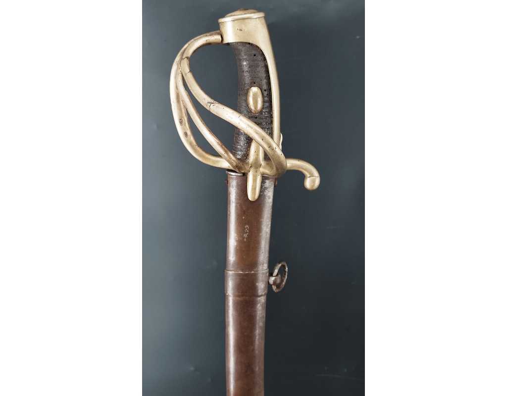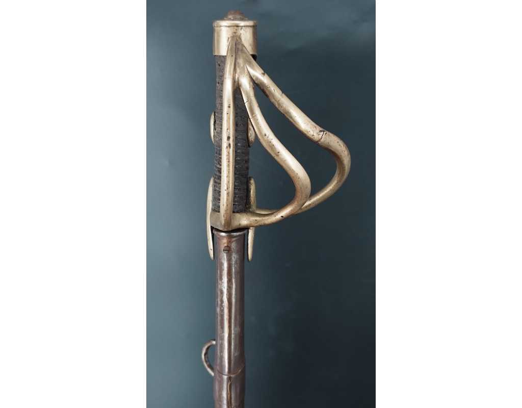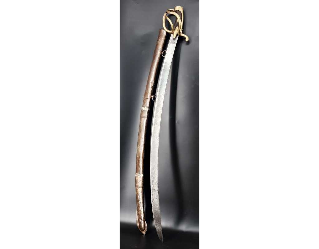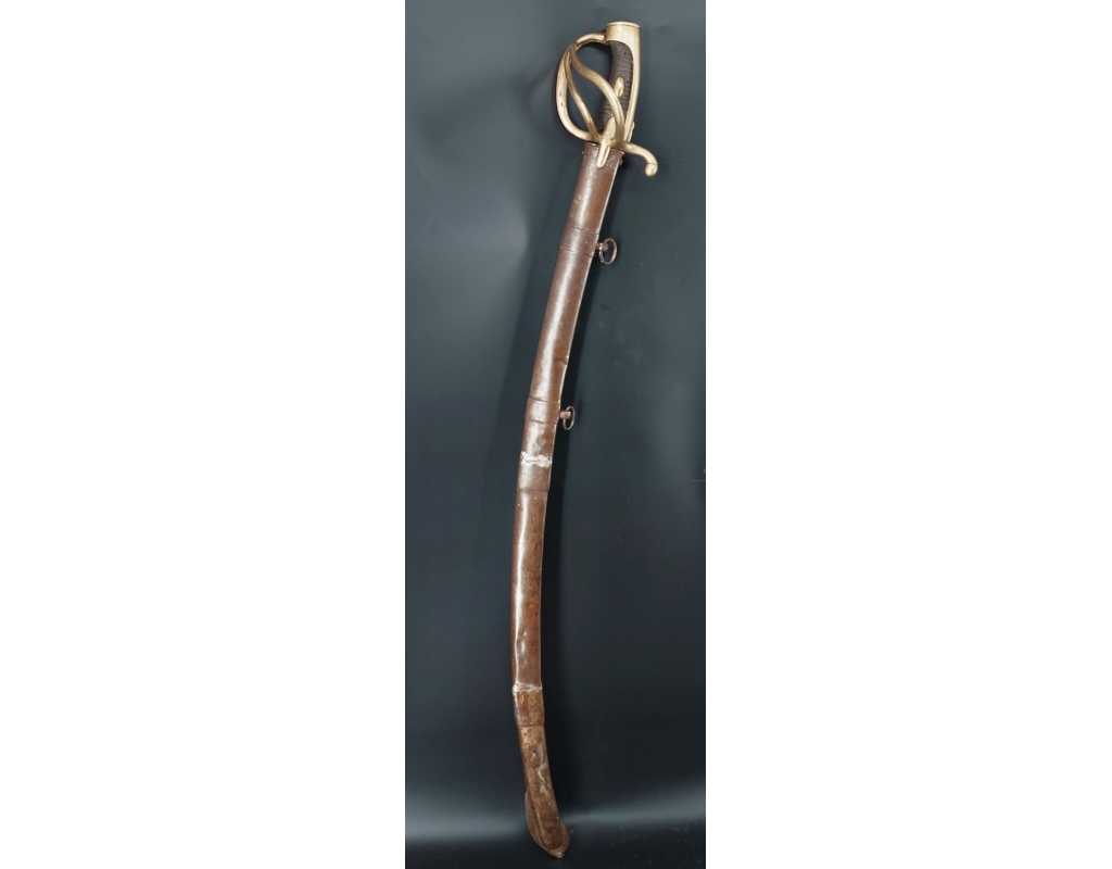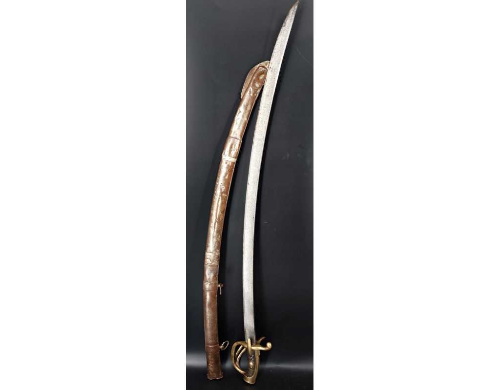 Fort et solide sabre pour la troupe de Cavalerie légère modèle An IX avec son bon fourreau du premier modèle, époque Consulat puis premier Empire. Garde en laiton multi-branches dont la principale poinçonnée des même contrôleurs que sur le talon de la lame J.J Mouton contrôleur 1ère classe de juillet 1798 à février 1809 et de Simon Beaumaretz 1803-1807, calotte à longue queue à bouton de rivure intact et sans jeu à la monture, fusée recouverte de basane peu usagée et de deux demi olive, craquelure sur les branches secondaires sans fragilisation.  Lame à dos et fort pan creux marquée "Manufacture Nationale du Klingenthal Coulaux Frères Entrepreneurs", longue de 88.5cm, fines traces d'oxydation. Fourreau léger en tôle de fer patiné gris avec multiples réparations d'usage, deux large bracelet et anneaux de bélière.