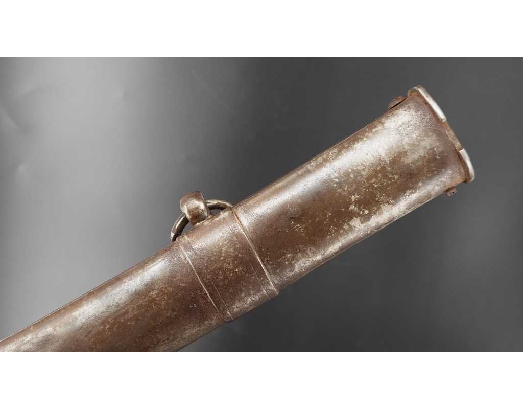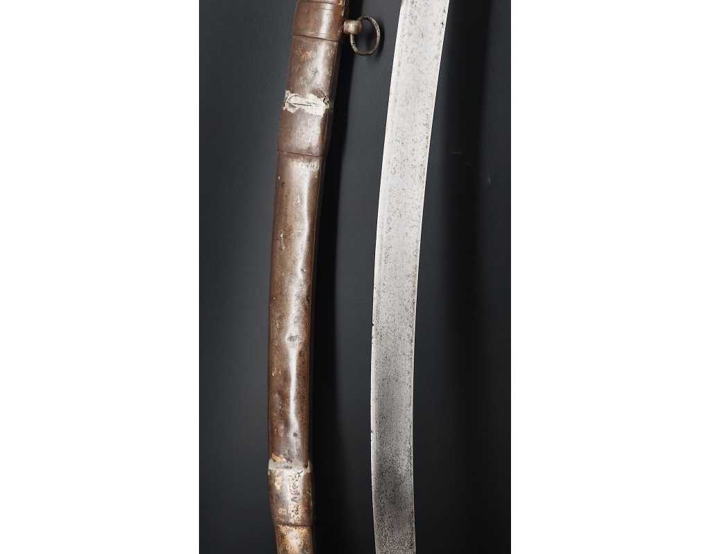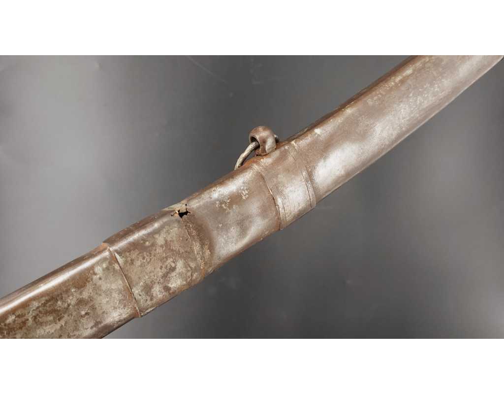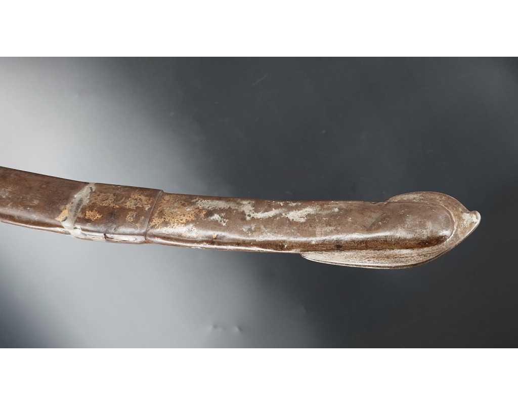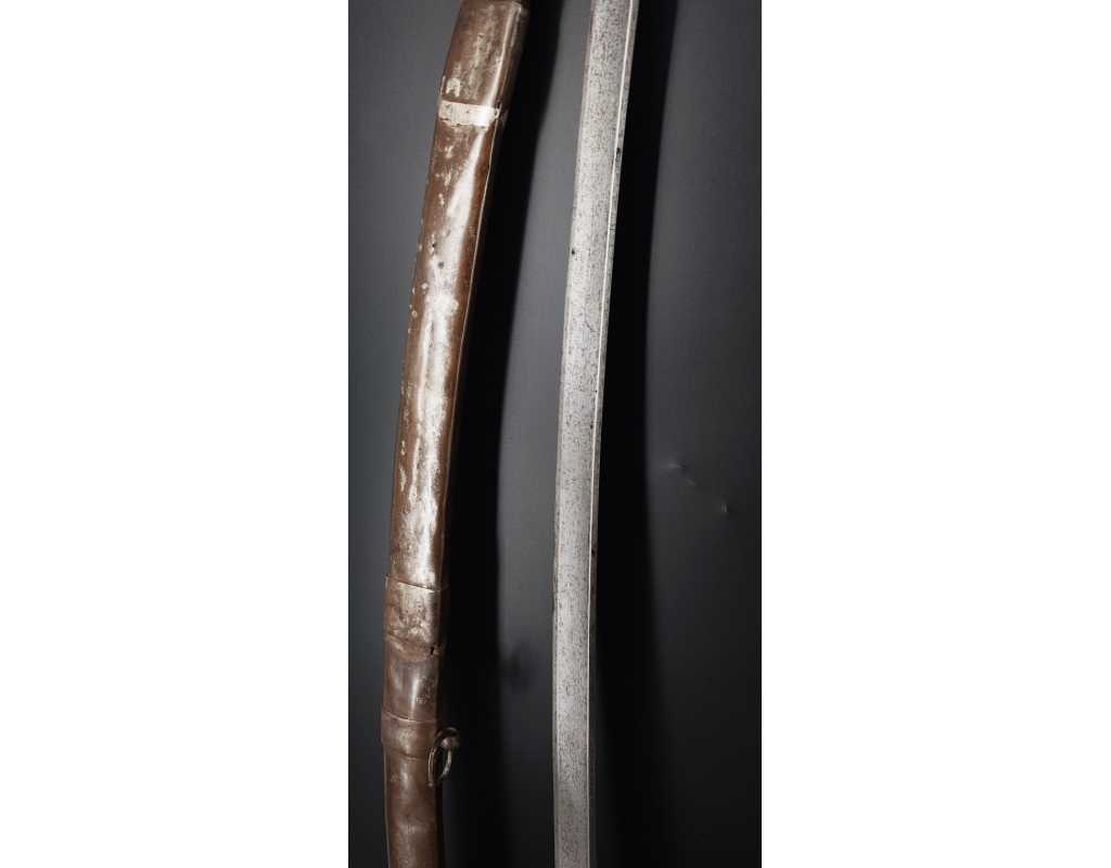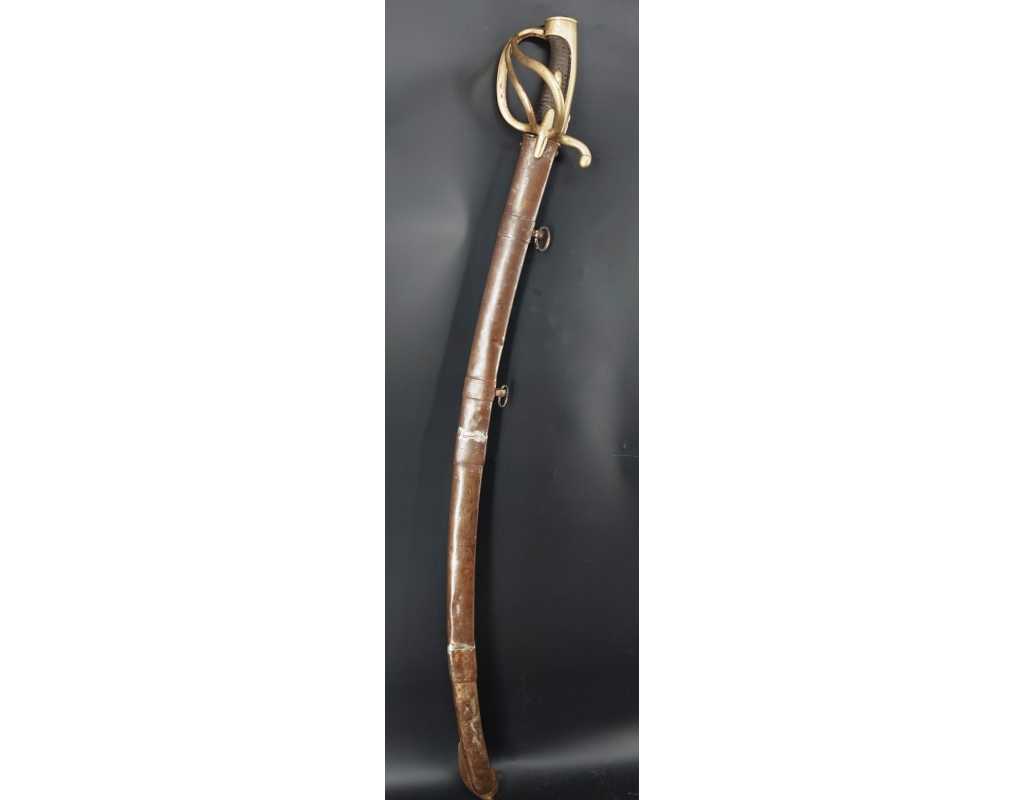 Fort et solide sabre pour la troupe de Cavalerie légère modèle An IX avec son bon fourreau du premier modèle, époque Consulat puis premier Empire. Garde en laiton multi-branches dont la principale poinçonnée des même contrôleurs que sur le talon de la lame J.J Mouton contrôleur 1ère classe de juillet 1798 à février 1809 et de Simon Beaumaretz 1803-1807, calotte à longue queue à bouton de rivure intact et sans jeu à la monture, fusée recouverte de basane peu usagée et de deux demi olive, craquelure sur les branches secondaires sans fragilisation.  Lame à dos et fort pan creux marquée "Manufacture Nationale du Klingenthal Coulaux Frères Entrepreneurs", longue de 88.5cm, fines traces d'oxydation. Fourreau léger en tôle de fer patiné gris avec multiples réparations d'usage, deux large bracelet et anneaux de bélière.