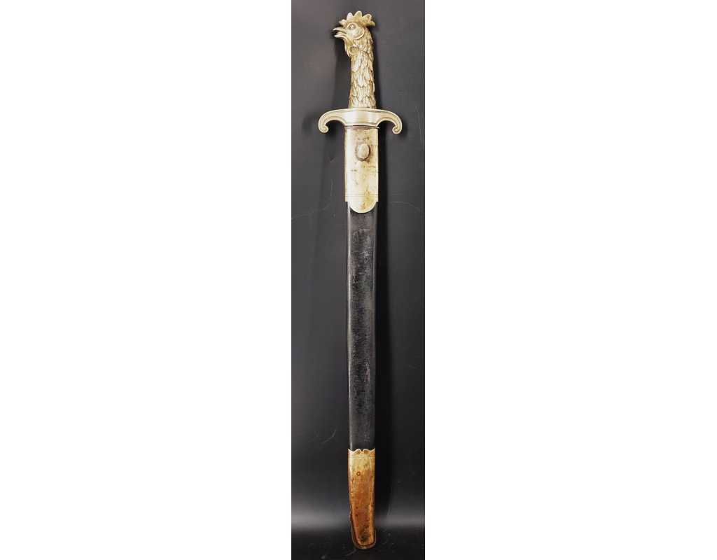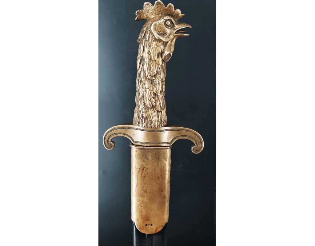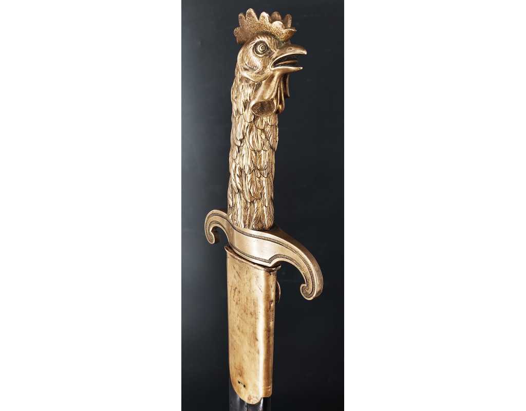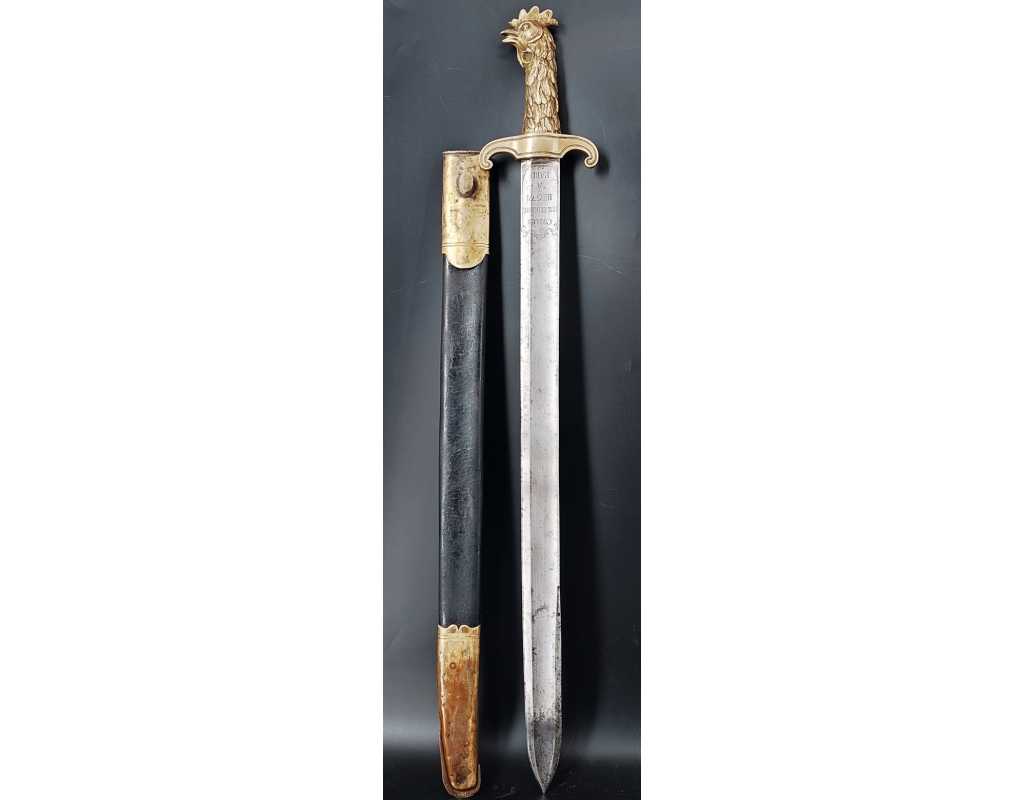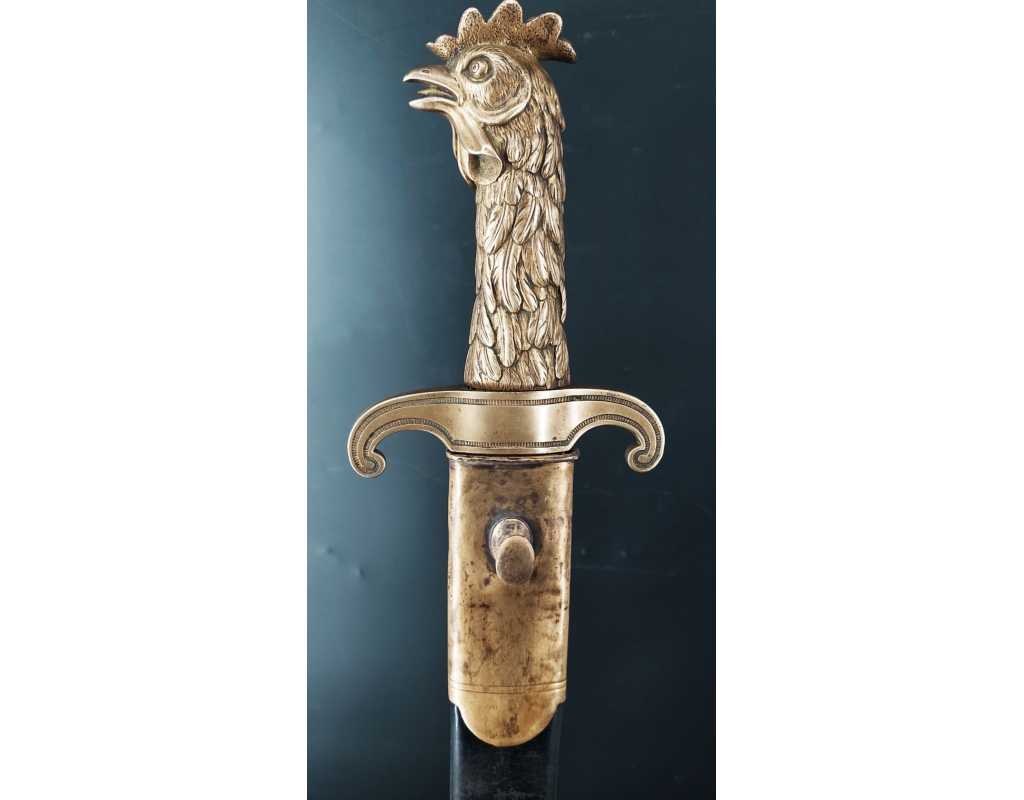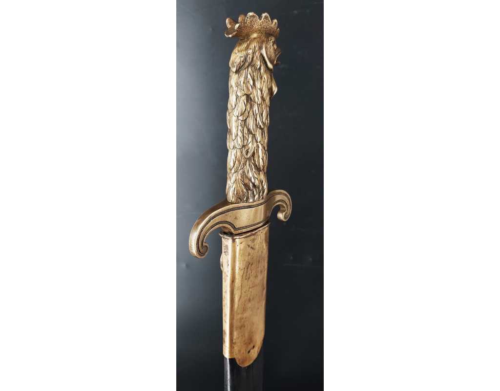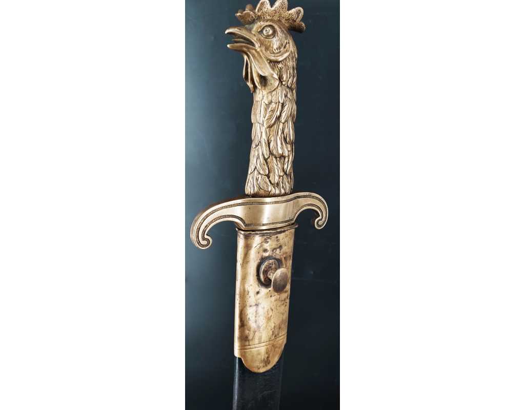 Monture en laiton fondu ciselé et anciennement doré en forme de cou et tête de coq. Croisière plate symétrique, soulignée d'un filet gravé. Lame droite, à dos et pans-creux, de 67,50 cm sur 4,4 cm de talon, épaisseur 0,9 cm, contre-tranchant.