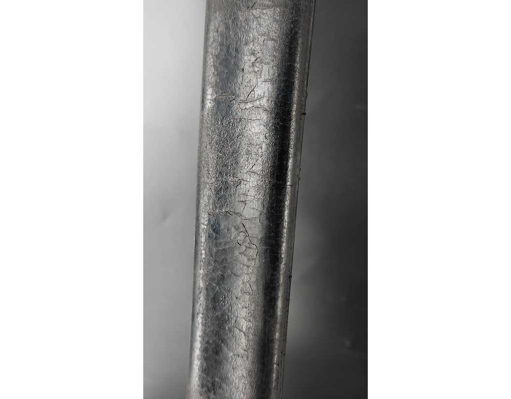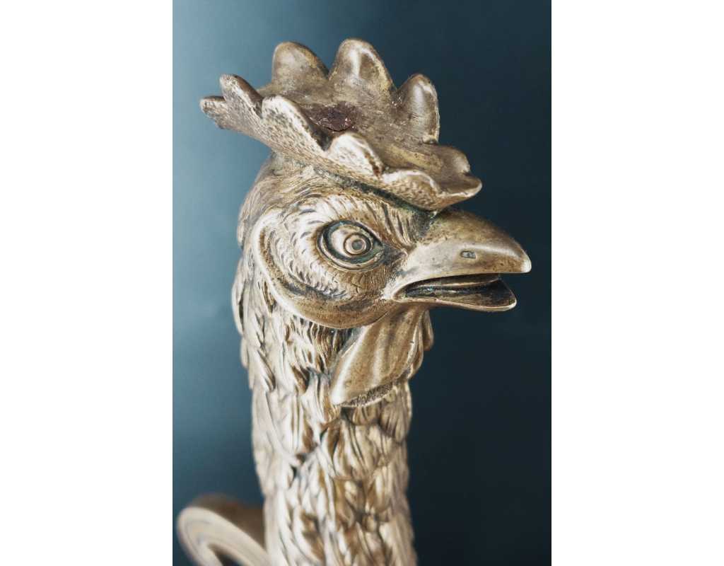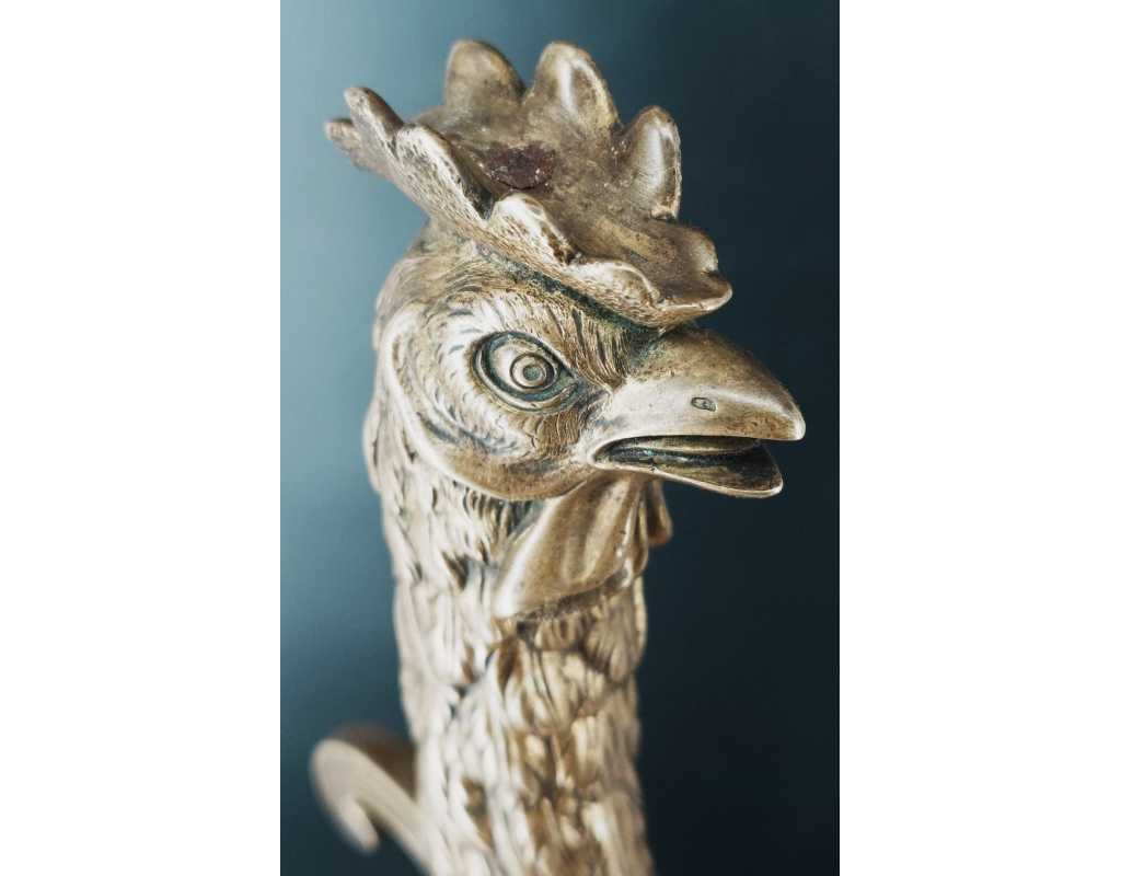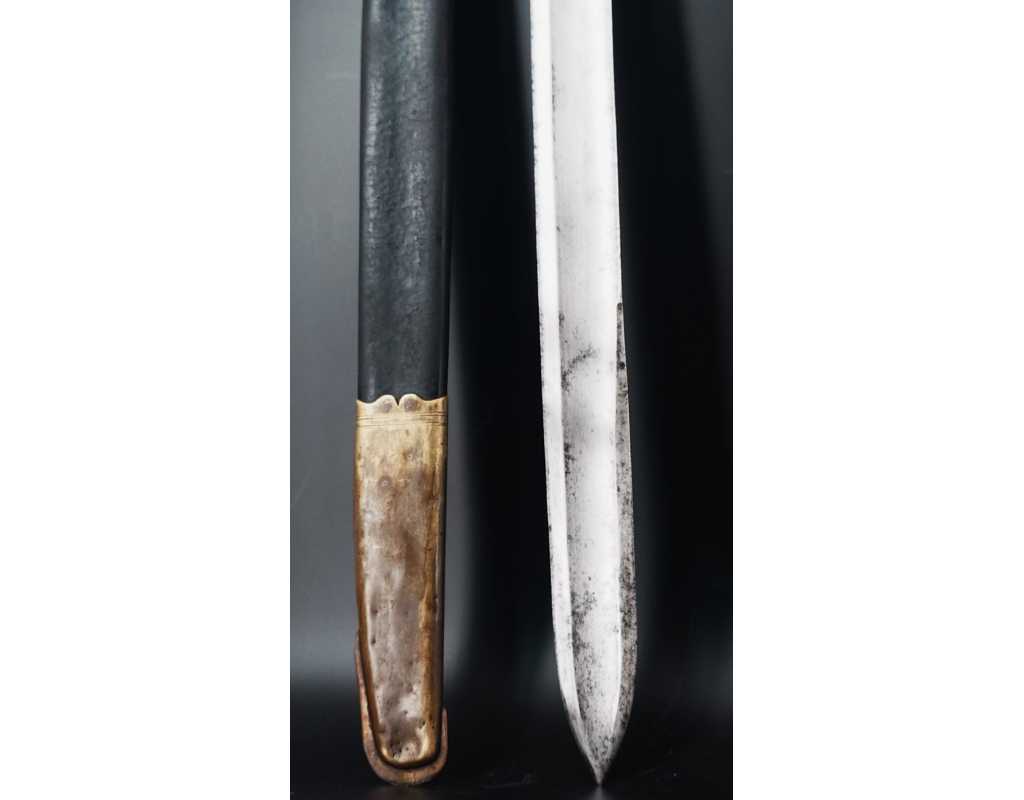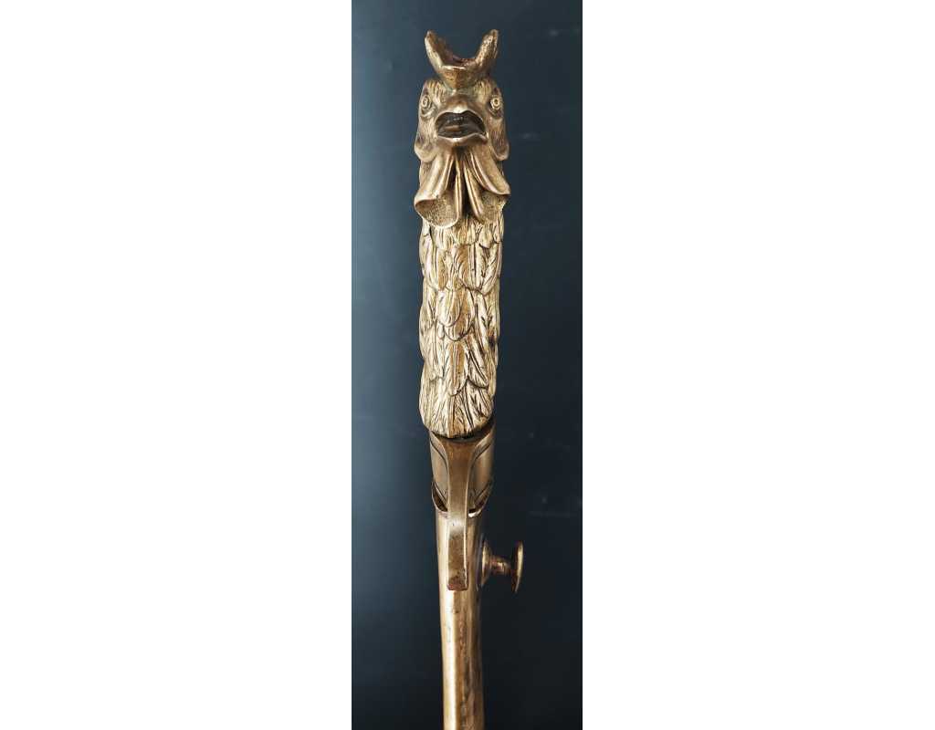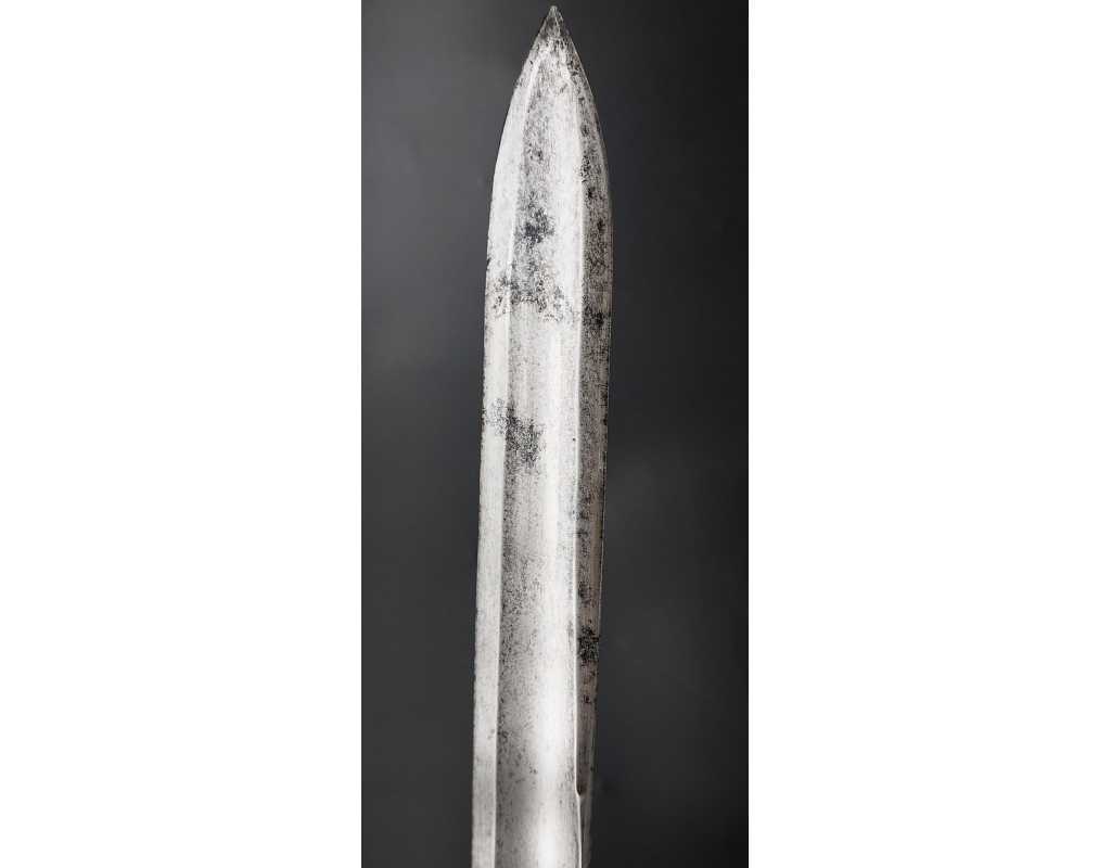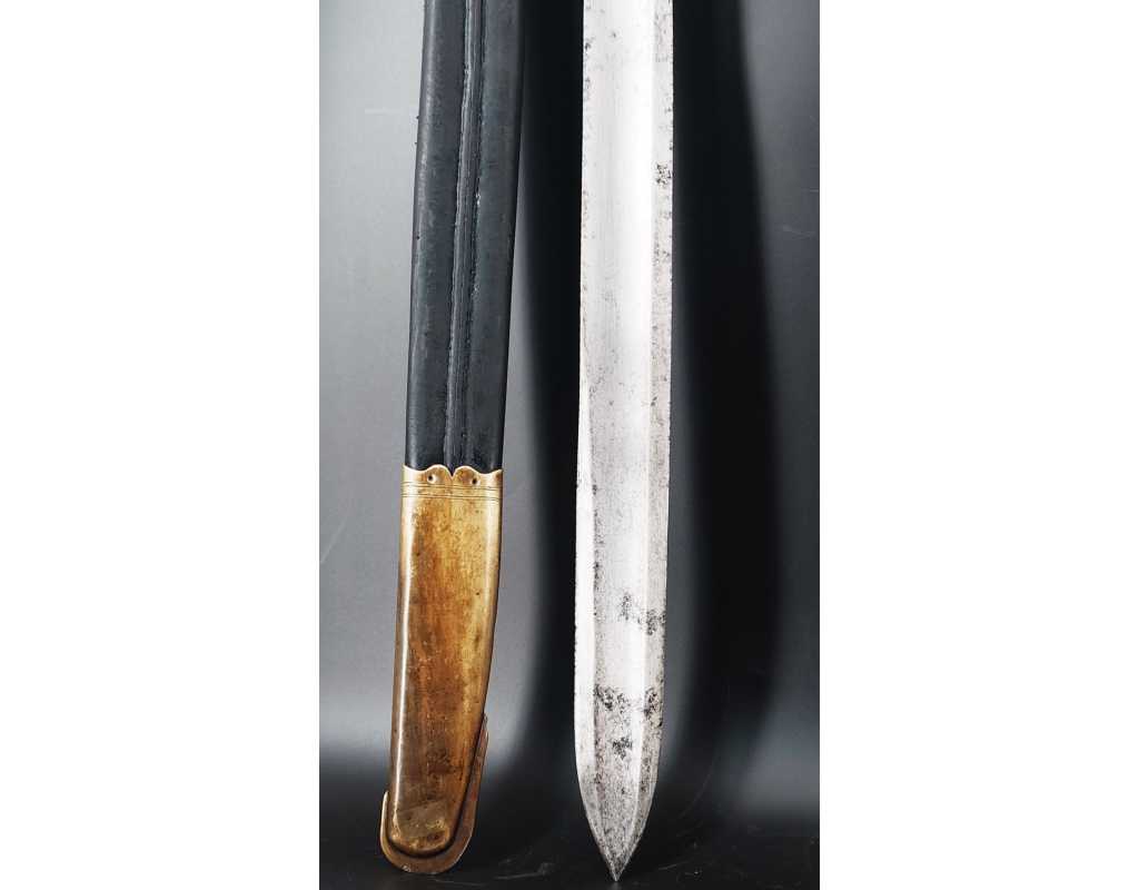 Monture en laiton fondu ciselé et anciennement doré en forme de cou et tête de coq. Croisière plate symétrique, soulignée d'un filet gravé. Lame droite, à dos et pans-creux, de 67,50 cm sur 4,4 cm de talon, épaisseur 0,9 cm, contre-tranchant.