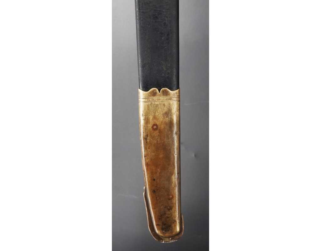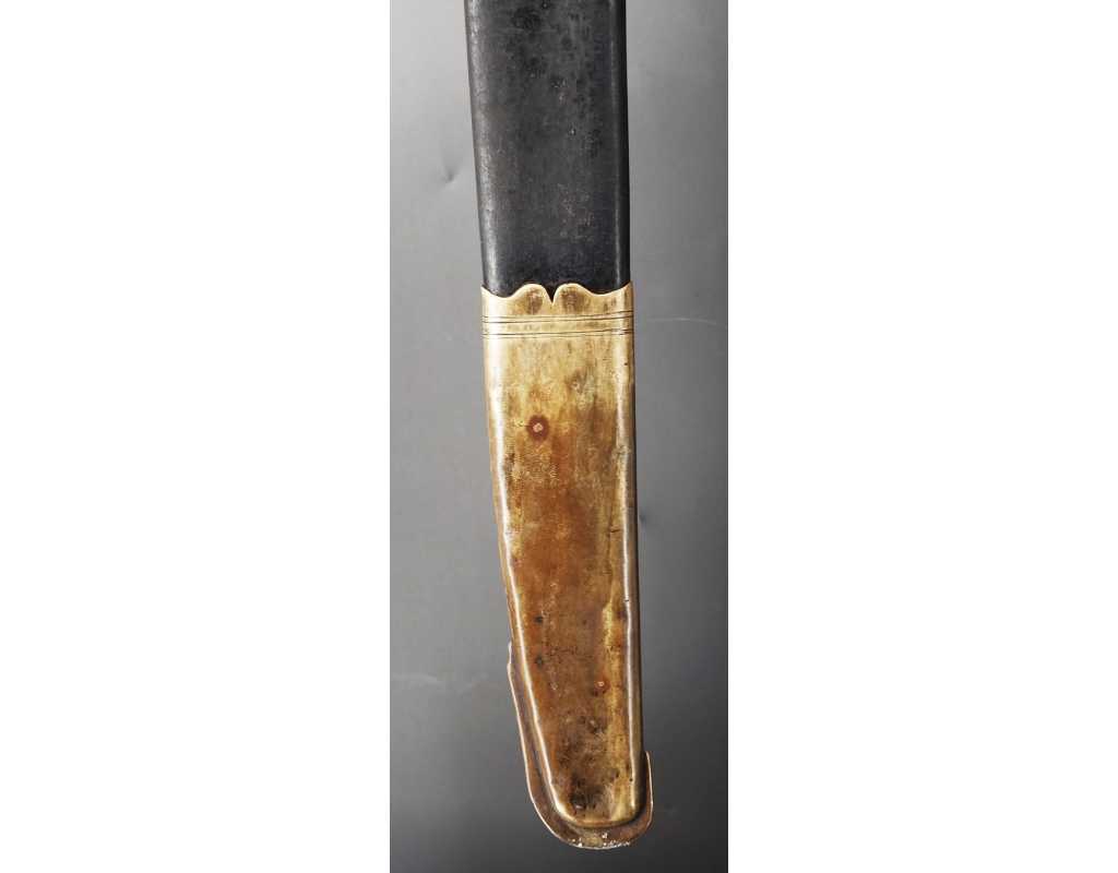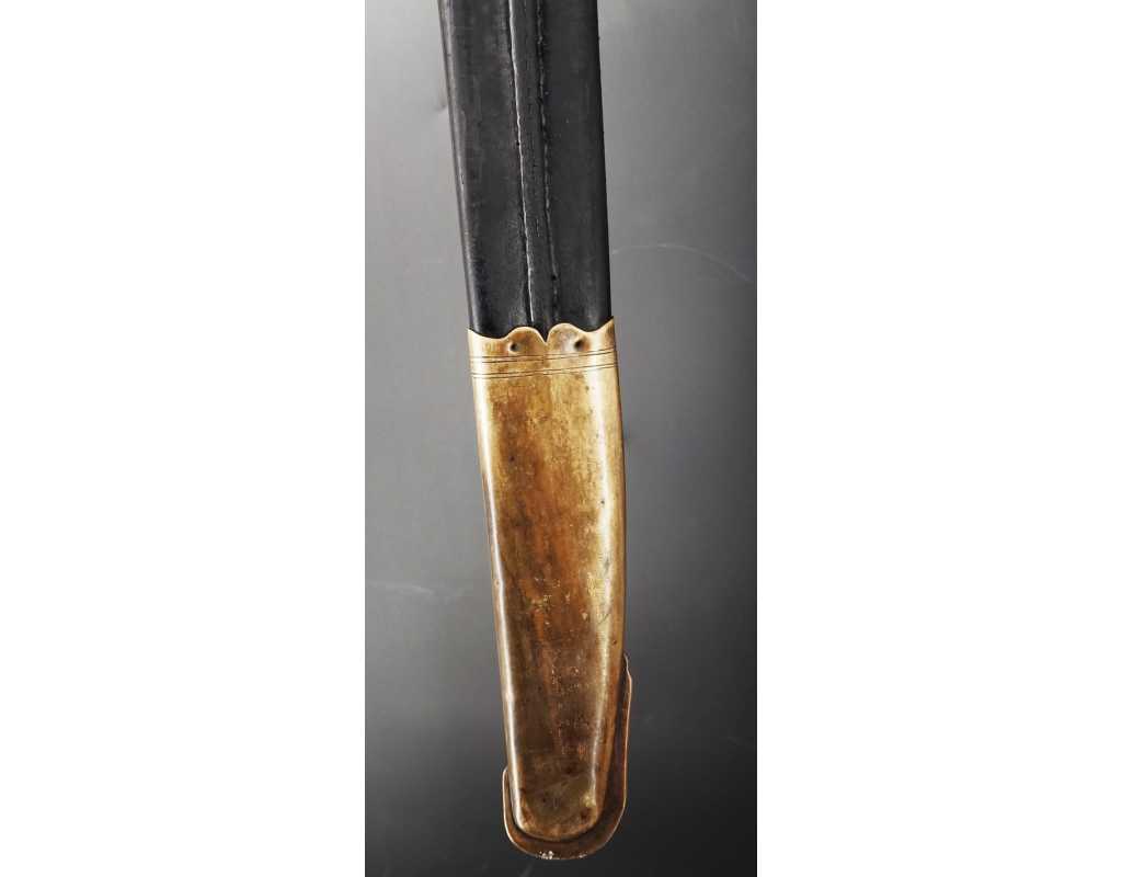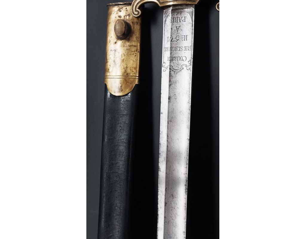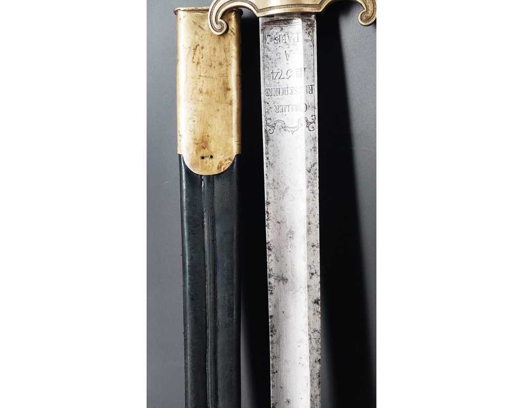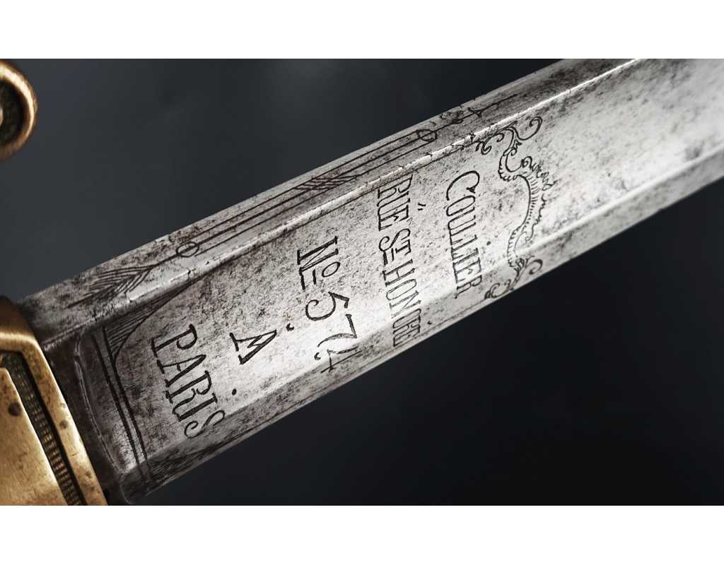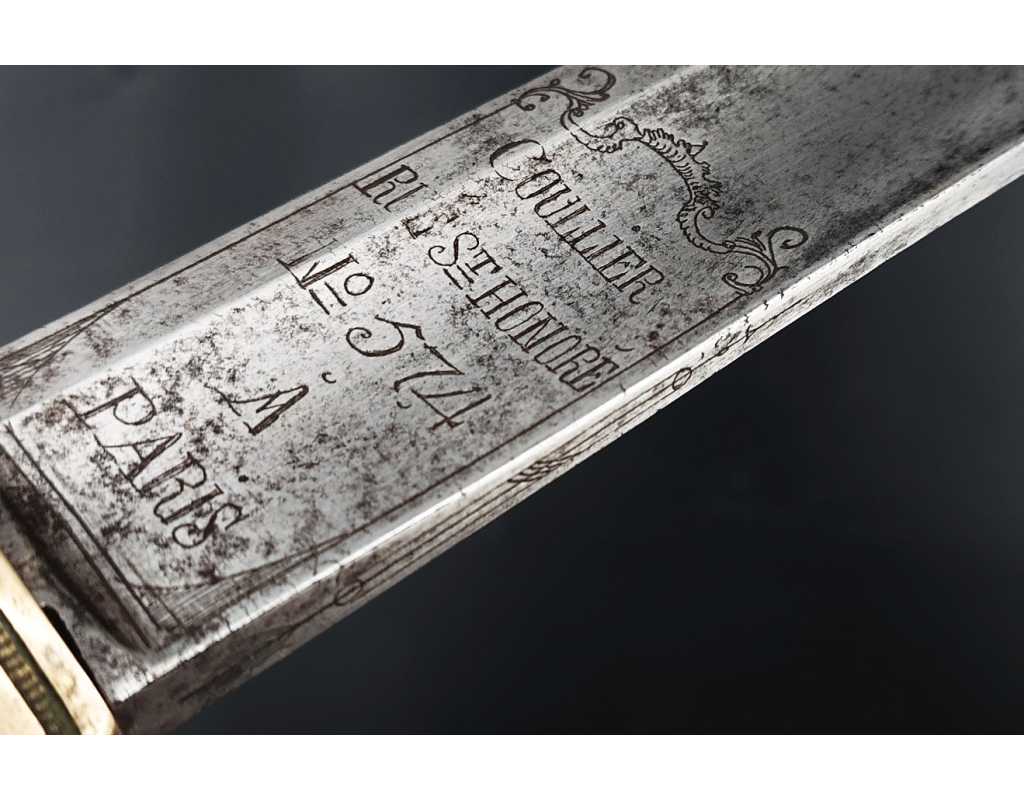 Le talon est orné d'un cartouche inscrit en capitales de «COULLIER. RUE St HONORÉ N° 574 À PARIS». Fourreau en cuir parfaitement reconstitué à deux garnitures en laiton dans une belle patine.