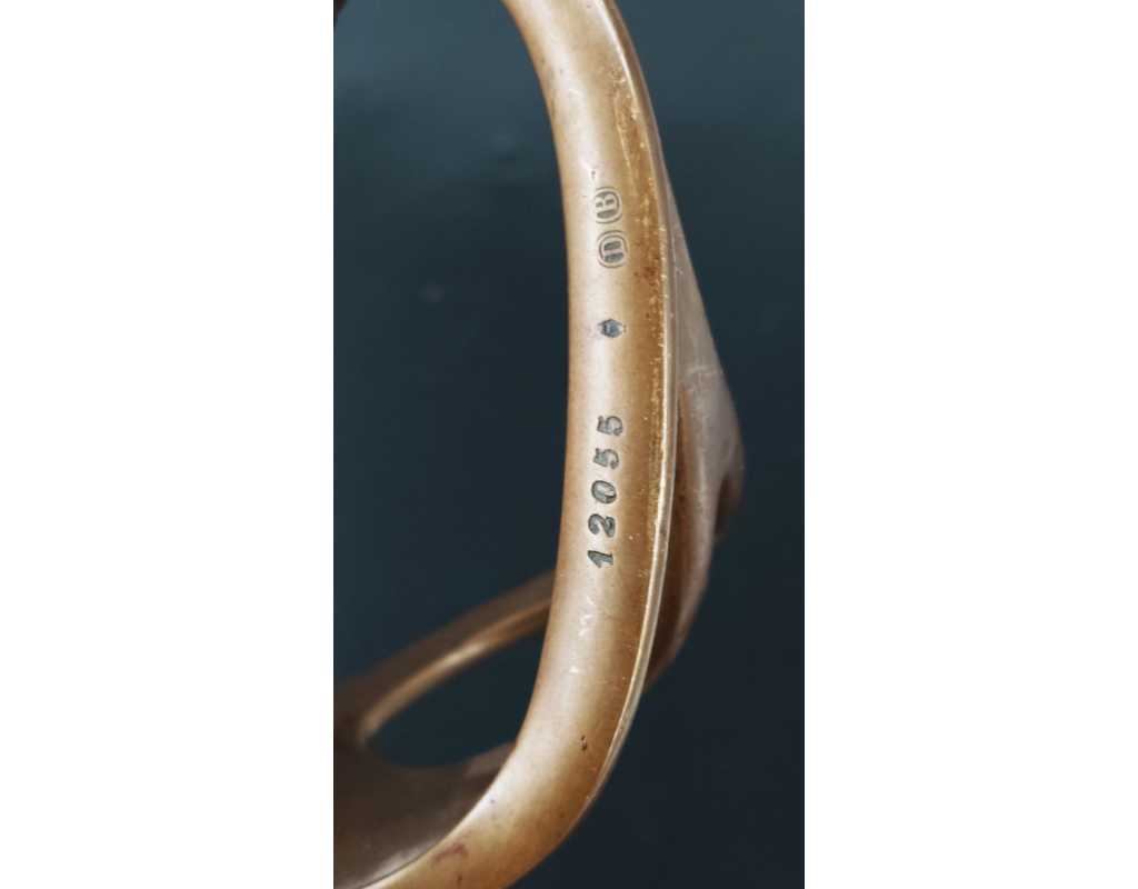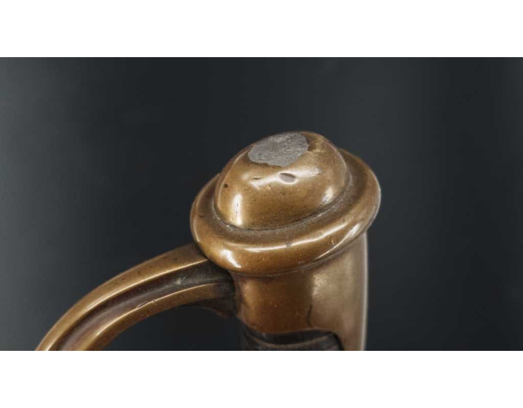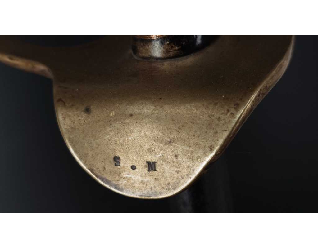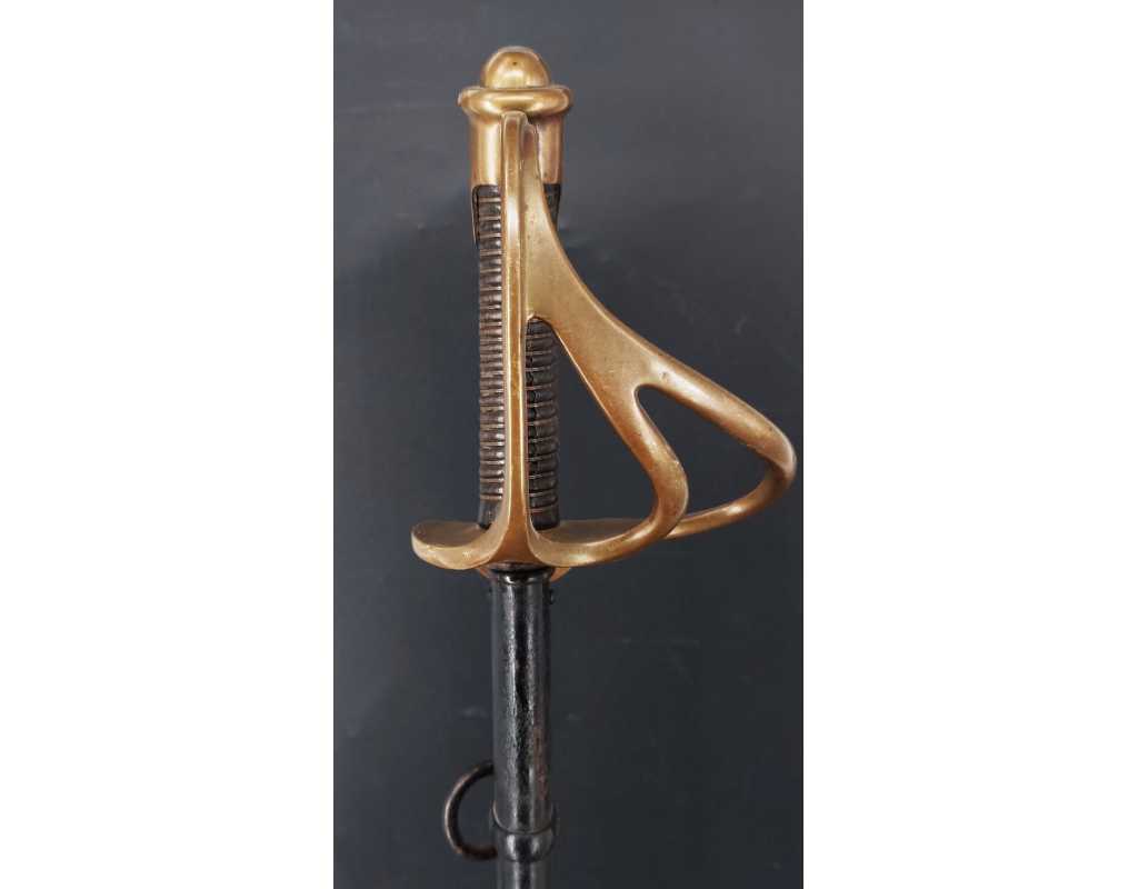Sabre de cavalerie Dragon modèle 1882 produit par la Manufacture d'armes de Châtellerault en octobre 1886. Monture en laiton rosé (cuivreux) calotte courte à dôme de rivure à l'étain, fusée bois reverte de chagrin filigrané de cuivre fin, branche principale poinçonnée et numérotée, quillon recourbé frappé S.M., aucun jeu d'assemblage. Lame droite à forte gouttière, dos plat signé, longueur 925mm sans oxydation, légères traces d'aiguisage. Fourreau en tôle de fer laqué noir pour le camouflage, bracelet portant le même numéro que la garde, cravate en cuir d'origine. Longueur totale 111cm.