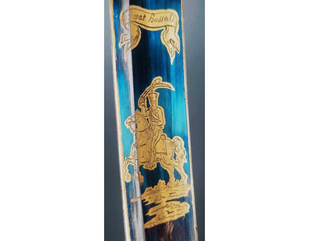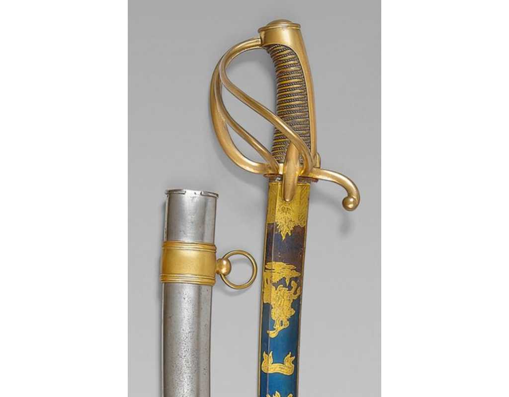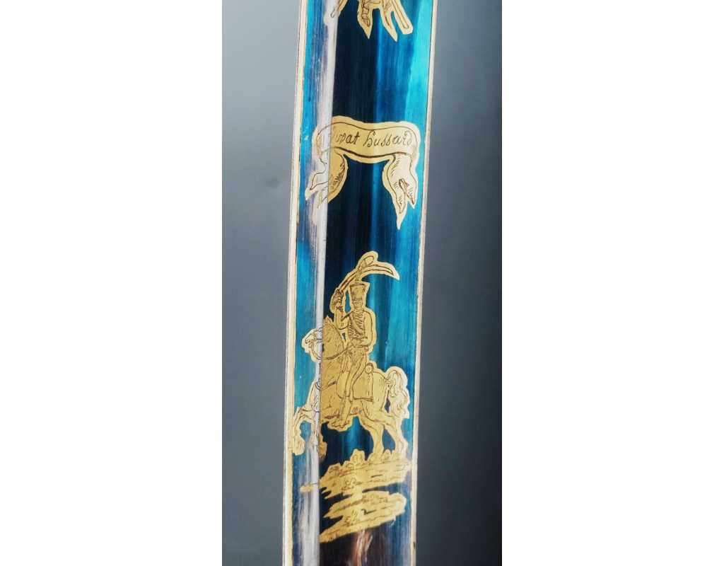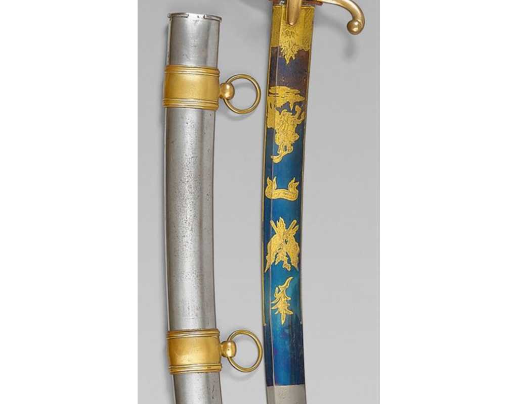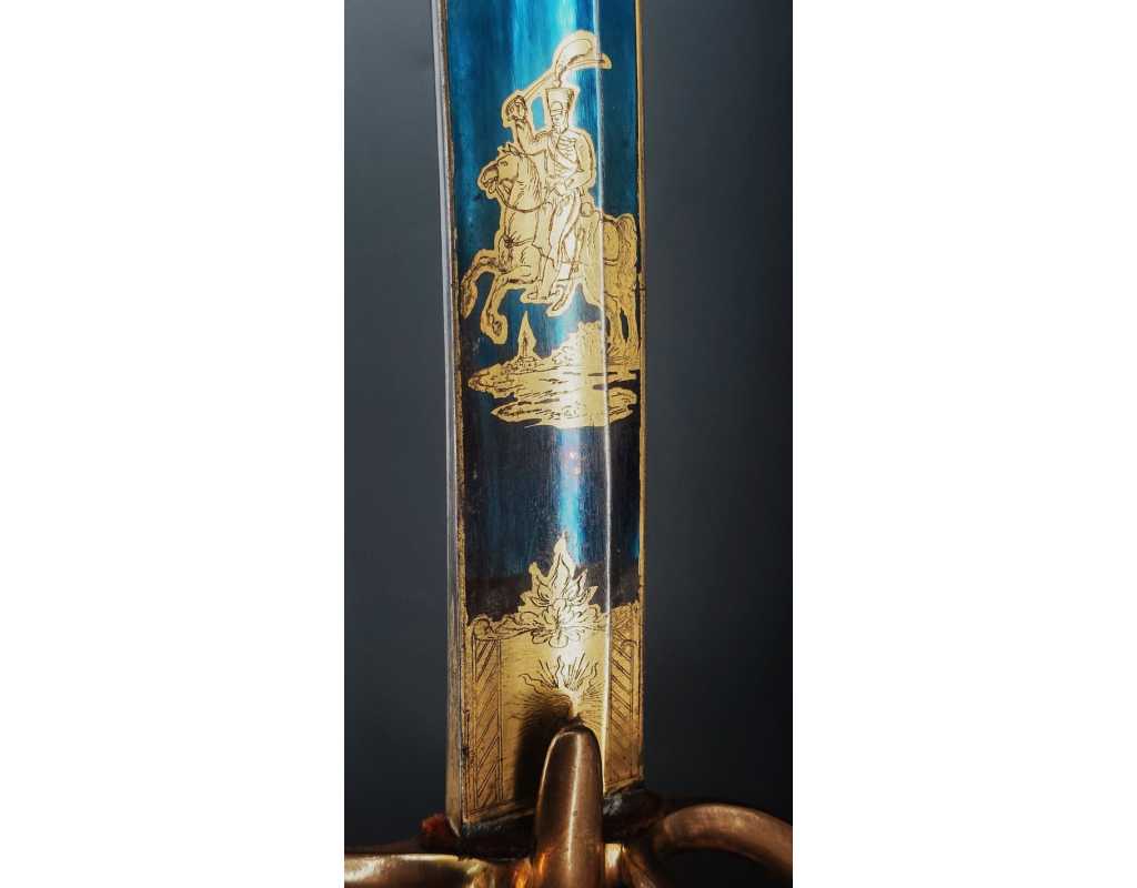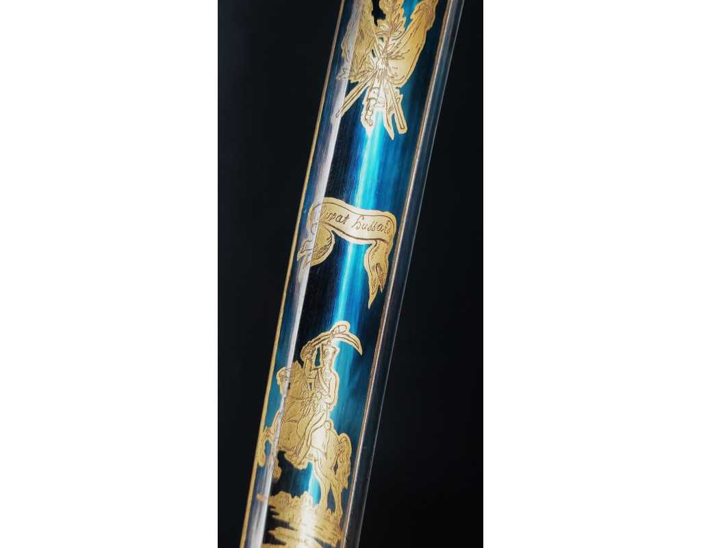 Monture en laiton doré, garde à la chasseur à trois branches unies en laiton doré du modèle de l'An IX, fusée de bois recouverte de cuir filigranée, calotte à longue queue renforcée à sa base, croisière à double oreillons terminée par un quillon recourbé en forme de boule. Forte lame de 86cm se terminant en langue de carpe, hameçon formé sur le contre tranchant, belle coloration d'origine dorée et bleuie sur la moitié, gravée sur chaque face d'un trophée, d'un hussard chargeant surmonté de la banderole "Vivat hussard", talon orné d'un soleil rayonnant, l'un des hussards porte un shako orné d'une aigle impériale. Fourreau de fer poli, à deux bracelets de bélières en laiton anciennement doré se terminant par un bourrelet, longueur 102 cm.