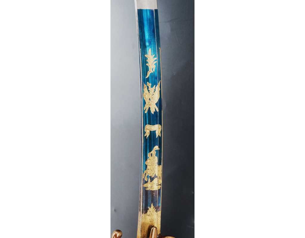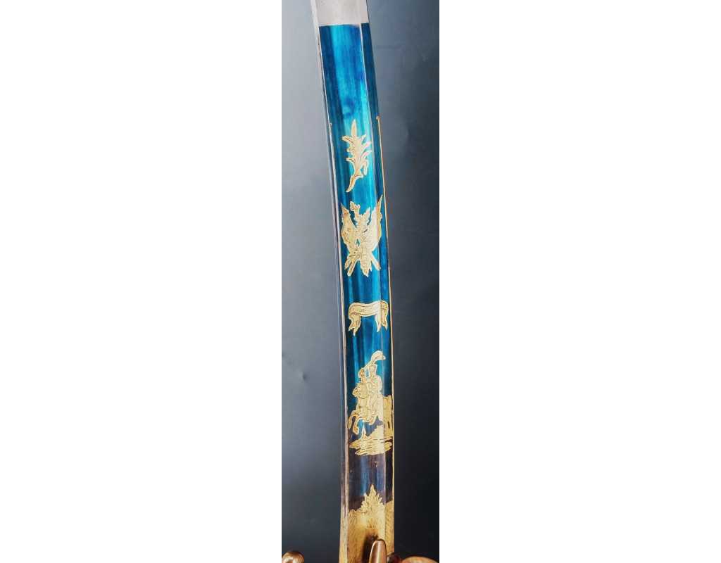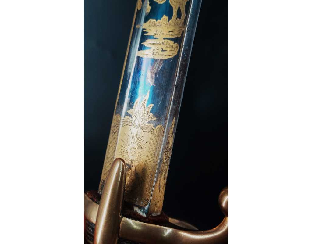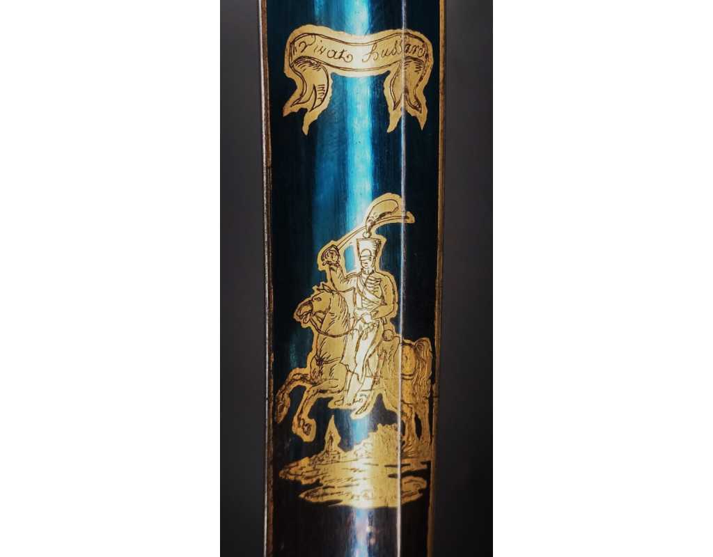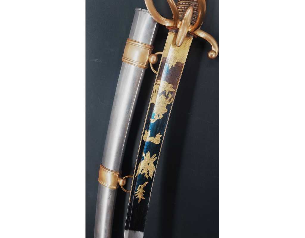Monture en laiton doré, garde à la chasseur à trois branches unies en laiton doré du modèle de l'An IX, fusée de bois recouverte de cuir filigranée, calotte à longue queue renforcée à sa base, croisière à double oreillons terminée par un quillon recourbé en forme de boule. Forte lame de 86cm se terminant en langue de carpe, hameçon formé sur le contre tranchant, belle coloration d'origine dorée et bleuie sur la moitié, gravée sur chaque face d'un trophée, d'un hussard chargeant surmonté de la banderole "Vivat hussard", talon orné d'un soleil rayonnant, l'un des hussards porte un shako orné d'une aigle impériale. Fourreau de fer poli, à deux bracelets de bélières en laiton anciennement doré se terminant par un bourrelet, longueur 102 cm.
