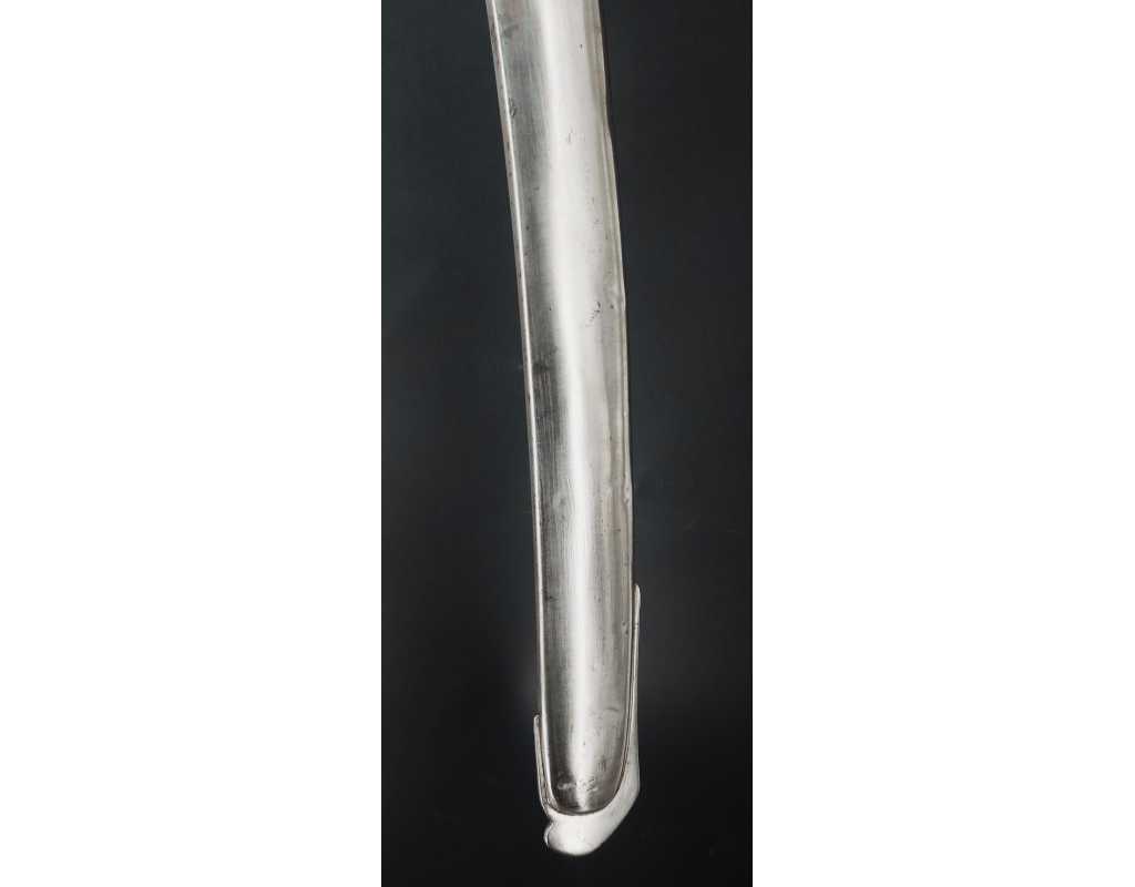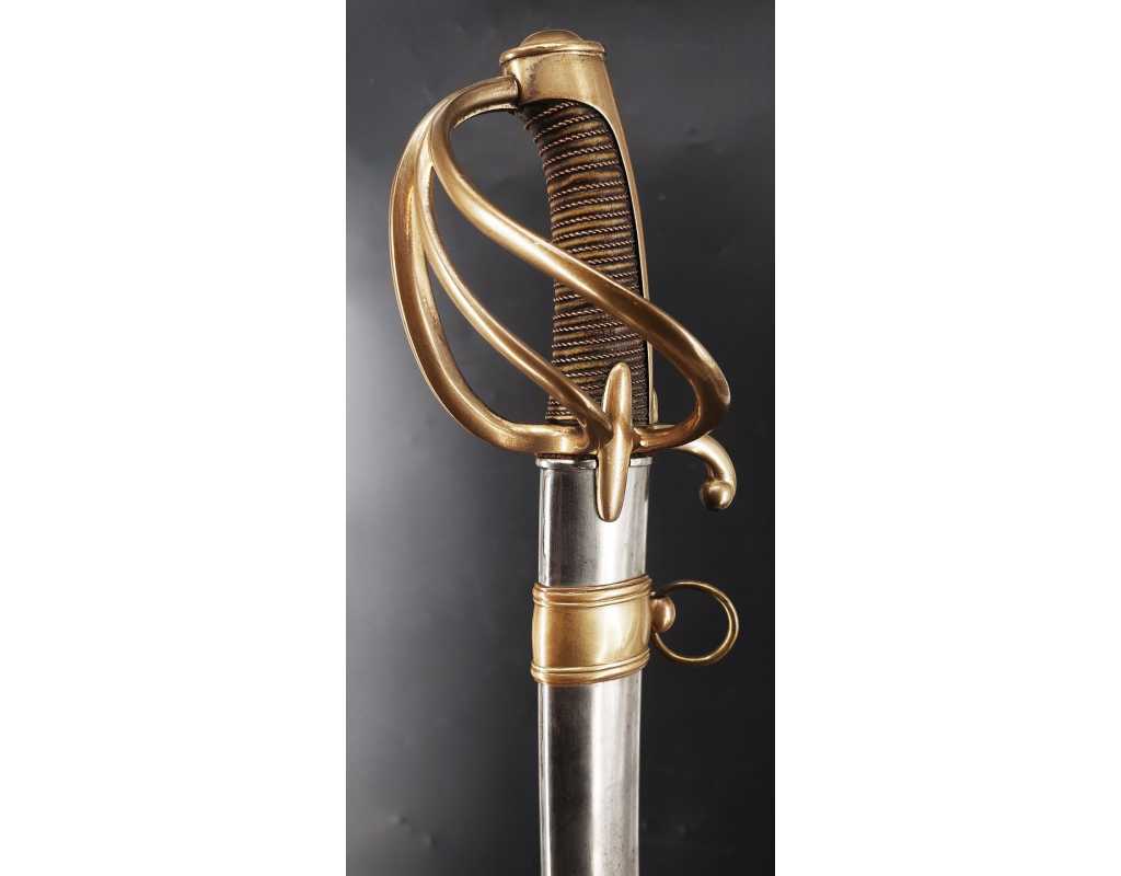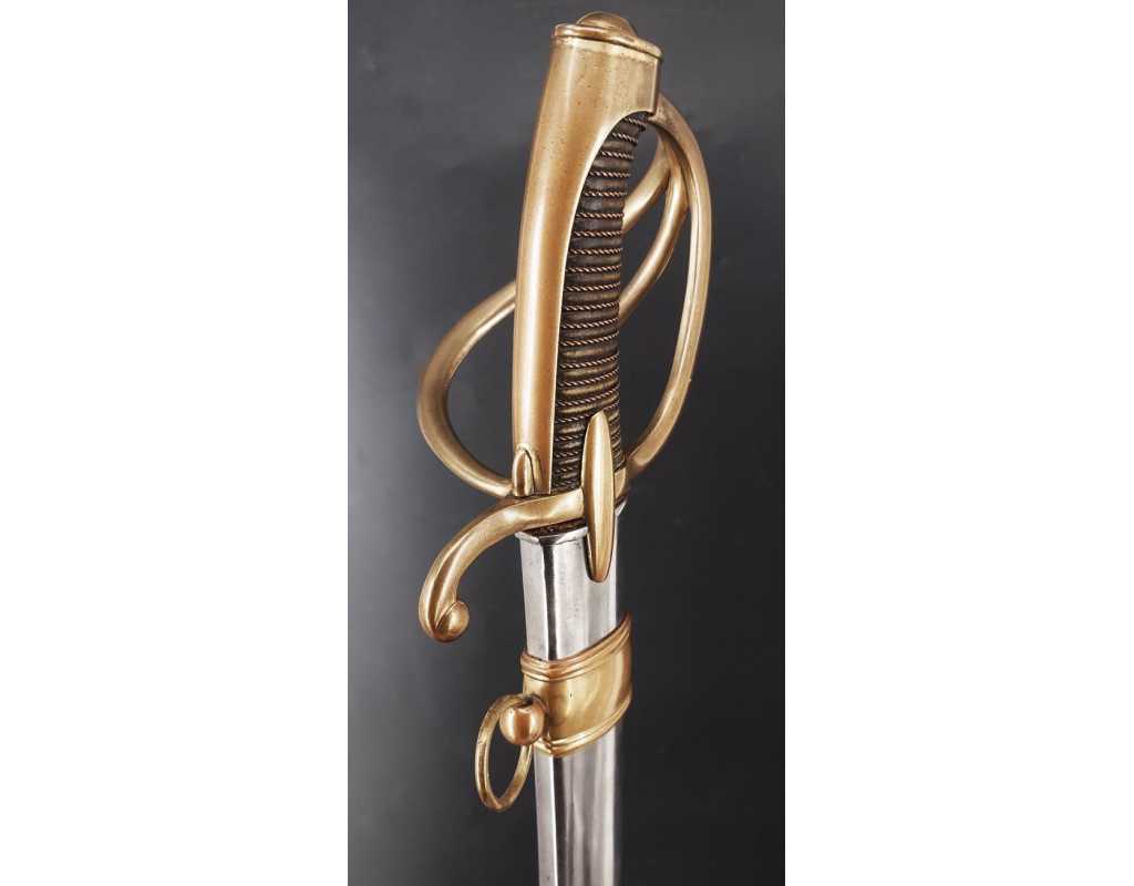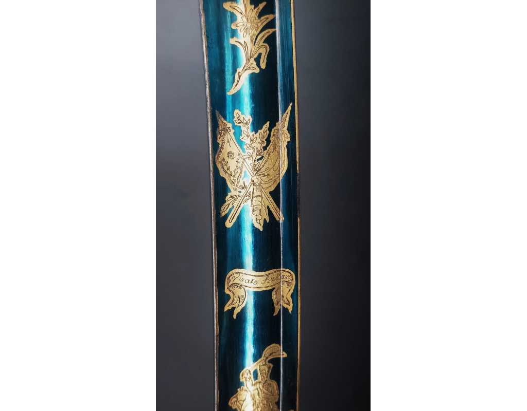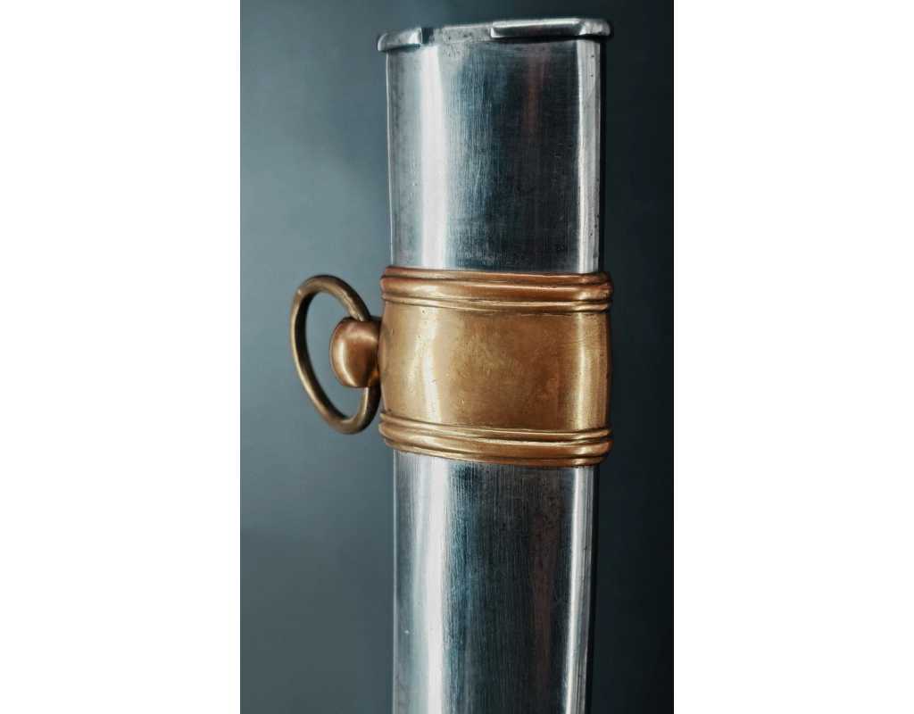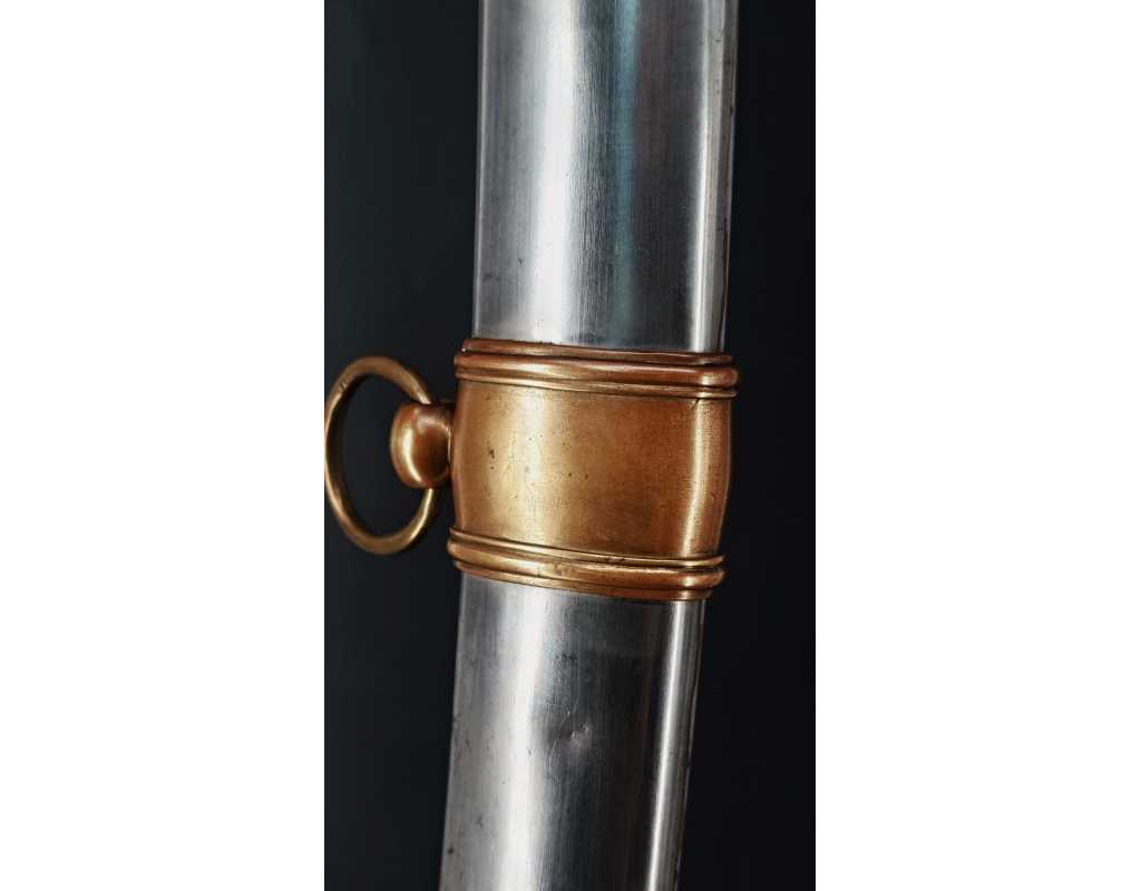 Monture en laiton doré, garde à la chasseur à trois branches unies en laiton doré du modèle de l'An IX, fusée de bois recouverte de cuir filigranée, calotte à longue queue renforcée à sa base, croisière à double oreillons terminée par un quillon recourbé en forme de boule. Forte lame de 86cm se terminant en langue de carpe, hameçon formé sur le contre tranchant, belle coloration d'origine dorée et bleuie sur la moitié, gravée sur chaque face d'un trophée, d'un hussard chargeant surmonté de la banderole "Vivat hussard", talon orné d'un soleil rayonnant, l'un des hussards porte un shako orné d'une aigle impériale. Fourreau de fer poli, à deux bracelets de bélières en laiton anciennement doré se terminant par un bourrelet, longueur 102 cm.