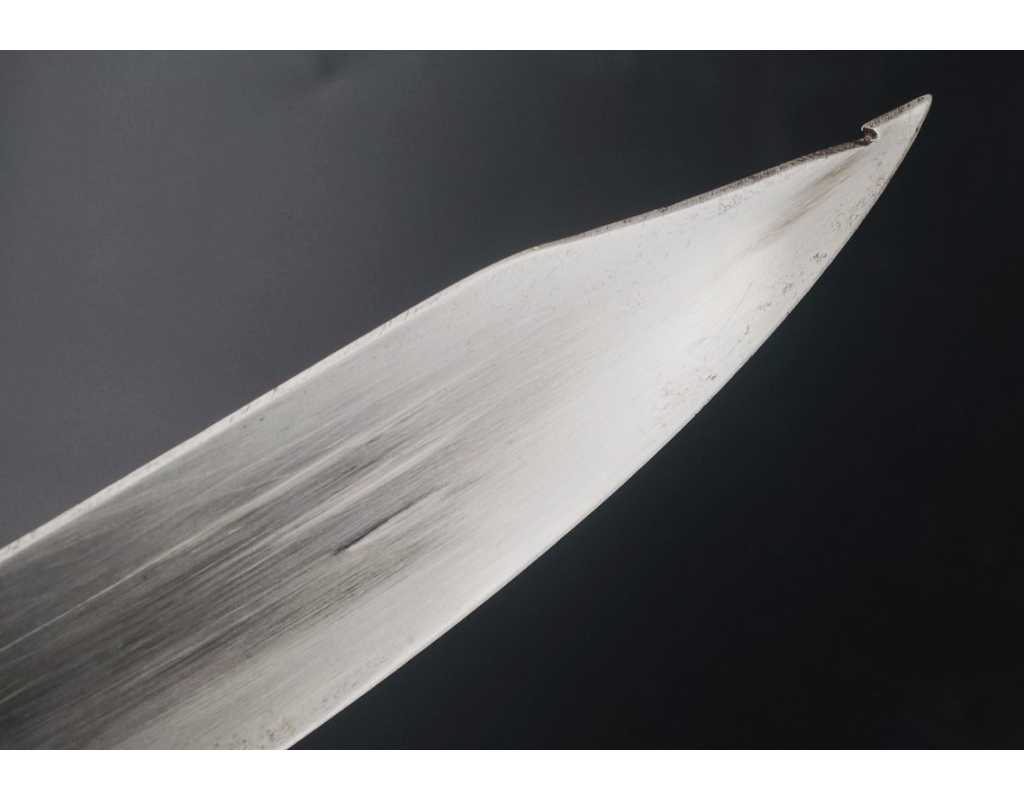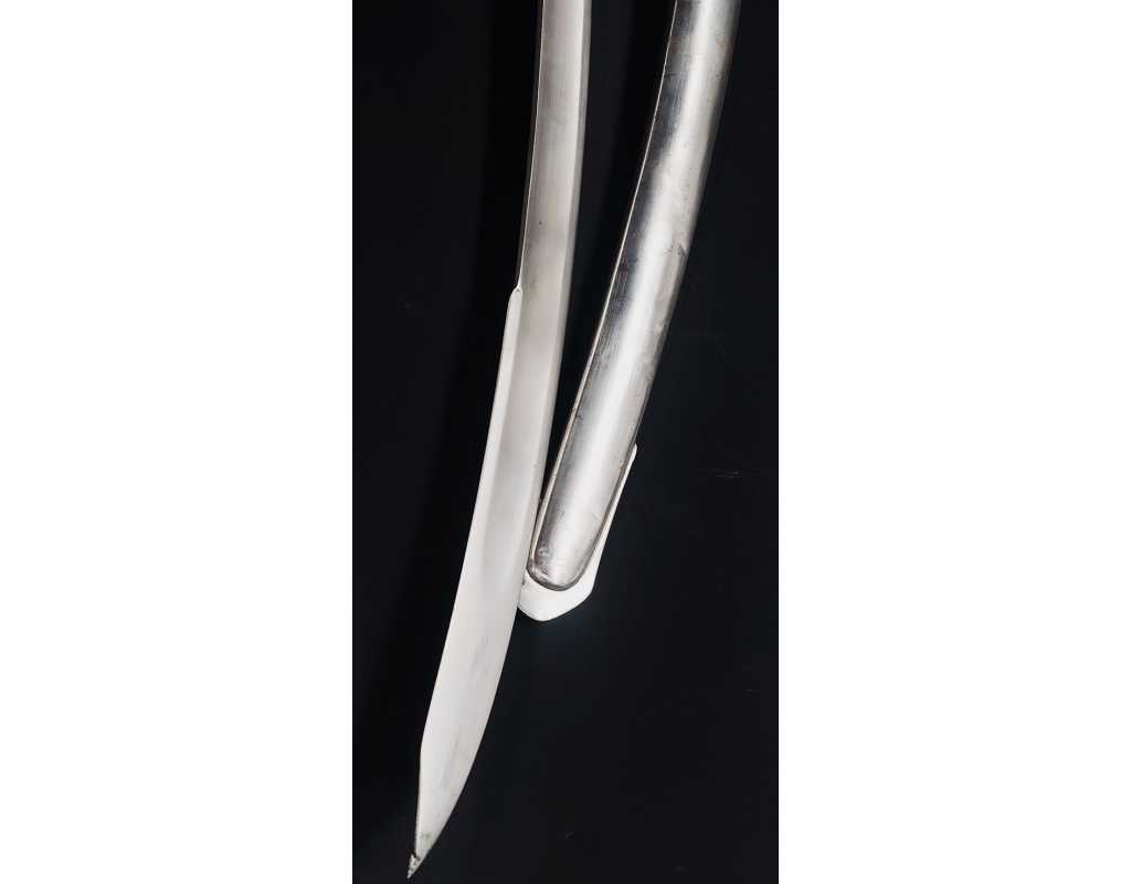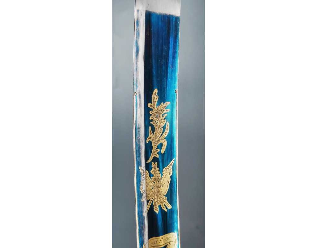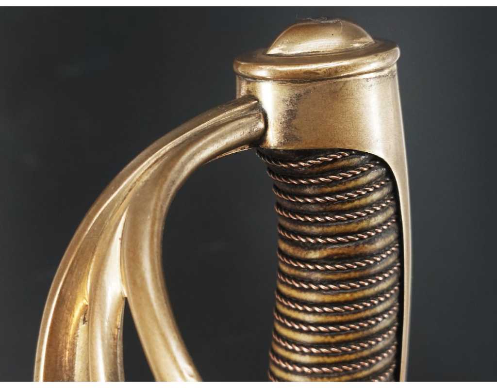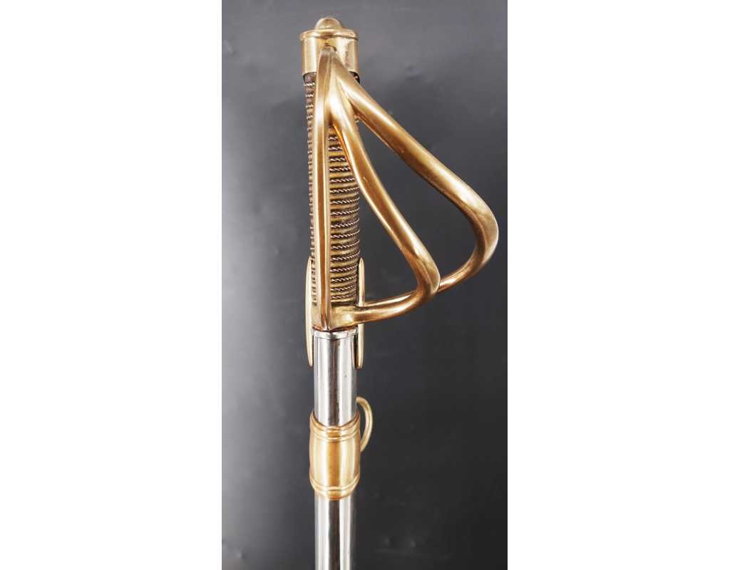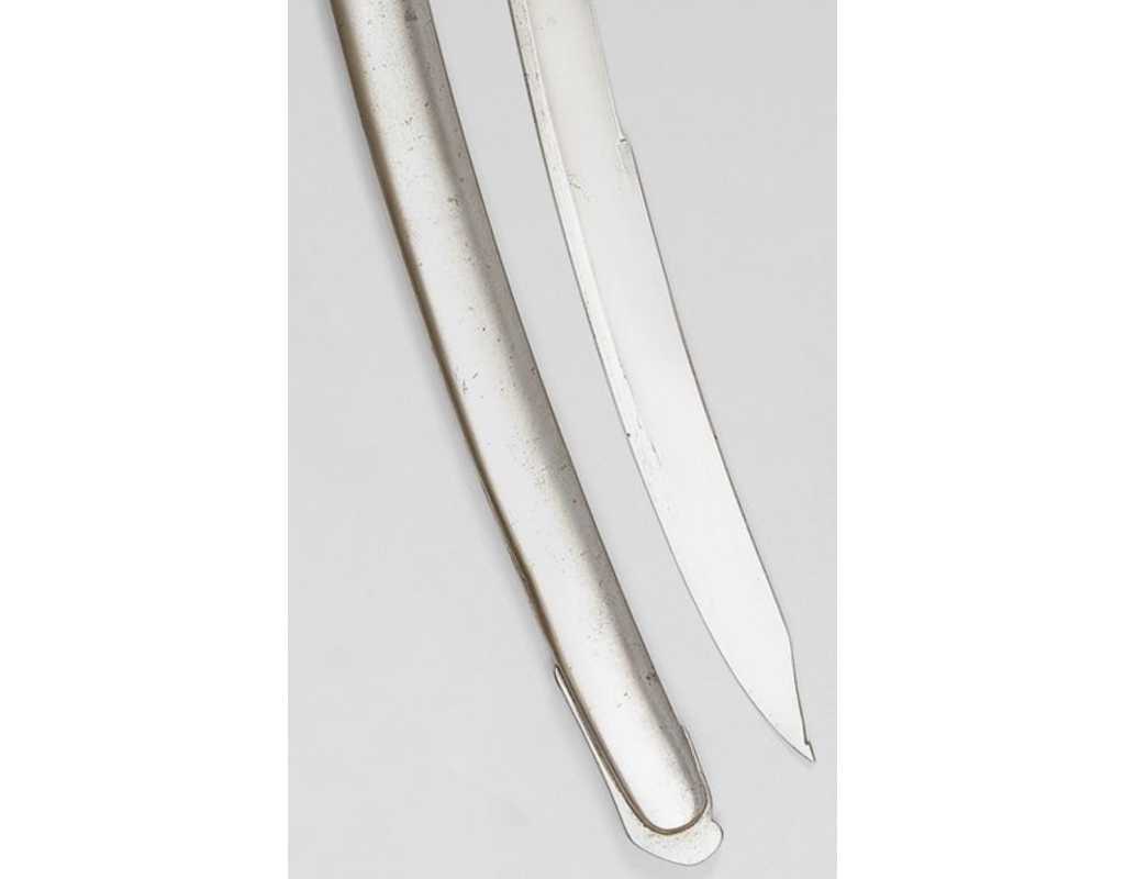 Monture en laiton doré, garde à la chasseur à trois branches unies en laiton doré du modèle de l'An IX, fusée de bois recouverte de cuir filigranée, calotte à longue queue renforcée à sa base, croisière à double oreillons terminée par un quillon recourbé en forme de boule. Forte lame de 86cm se terminant en langue de carpe, hameçon formé sur le contre tranchant, belle coloration d'origine dorée et bleuie sur la moitié, gravée sur chaque face d'un trophée, d'un hussard chargeant surmonté de la banderole "Vivat hussard", talon orné d'un soleil rayonnant, l'un des hussards porte un shako orné d'une aigle impériale. Fourreau de fer poli, à deux bracelets de bélières en laiton anciennement doré se terminant par un bourrelet, longueur 102 cm.