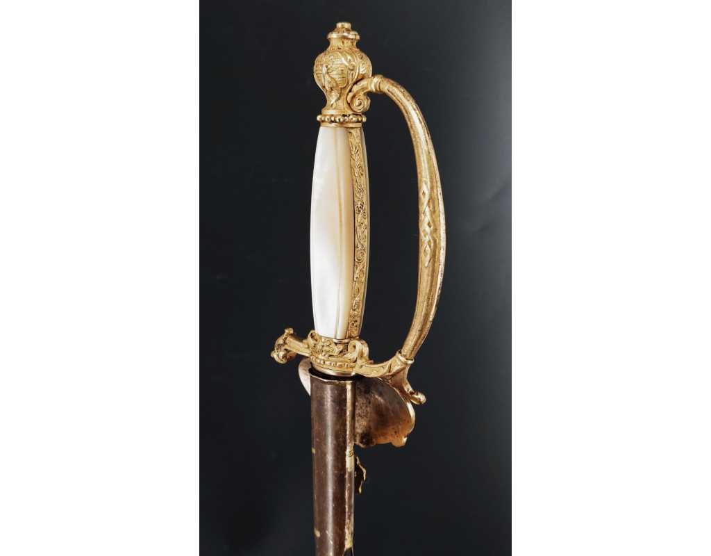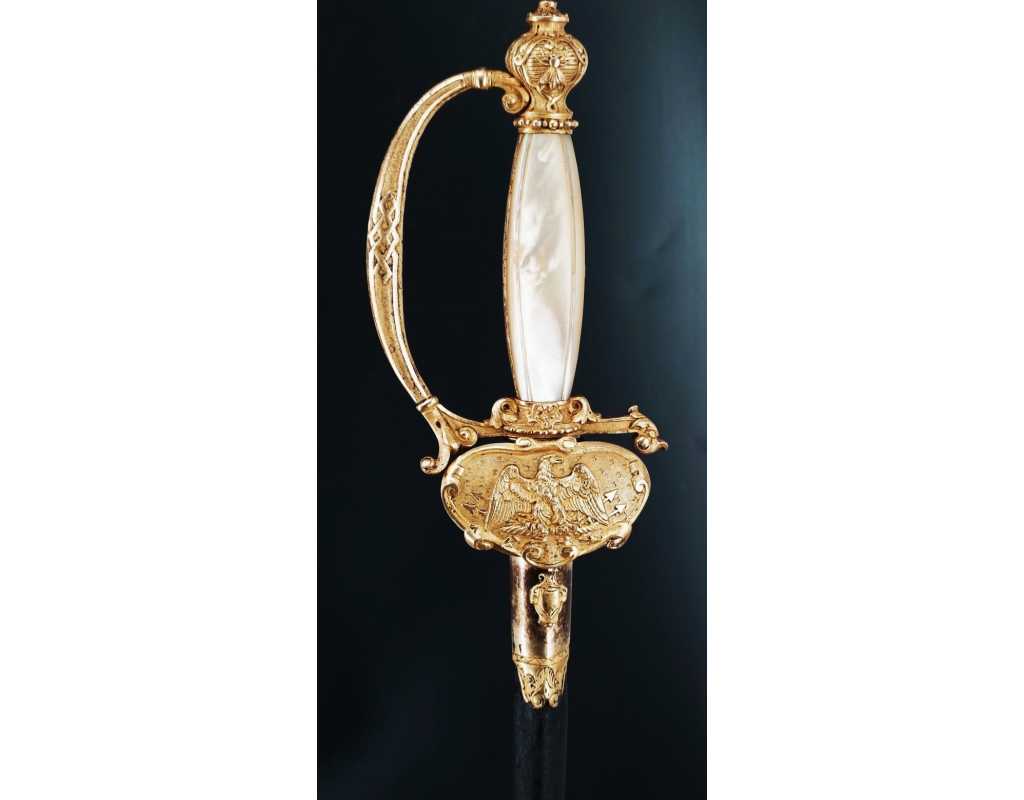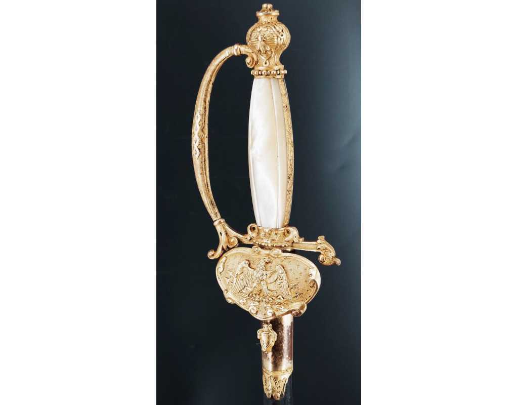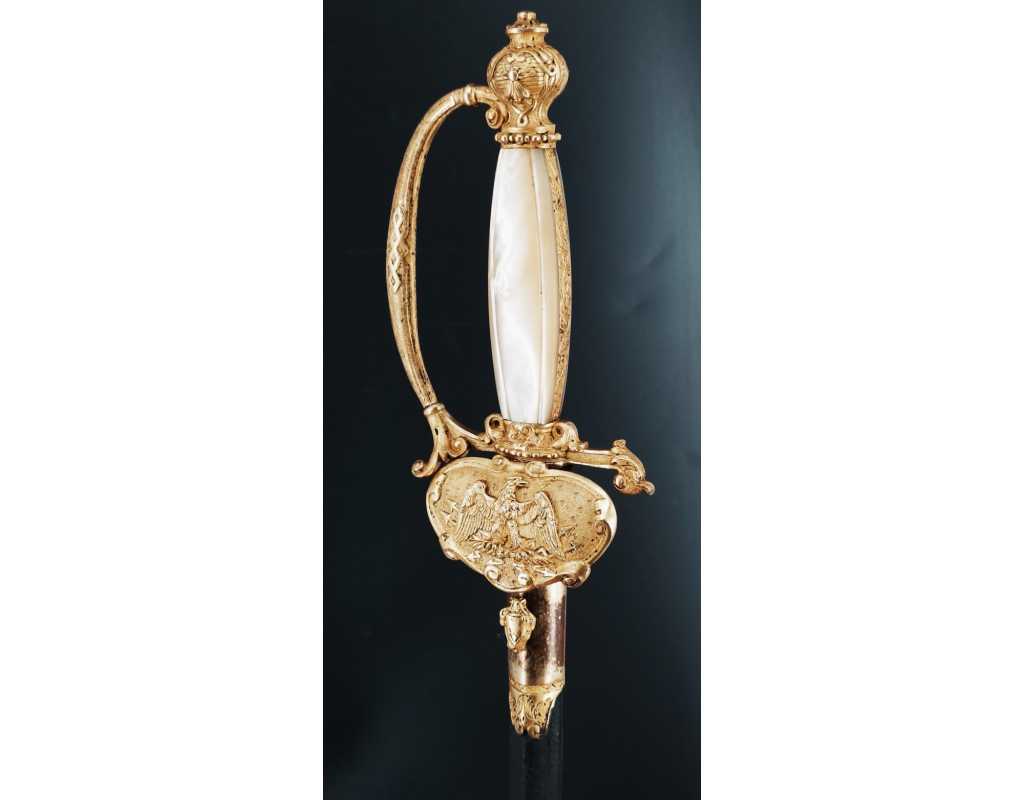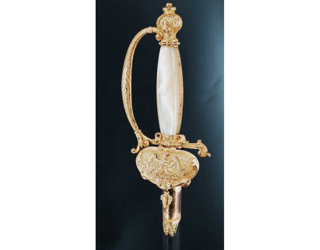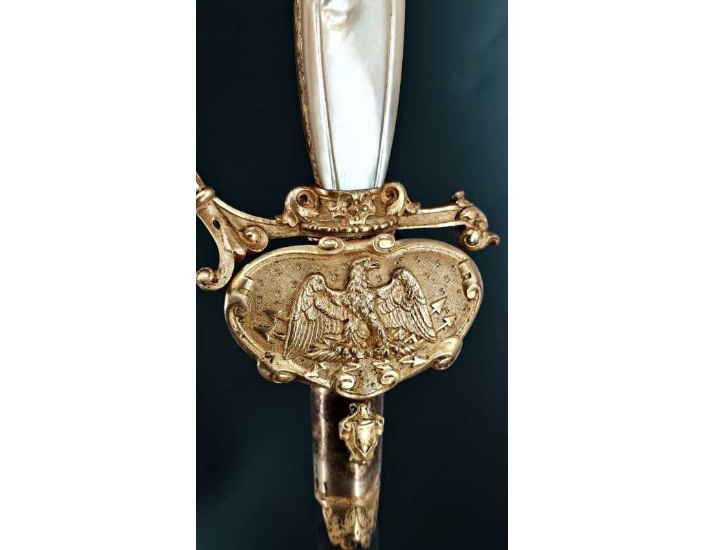 Monture en laiton doré, finement ciselée et perlés en creux, arc de jointure aux entrelacs caractéristiques du corps, calotte courte figurant des abeilles, plateau asymétrique à l'Aigle impérial aux ailes bien déployées et bordé de foudres où partent des éclairs, fusée bois recouverte de deux plaquettes de nacre non accidentée. Lame triangulaire à pans creux dans sa finition d'origine gravée de feuillages et trophées d'armes sur fond bleui doré au tiers, longue de 82cm, pointe émoussée, signée dans un cartouche au talon S.H.J. artisan non identifié de Solingen. Fourreau de cuir noirci à deux garniture de laiton doré, bouton de chape à écu centrale, couture légèrement ouverte au dessus de la bouterolle. Longueur totale 97cm