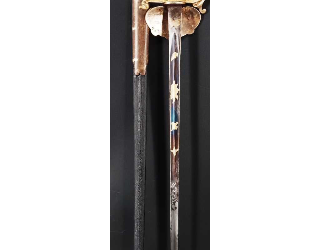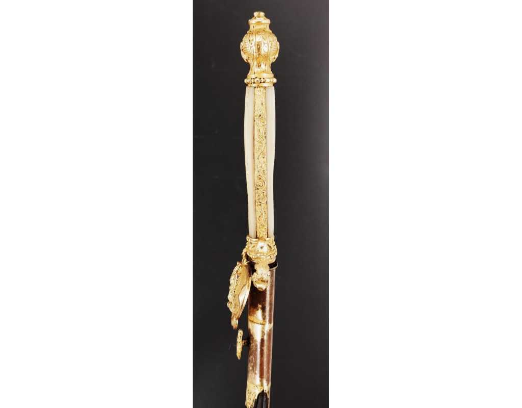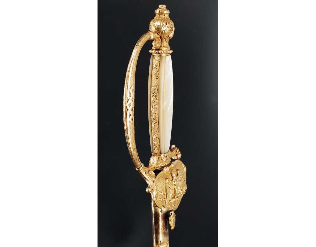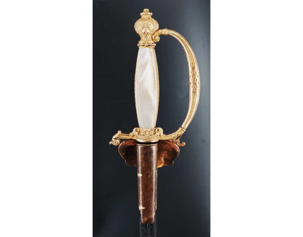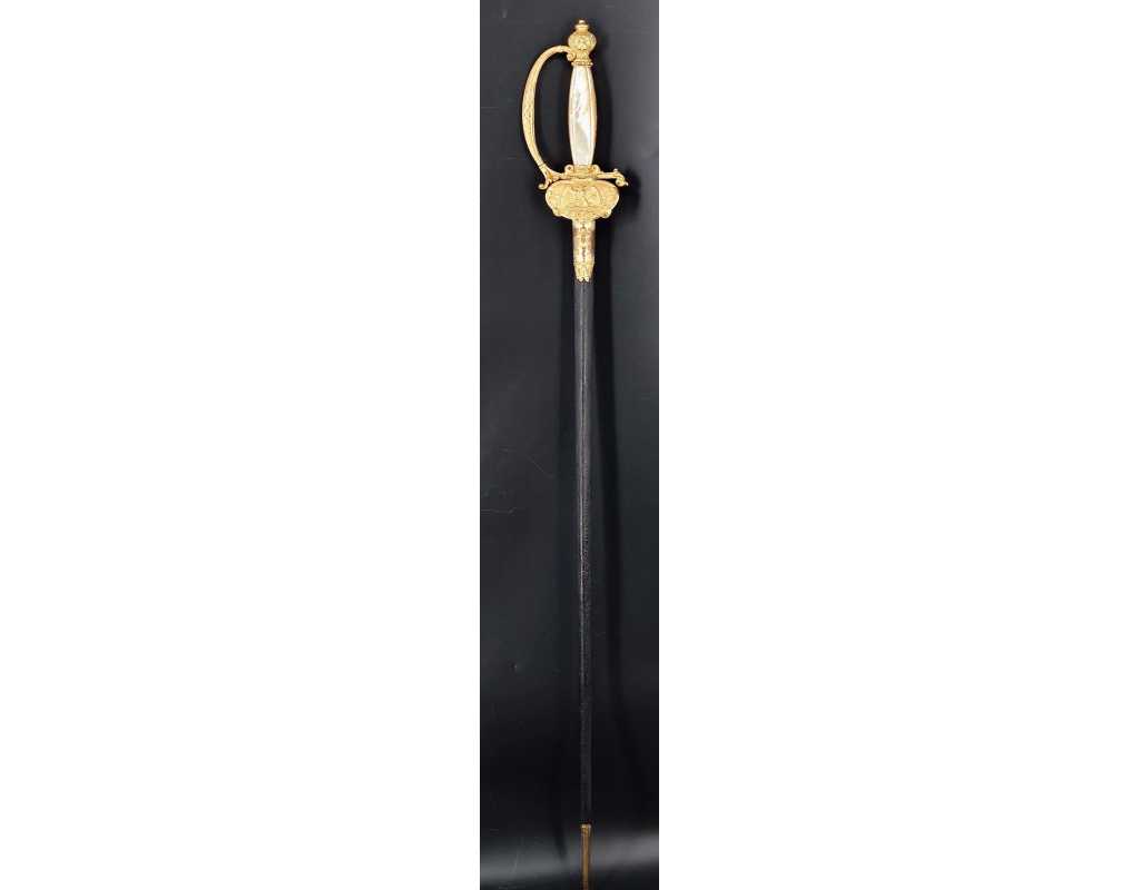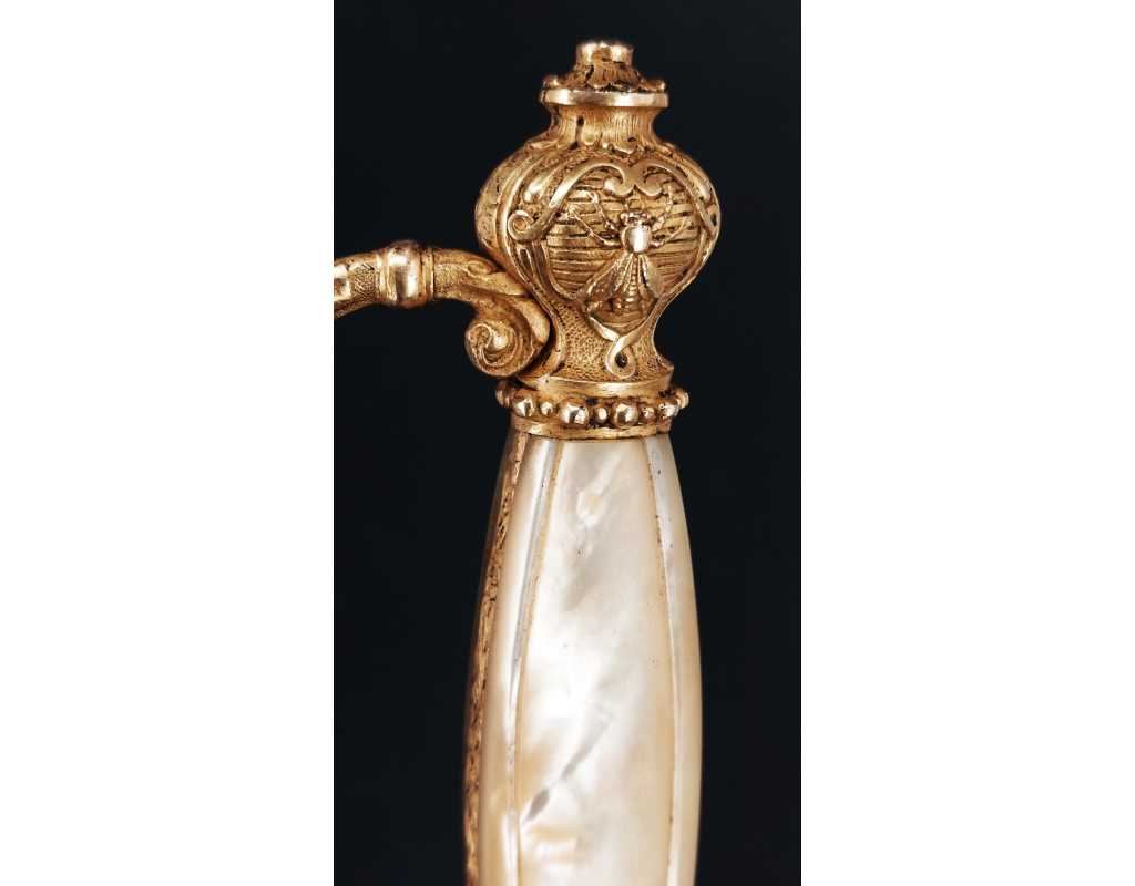 Monture en laiton doré, finement ciselée et perlés en creux, arc de jointure aux entrelacs caractéristiques du corps, calotte courte figurant des abeilles, plateau asymétrique à l'Aigle impérial aux ailes bien déployées et bordé de foudres où partent des éclairs, fusée bois recouverte de deux plaquettes de nacre non accidentée. Lame triangulaire à pans creux dans sa finition d'origine gravée de feuillages et trophées d'armes sur fond bleui doré au tiers, longue de 82cm, pointe émoussée, signée dans un cartouche au talon S.H.J. artisan non identifié de Solingen. Fourreau de cuir noirci à deux garniture de laiton doré, bouton de chape à écu centrale, couture légèrement ouverte au dessus de la bouterolle. Longueur totale 97cm