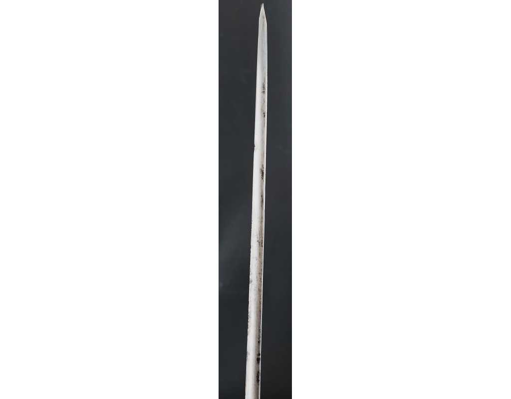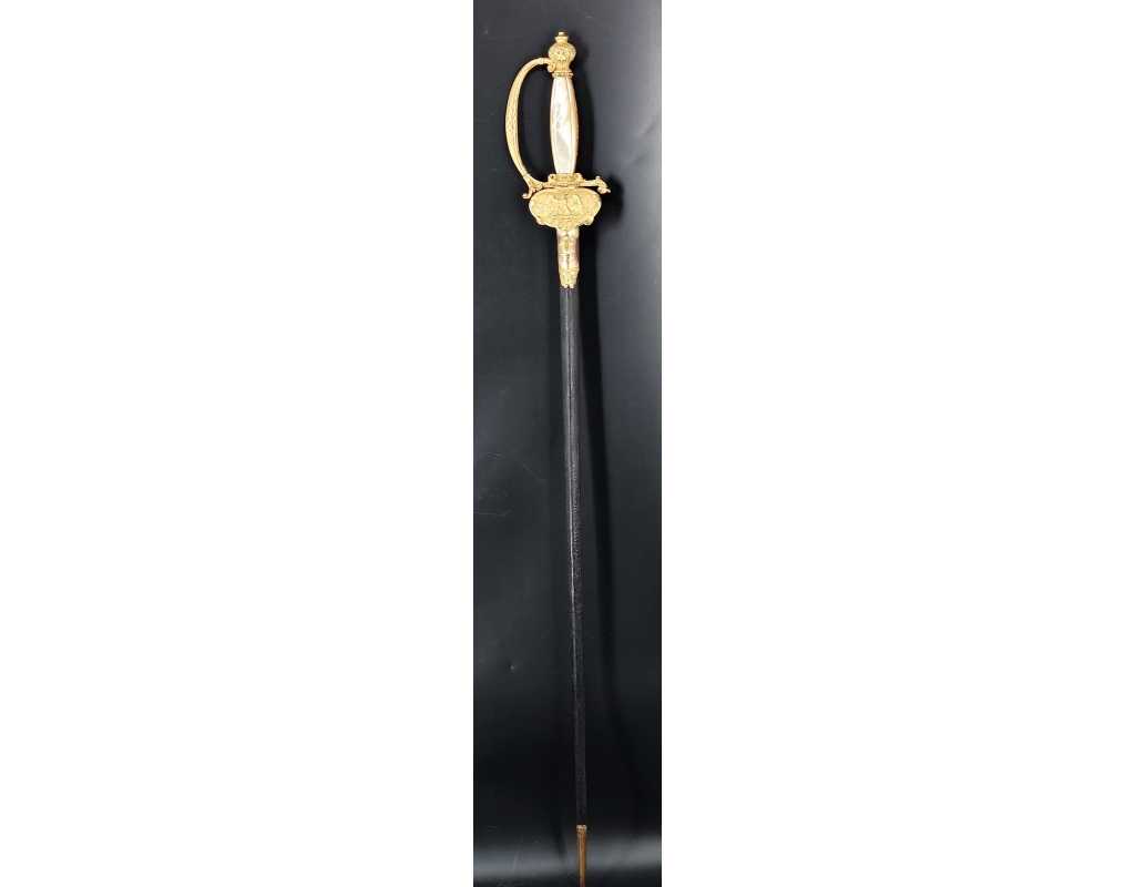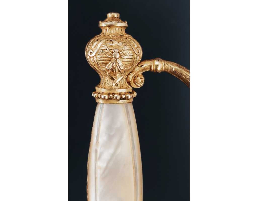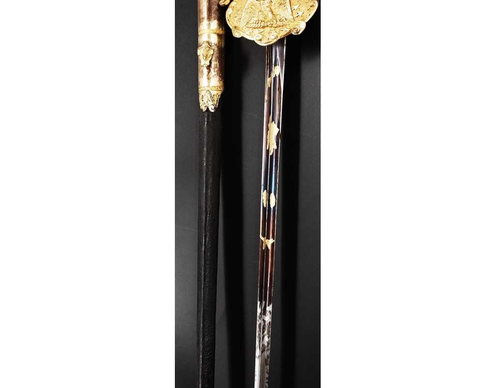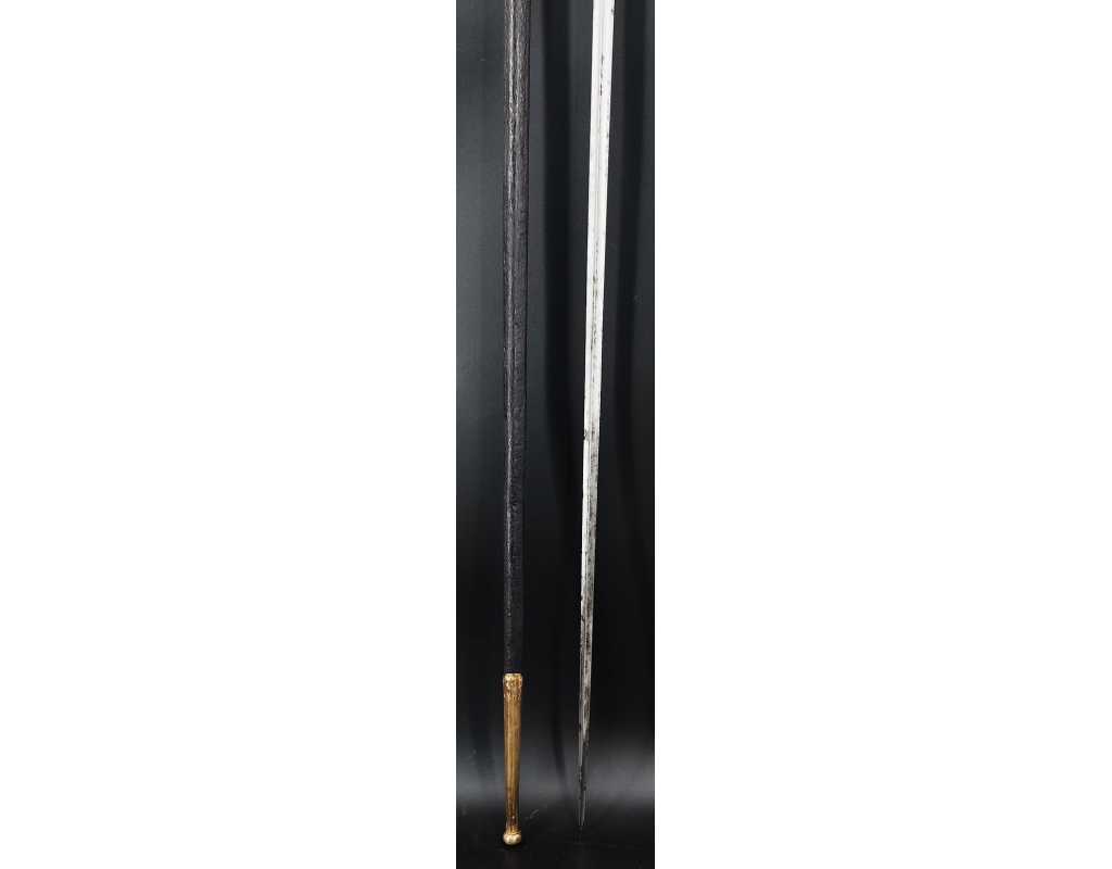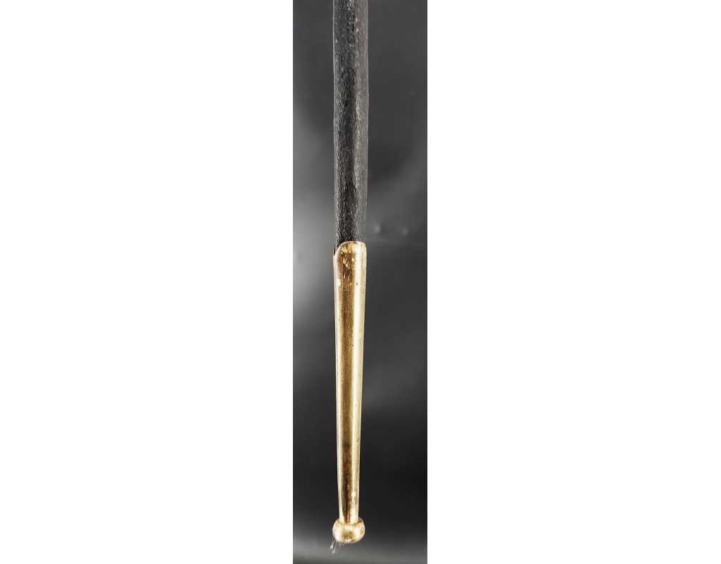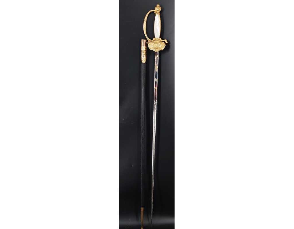 Monture en laiton doré, finement ciselée et perlés en creux, arc de jointure aux entrelacs caractéristiques du corps, calotte courte figurant des abeilles, plateau asymétrique à l'Aigle impérial aux ailes bien déployées et bordé de foudres où partent des éclairs, fusée bois recouverte de deux plaquettes de nacre non accidentée. Lame triangulaire à pans creux dans sa finition d'origine gravée de feuillages et trophées d'armes sur fond bleui doré au tiers, longue de 82cm, pointe émoussée, signée dans un cartouche au talon S.H.J. artisan non identifié de Solingen. Fourreau de cuir noirci à deux garniture de laiton doré, bouton de chape à écu centrale, couture légèrement ouverte au dessus de la bouterolle. Longueur totale 97cm