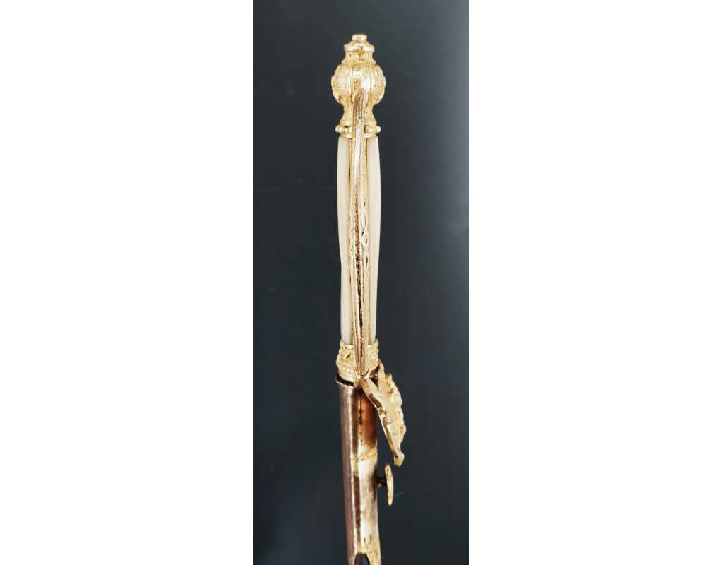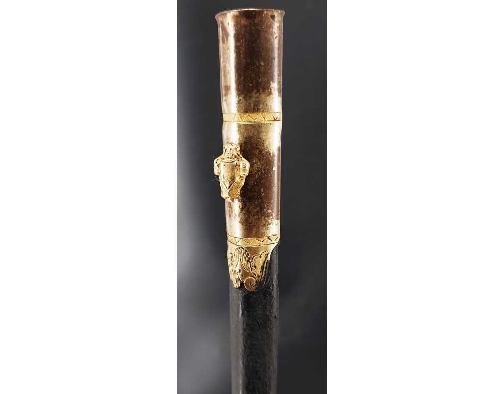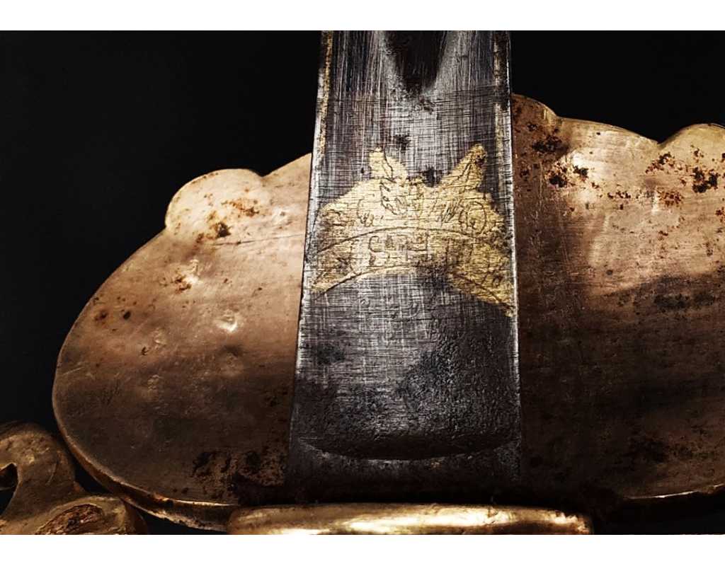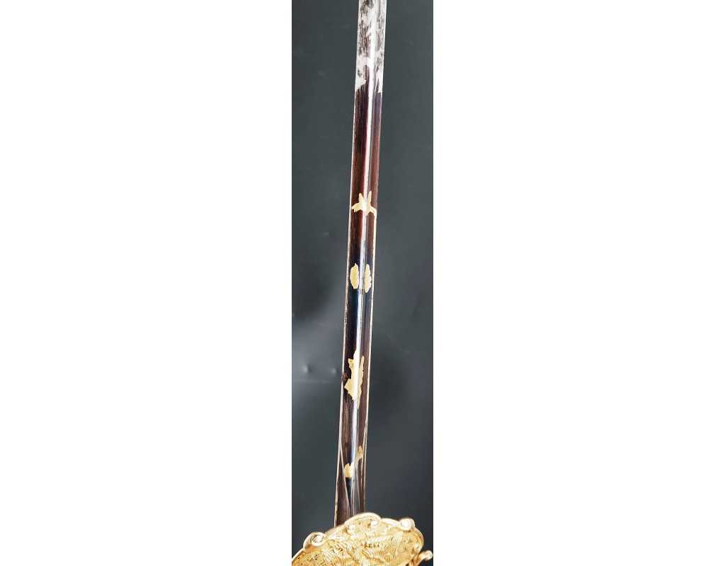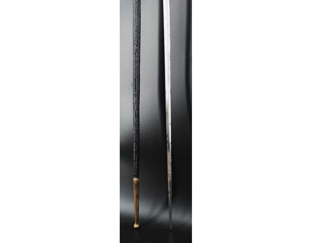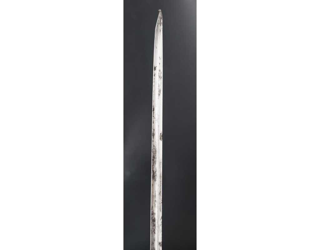 Monture en laiton doré, finement ciselée et perlés en creux, arc de jointure aux entrelacs caractéristiques du corps, calotte courte figurant des abeilles, plateau asymétrique à l'Aigle impérial aux ailes bien déployées et bordé de foudres où partent des éclairs, fusée bois recouverte de deux plaquettes de nacre non accidentée. Lame triangulaire à pans creux dans sa finition d'origine gravée de feuillages et trophées d'armes sur fond bleui doré au tiers, longue de 82cm, pointe émoussée, signée dans un cartouche au talon S.H.J. artisan non identifié de Solingen. Fourreau de cuir noirci à deux garniture de laiton doré, bouton de chape à écu centrale, couture légèrement ouverte au dessus de la bouterolle. Longueur totale 97cm