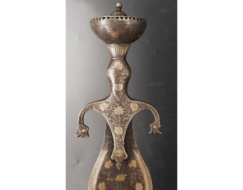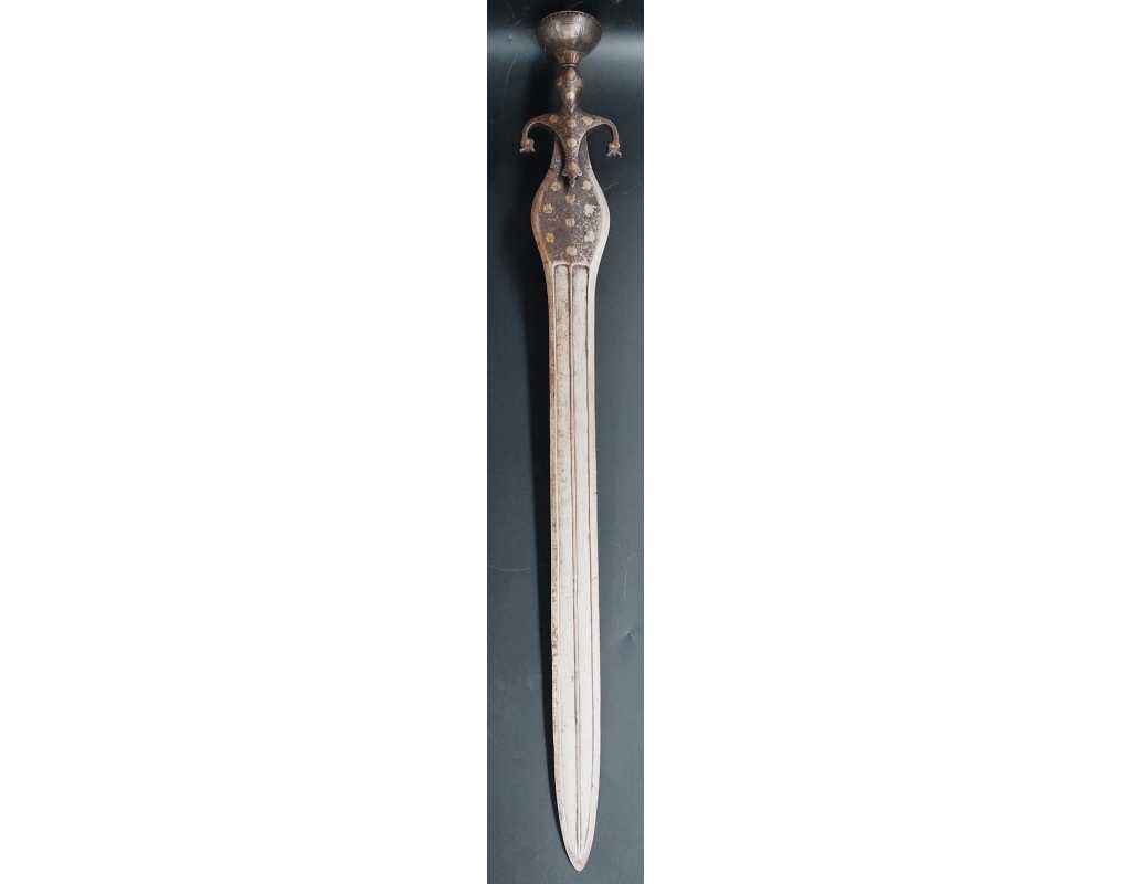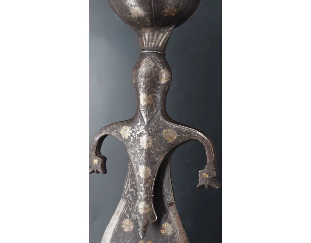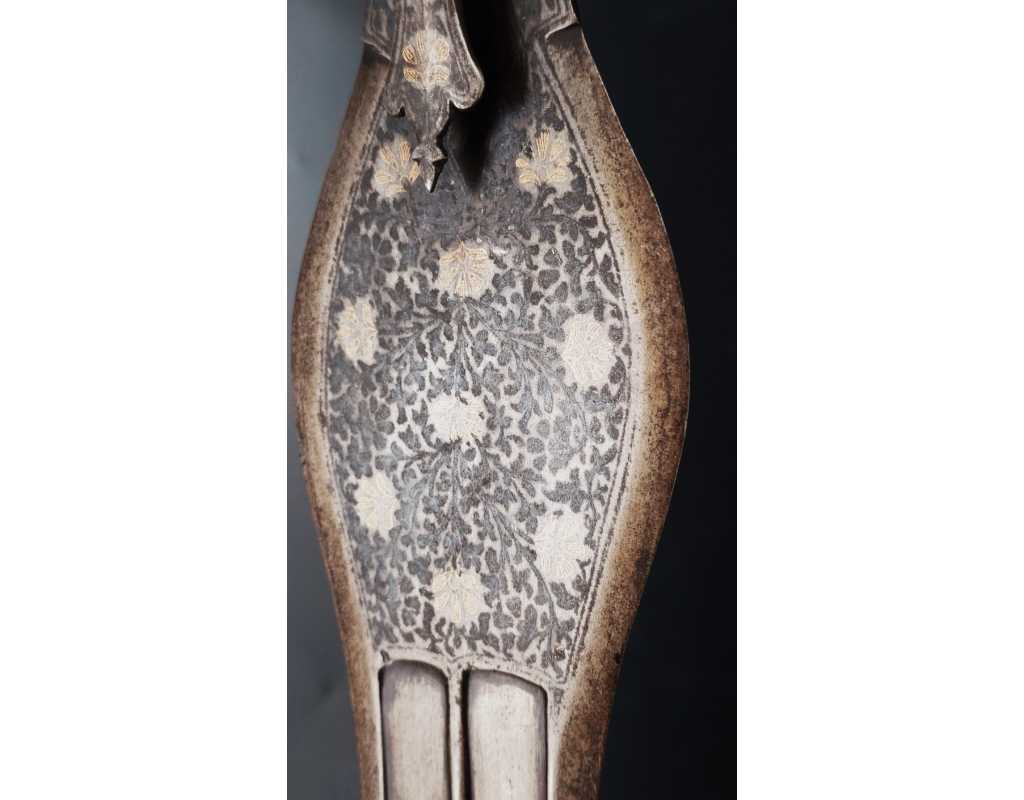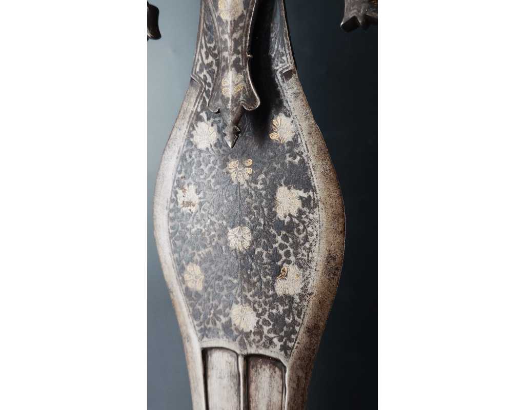 Rare épée indienne, d'inspiration afghane, en forme de cobra, ainsi nommée en raison de son profil de lame bombé au point fort, rappelant un cobra au garde-à-vous. Lame à double tranchant, deux gouttières centrales, décors en koftgari or et argent.