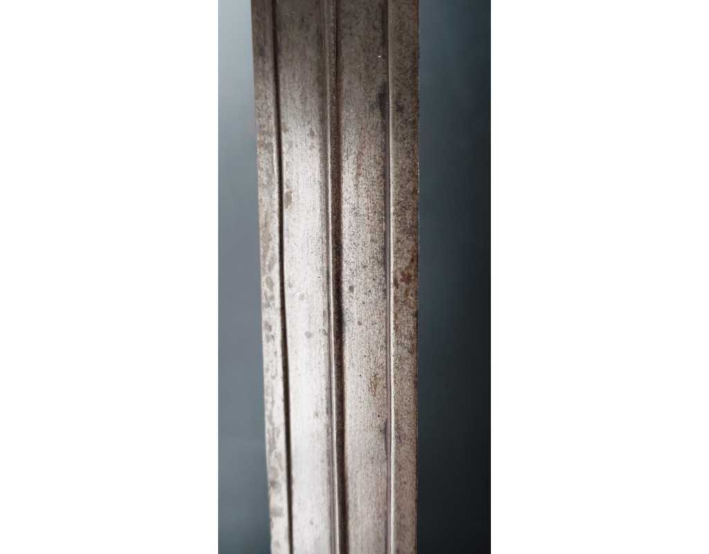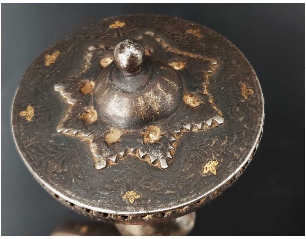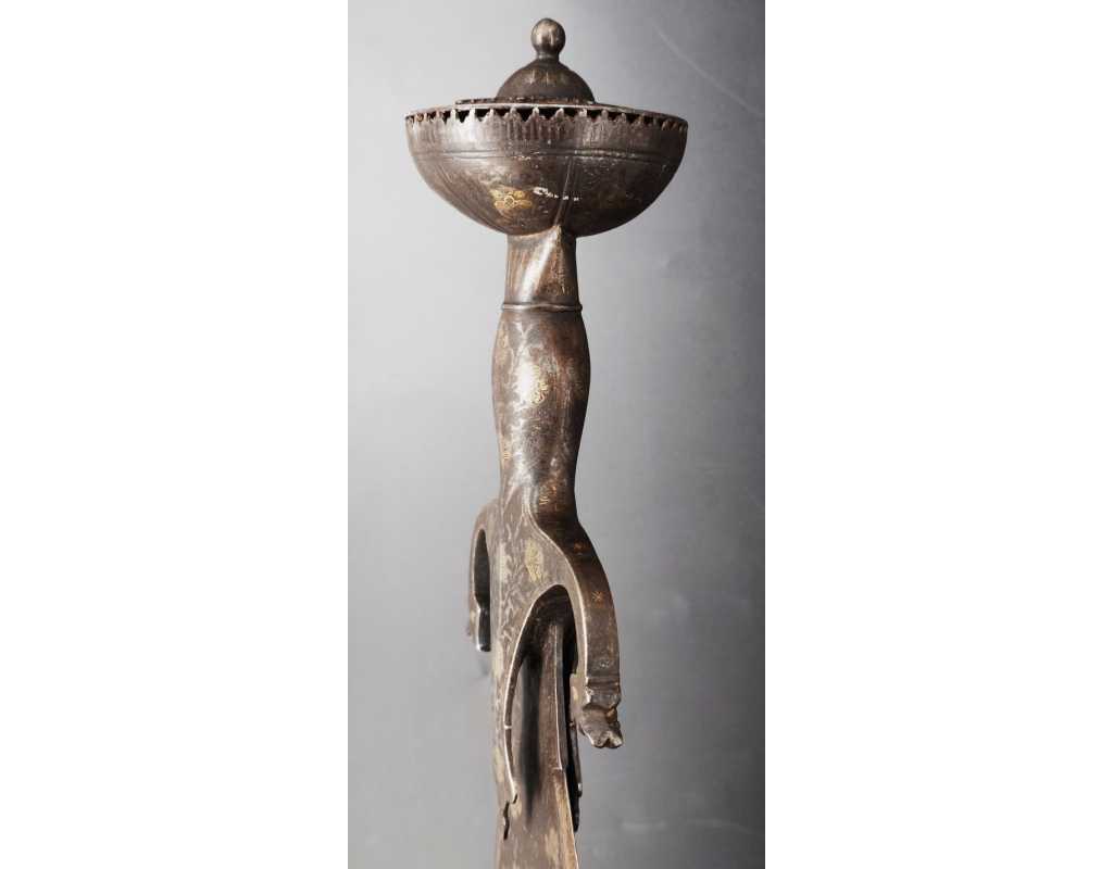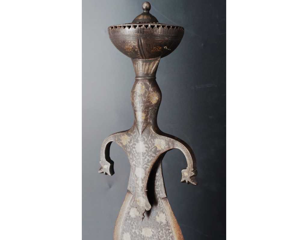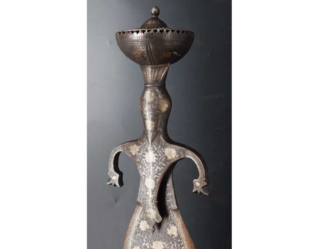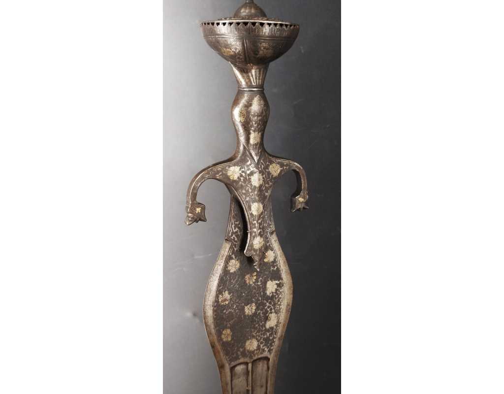 Rare épée indienne, d'inspiration afghane, en forme de cobra, ainsi nommée en raison de son profil de lame bombé au point fort, rappelant un cobra au garde-à-vous. Lame à double tranchant, deux gouttières centrales, décors en koftgari or et argent.