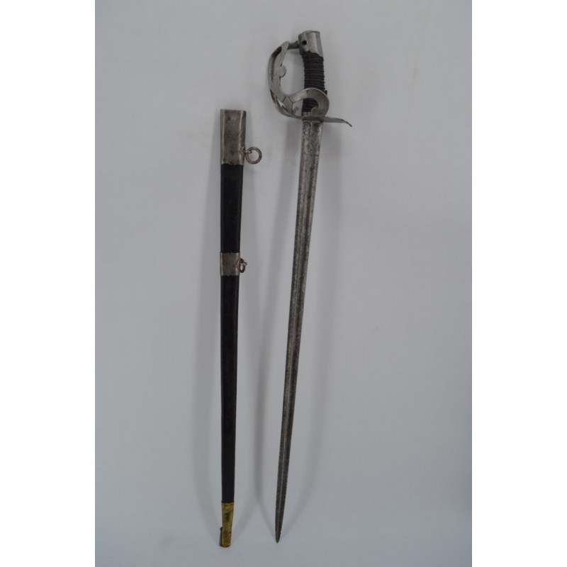 Sabre de grosse cavalerie du modèle réglementaire de 1779 pour les Dragons. Forte monture en fer en demi panier, branches à fleuron,plateau à quillon en palmette, calotte courte percé d'un passage de dragonne, traces d'anciennes restaurations d'époque par rivet, poignée bois gaînée de cuir filigrané d'un fort fil d'argent torsadé, pièce de pouce en lanière de cuir. Forte lame de cavalerie droite à double tranchant et arrête médiane, longue de 96 cm poinçonnée au talon R couronné de Klingenthal. Fourreau de cuir noirci à chape et bracelet de bélière en fer et bouterolle laiton.