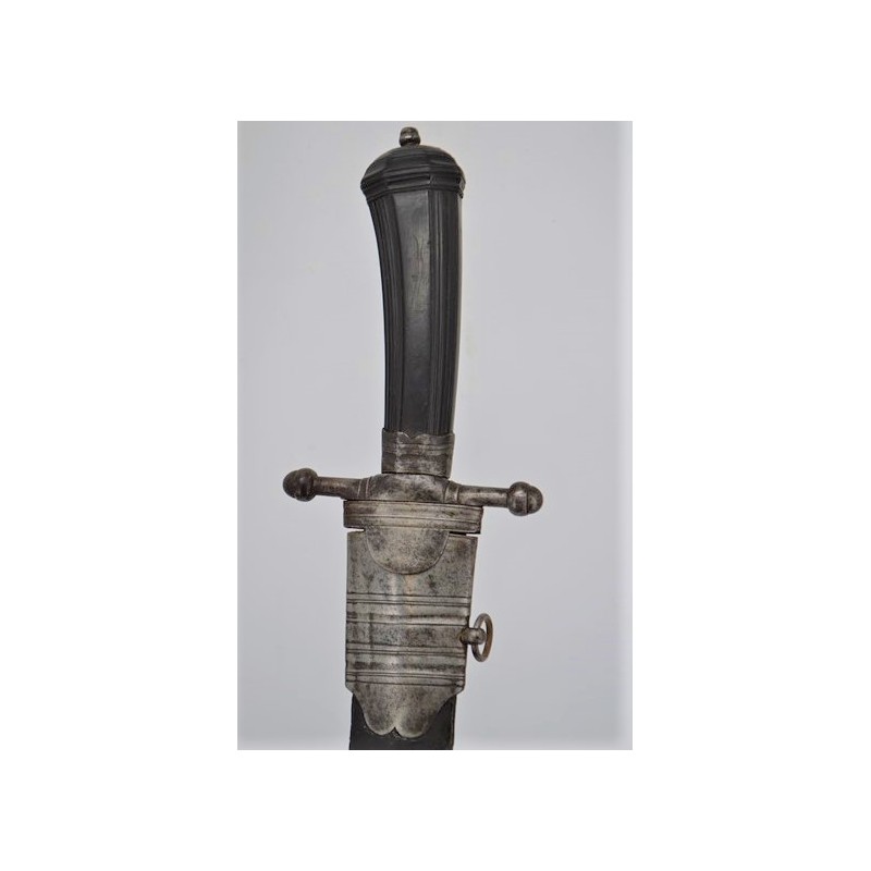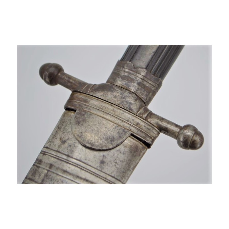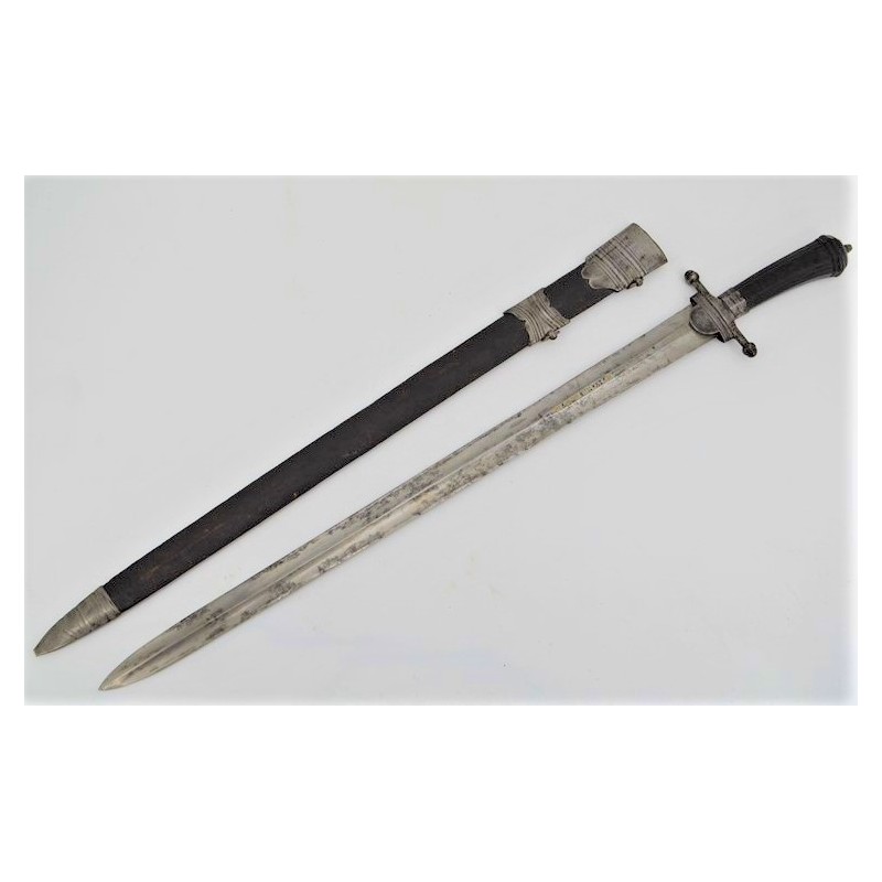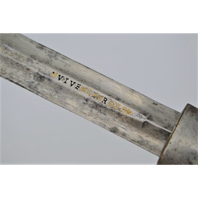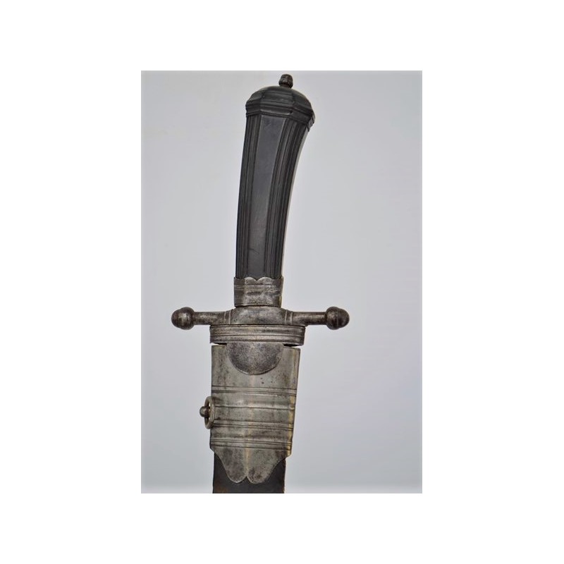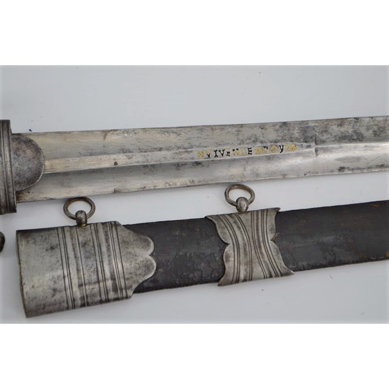 Rare énorme dague de chasse longue de 94cm, lame de sabre de cavalerie Louis XV vers 1730 à double gorges et arrête médiane dont la première partie plate est gravée " VIVE LE ROY " et incrusté d'or en partie disparu. Poignée en ébène cannelée sans fissure ou autre accident, monture en fer avec bouton de rivure, bague croisière à quillon droit en forme de boule, entrée de chape dans une belle patine sans oxydation ni aucun jeu d'assemblage. Fourreau bois recouvert de chagrin noirci cousu en bordure, usure sans accident, trois garnitures fer en suite décorés aux traits.