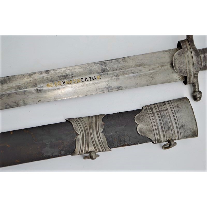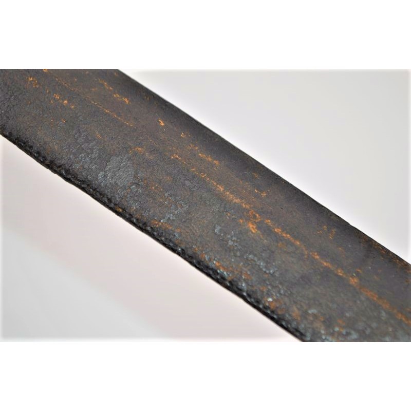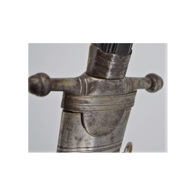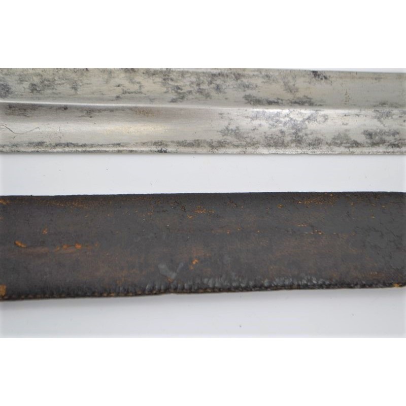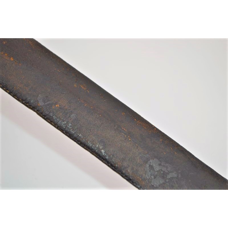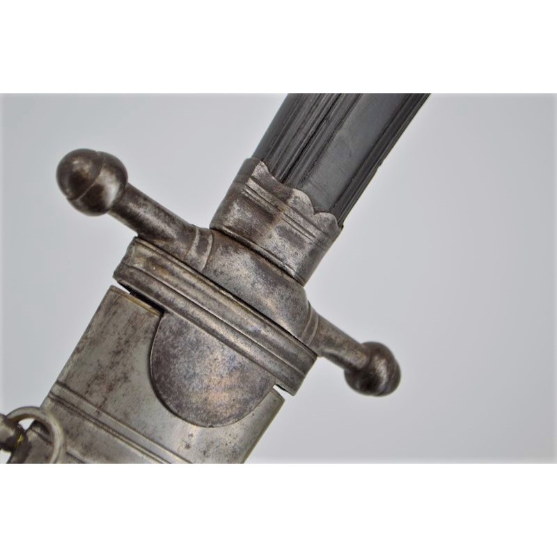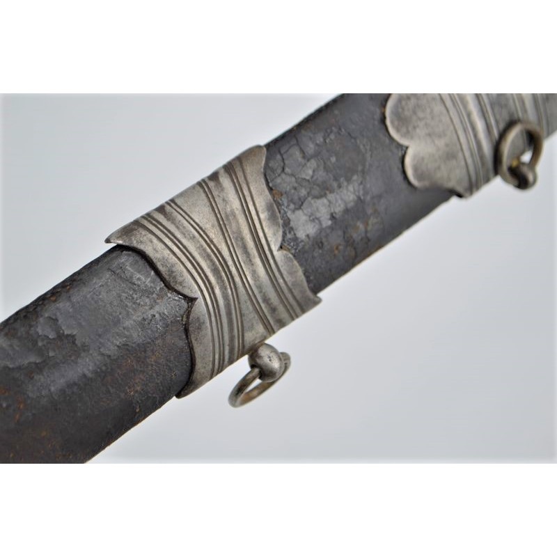 Rare énorme dague de chasse longue de 94cm, lame de sabre de cavalerie Louis XV vers 1730 à double gorges et arrête médiane dont la première partie plate est gravée " VIVE LE ROY " et incrusté d'or en partie disparu. Poignée en ébène cannelée sans fissure ou autre accident, monture en fer avec bouton de rivure, bague croisière à quillon droit en forme de boule, entrée de chape dans une belle patine sans oxydation ni aucun jeu d'assemblage. Fourreau bois recouvert de chagrin noirci cousu en bordure, usure sans accident, trois garnitures fer en suite décorés aux traits.