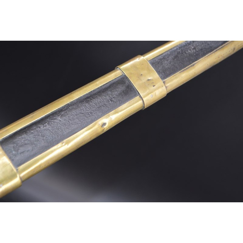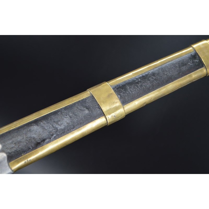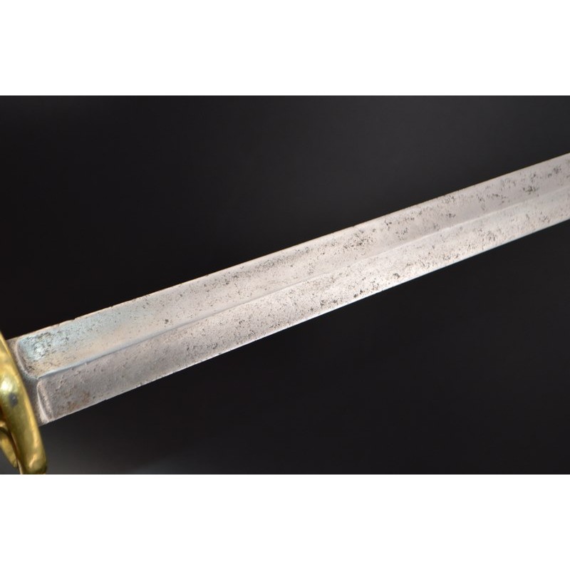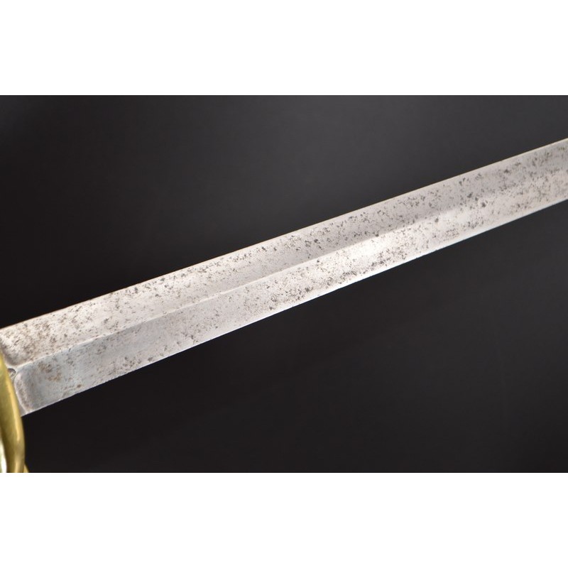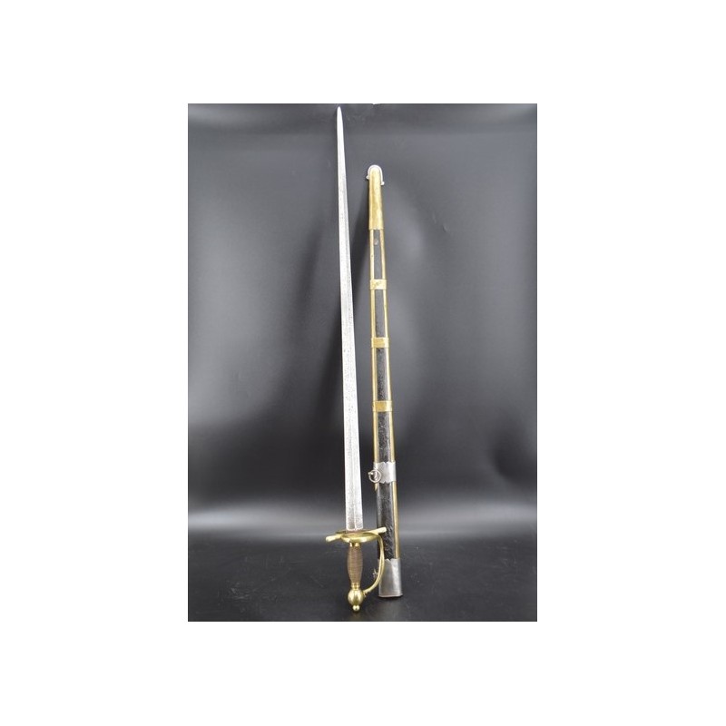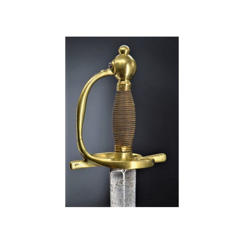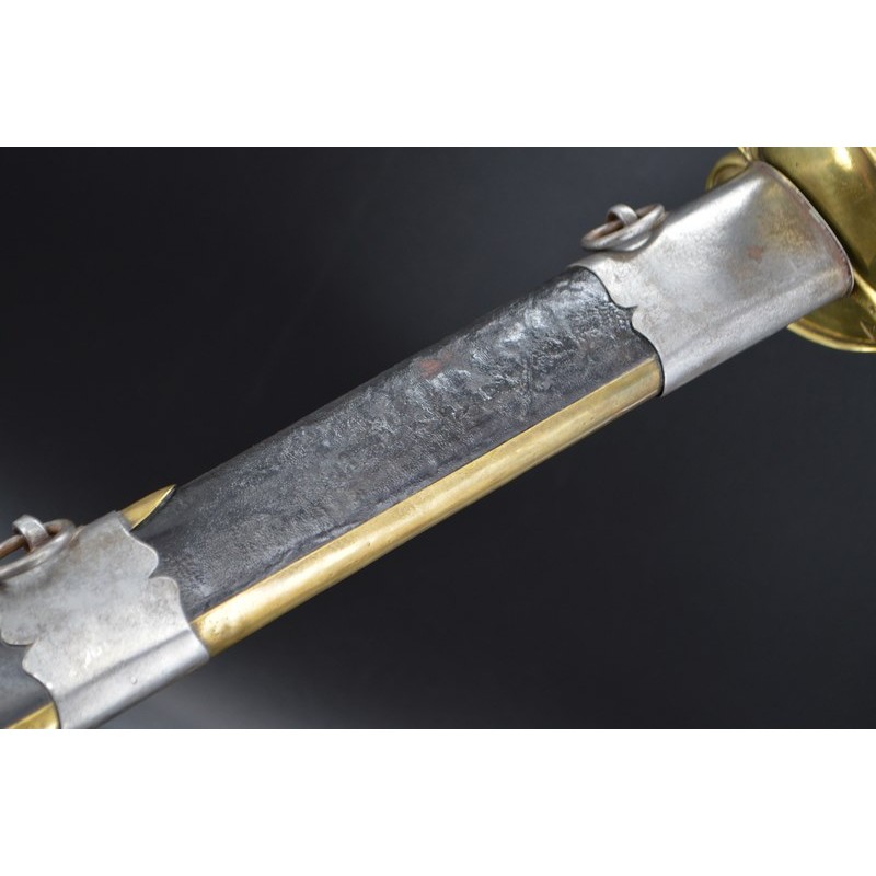 Très rare sabre des cavaliers et dragons modèle de 1776 produit de 1776 à 1779. Forte monture à la suédoise en laiton, double pontat frappé d'uns inscription de régiment A 44 en dessous et double quillon droit dont un renforcé, le second à un léger felle, branche de garde vissée sur le pommeau ovoïde, fusée de bois filigranée et virolée de laiton. Lame droite à double tranchant de 96 cm poinçonnée sur le talon du « R » à la petite couronne de Klingenthal et reporté sur le quillon de garde. Fourreau renforcé à fut de bois gainé de cuir noirci, chape et bracelet de bélière de fer, attelles et bracelets de renfort en laiton, bouterolle laiton à dard en fer. Traces d'oxydation d'usage, Très bon état, France Ancienne Monarchie