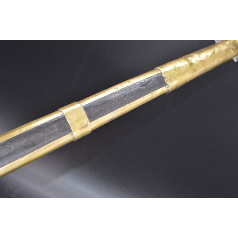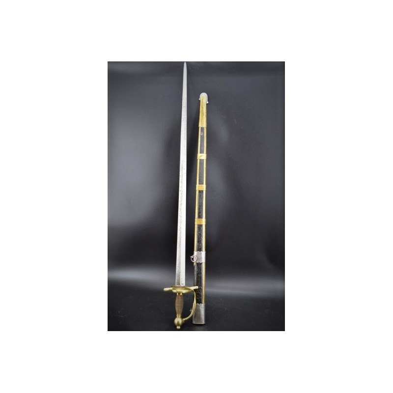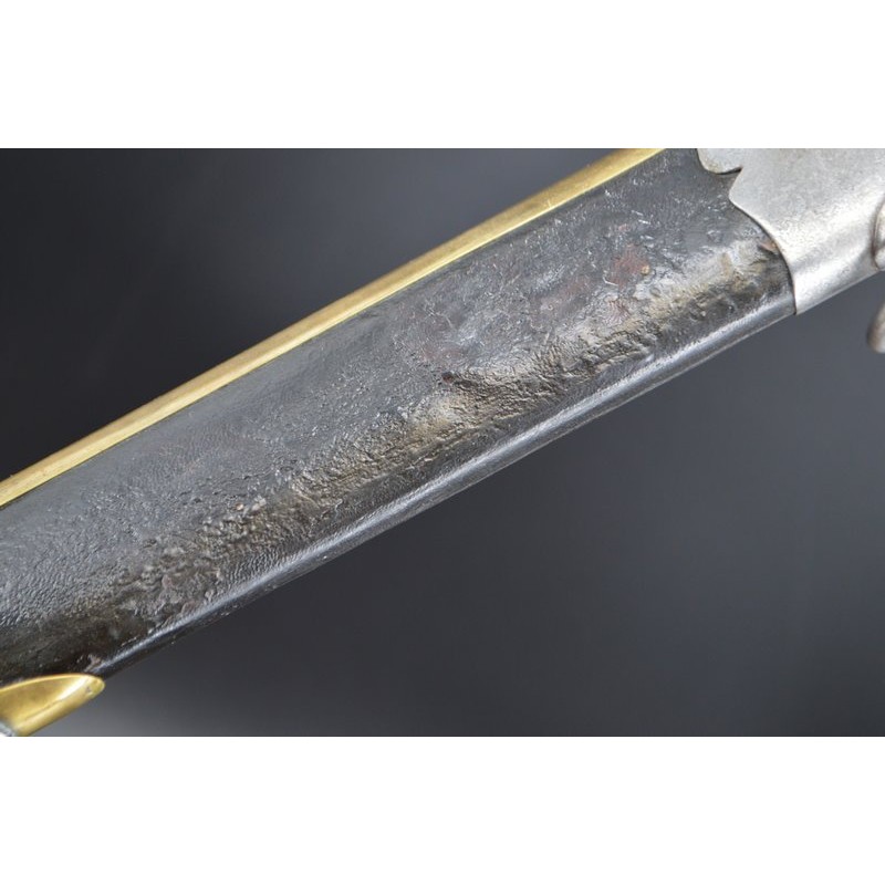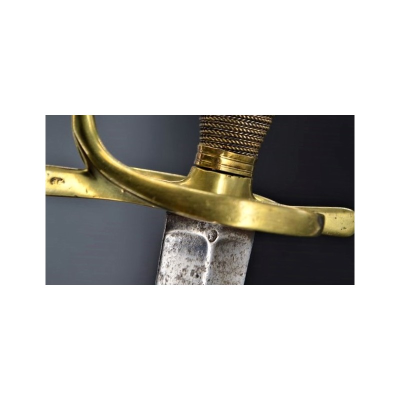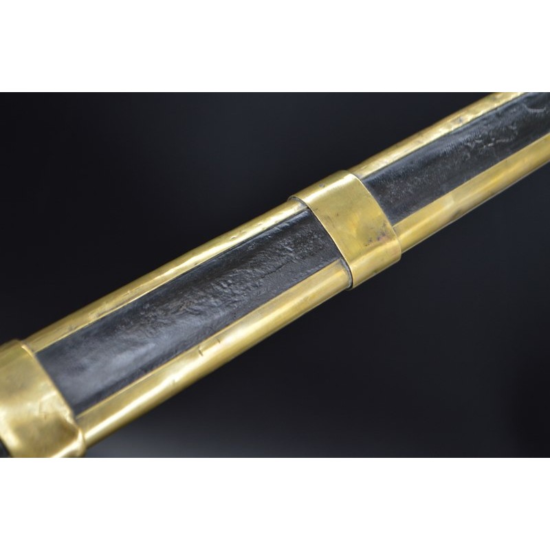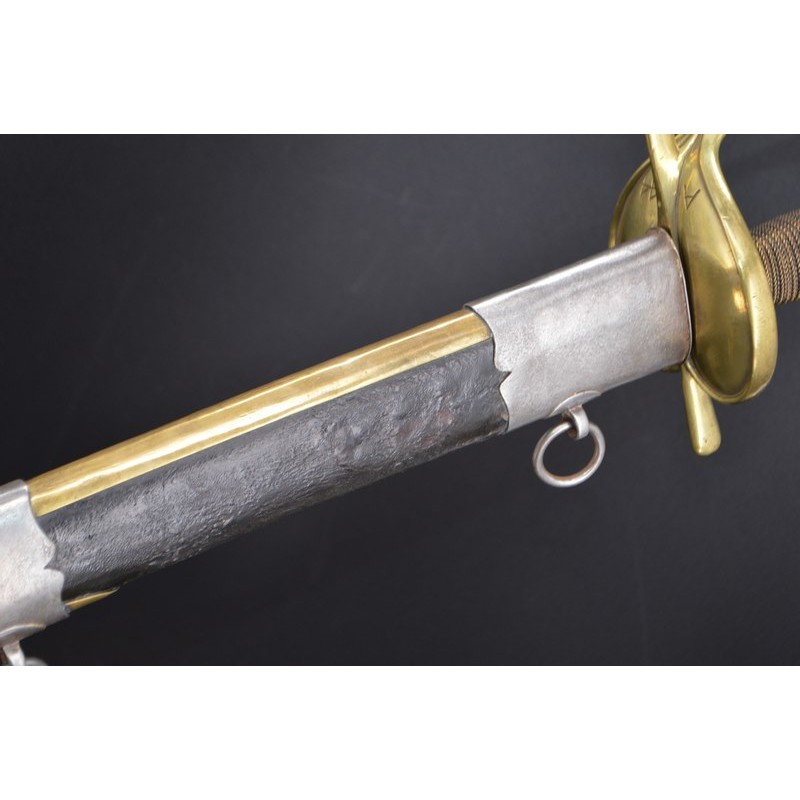 Très rare sabre des cavaliers et dragons modèle de 1776 produit de 1776 à 1779. Forte monture à la suédoise en laiton, double pontat frappé d'uns inscription de régiment A 44 en dessous et double quillon droit dont un renforcé, le second à un léger felle, branche de garde vissée sur le pommeau ovoïde, fusée de bois filigranée et virolée de laiton. Lame droite à double tranchant de 96 cm poinçonnée sur le talon du « R » à la petite couronne de Klingenthal et reporté sur le quillon de garde. Fourreau renforcé à fut de bois gainé de cuir noirci, chape et bracelet de bélière de fer, attelles et bracelets de renfort en laiton, bouterolle laiton à dard en fer. Traces d'oxydation d'usage, Très bon état, France Ancienne Monarchie