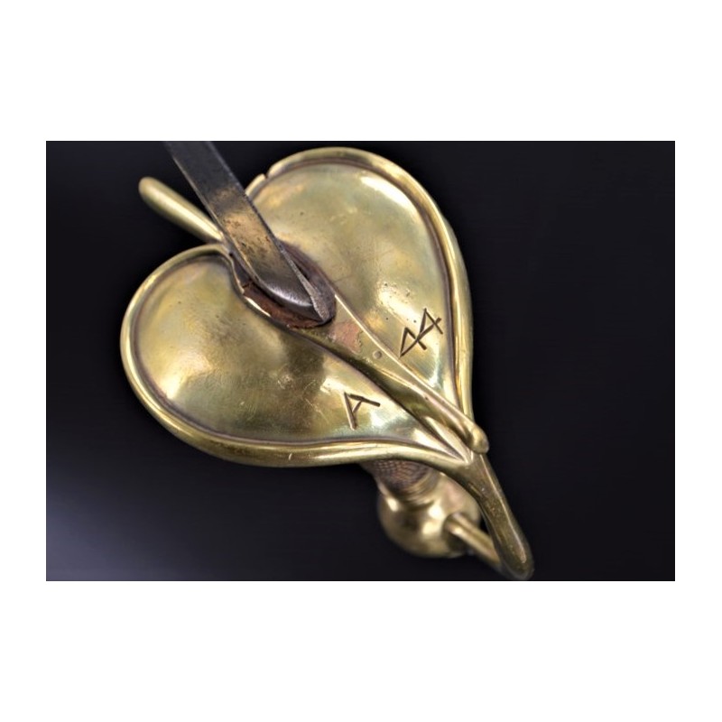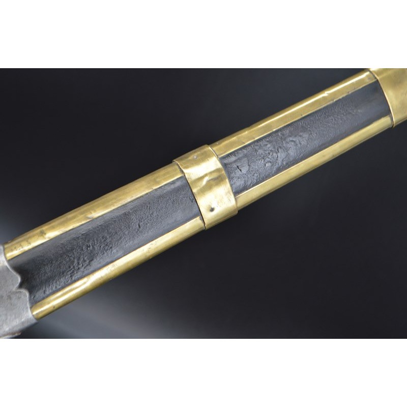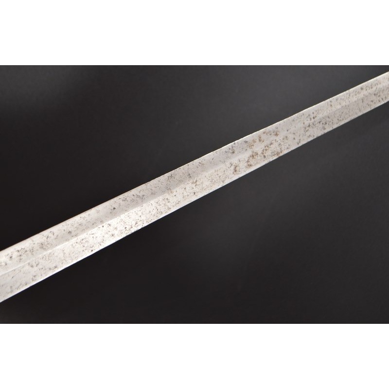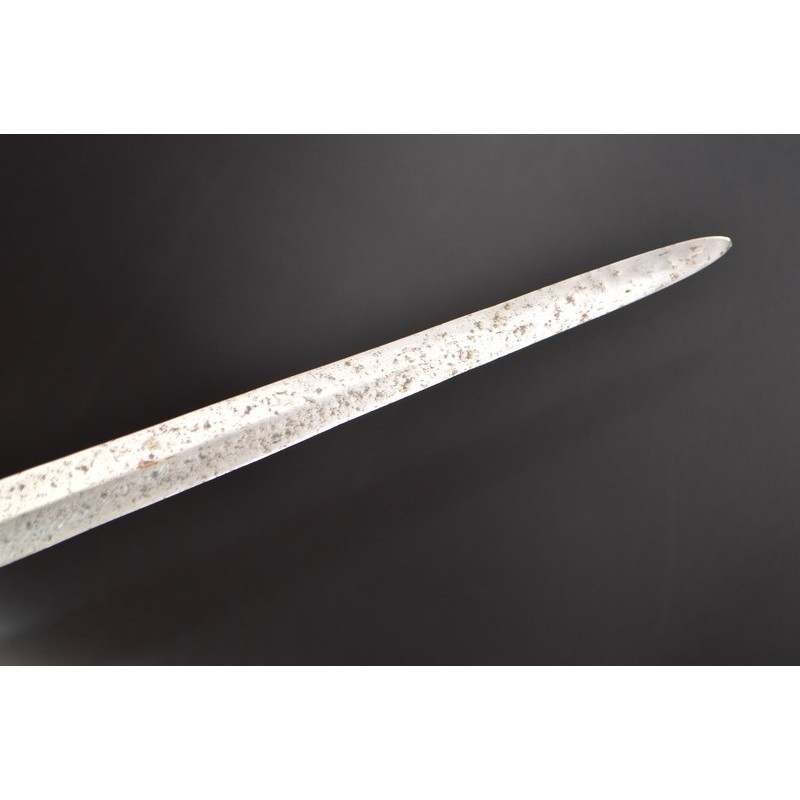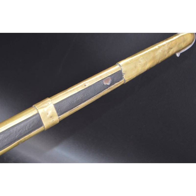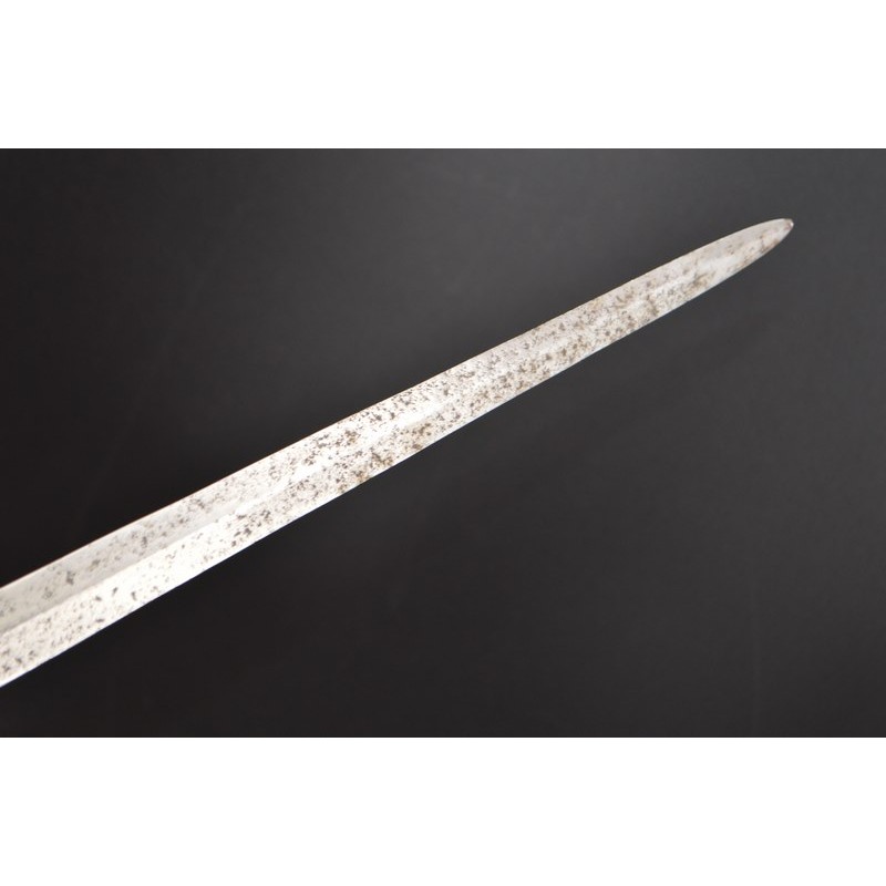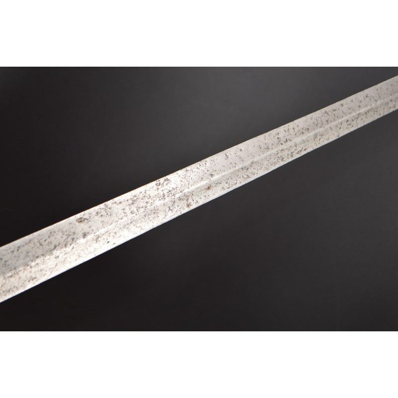 Très rare sabre des cavaliers et dragons modèle de 1776 produit de 1776 à 1779. Forte monture à la suédoise en laiton, double pontat frappé d'uns inscription de régiment A 44 en dessous et double quillon droit dont un renforcé, le second à un léger felle, branche de garde vissée sur le pommeau ovoïde, fusée de bois filigranée et virolée de laiton. Lame droite à double tranchant de 96 cm poinçonnée sur le talon du « R » à la petite couronne de Klingenthal et reporté sur le quillon de garde. Fourreau renforcé à fut de bois gainé de cuir noirci, chape et bracelet de bélière de fer, attelles et bracelets de renfort en laiton, bouterolle laiton à dard en fer. Traces d'oxydation d'usage, Très bon état, France Ancienne Monarchie