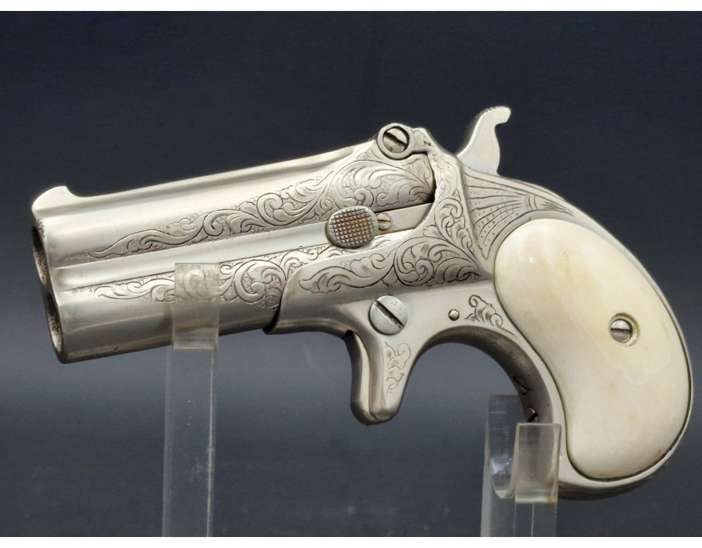 Pistolet Remington Deringer 41 RF percussion annulaire version gravée et nickelée, marquage bien net sans usure, fonctionnement mécanique fonctionnelle. Canon à rayures fortement usagées et tachée. Plaquettes de crosse blanche.