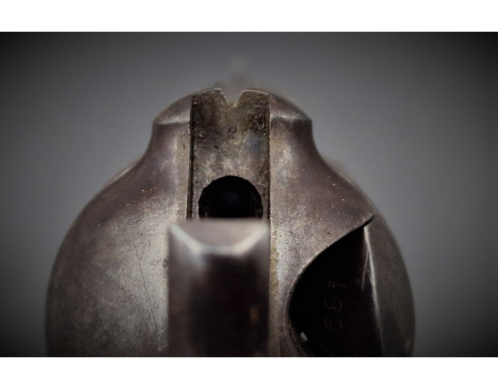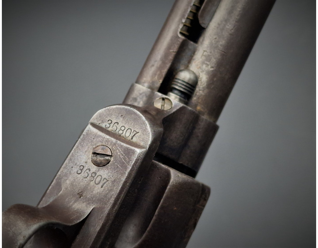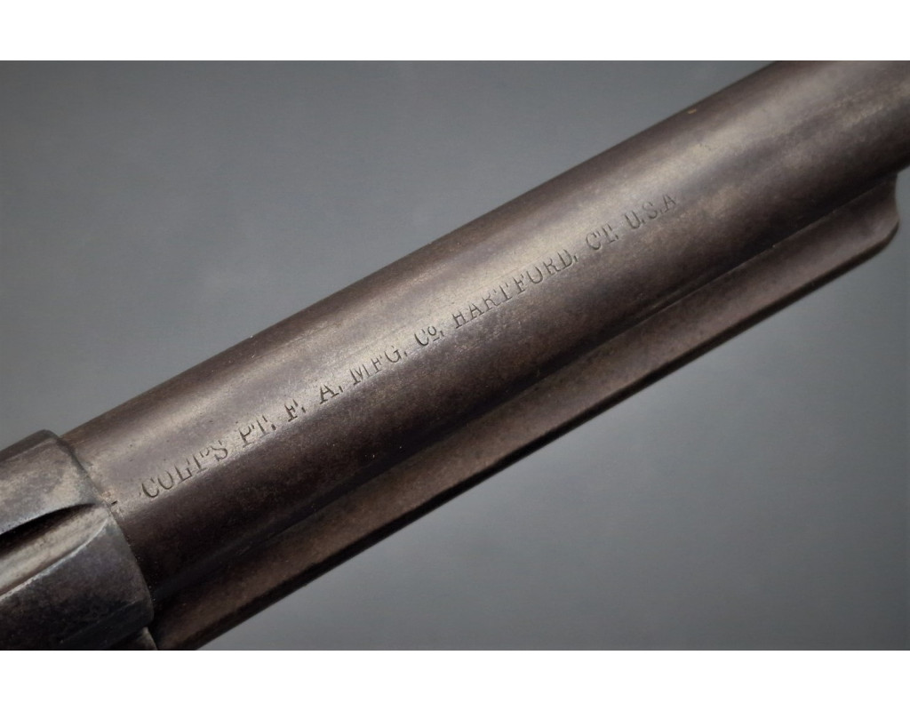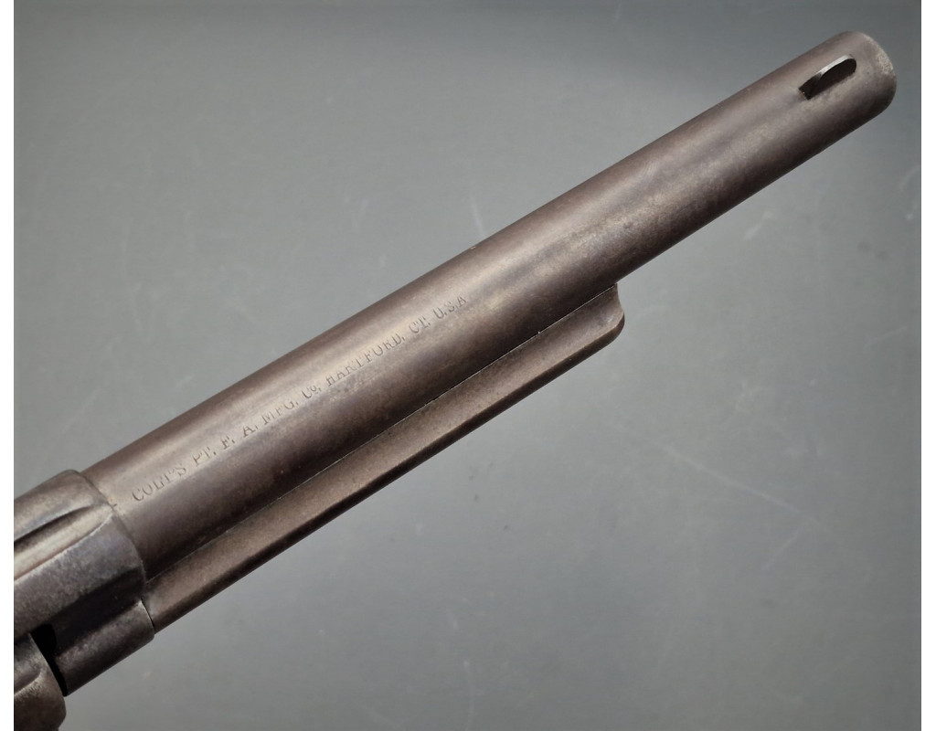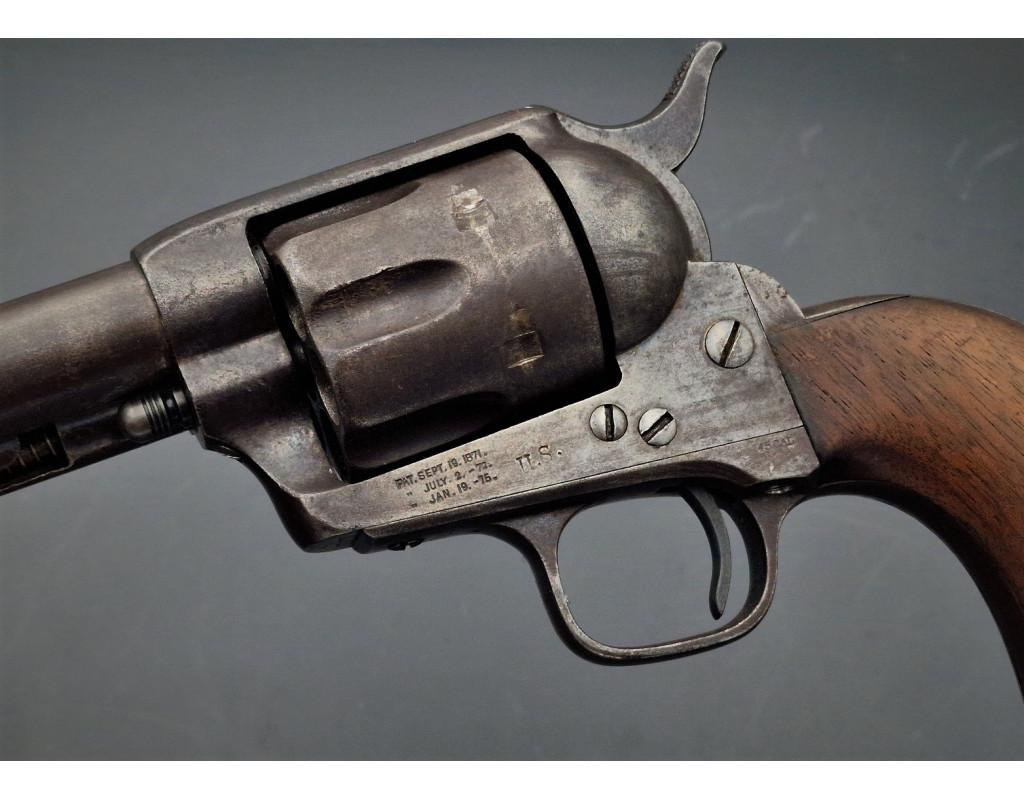 Authentique Backwards Address revolver connu à 7 exemplaires avec l'adresse Colt inversée sur le canon Gouvernment contract US cavalerie Colt SAA Single Action Army modèle 1873 produit en 1877 sous le numéro N°36807 en calibre 45LC, patine grise sans oxydation, inscription du fabricant sur le canon en italique conforme premier modèle et inversé Colt Hartford USA, brevets de production frappés sur deux lignes, poinçon d'affectation militaire US et du contrôleur RAC et numéro de série sur chaque pièces (canon, barillet, carcasse, pontet et crosse). Mécanisme complet et fonctionnel entièrement d'origine, excellent verrouillage sans jeu important, bonne indexation des chambres et entrefer peu usagé. Canon long de 7 pouces 1/2 rayures hélicoïdales encore bien nettes, ternies et légèrement tachées. Crosse noyer monobloc d'origine avec de chaque côté les tampons de contrôleurs.