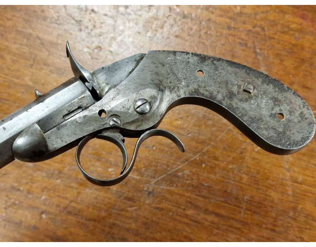 Rare et élégant petit pistolet de salon à système Flobert signé Lepage Mouthier et Fauré à Paris calibre 6 mm annulaire canon à pans long de 113mm équipé d'une hausse et guidon de visée, âme lisse légèrement tachée. Plaquette de crosse en corne blonde enveloppant la carcasse monobloc y compris l'embouchoir, pontet rond à repose doigt vissé par l'intérieur. Fabrication de qualité avec prestigieuse signature qui mérite une bonne place dans une collection d'armes anciennes. Longueur totale 21cm