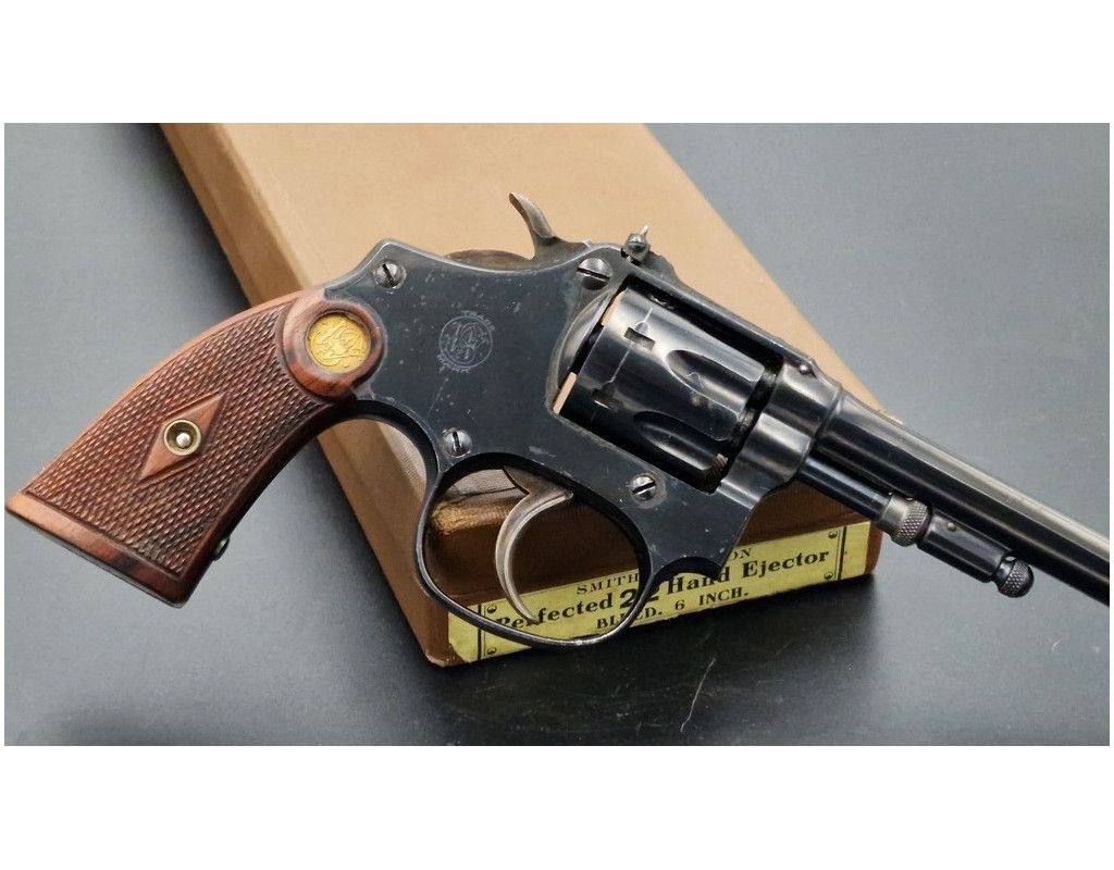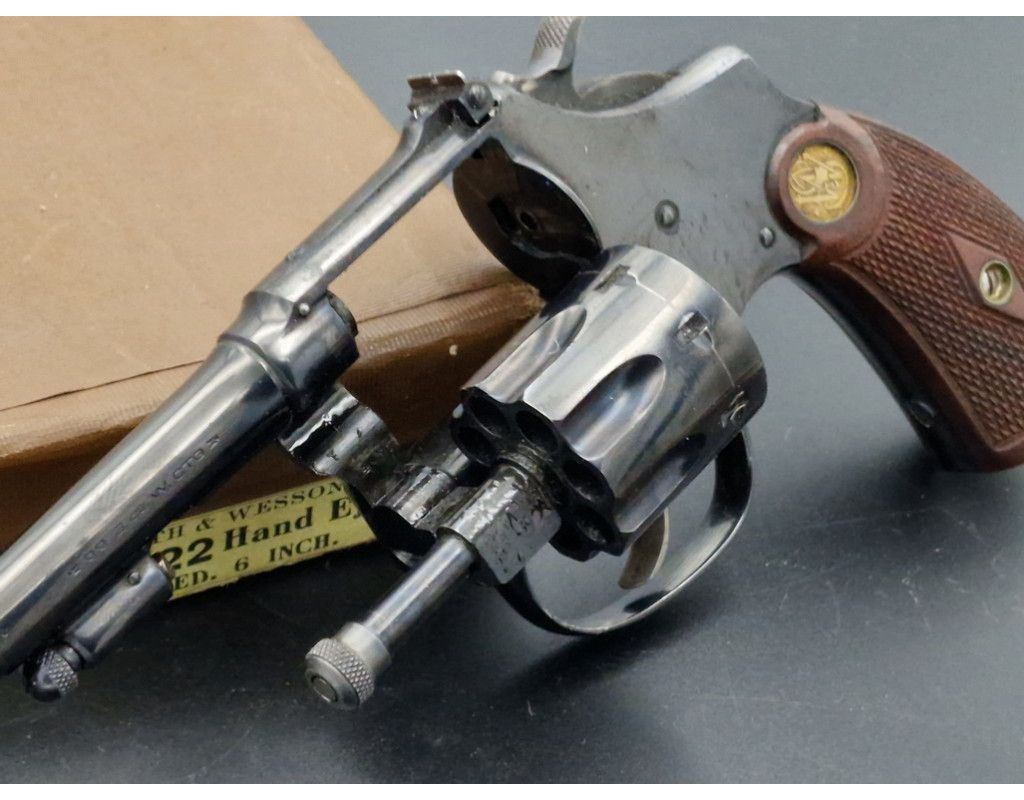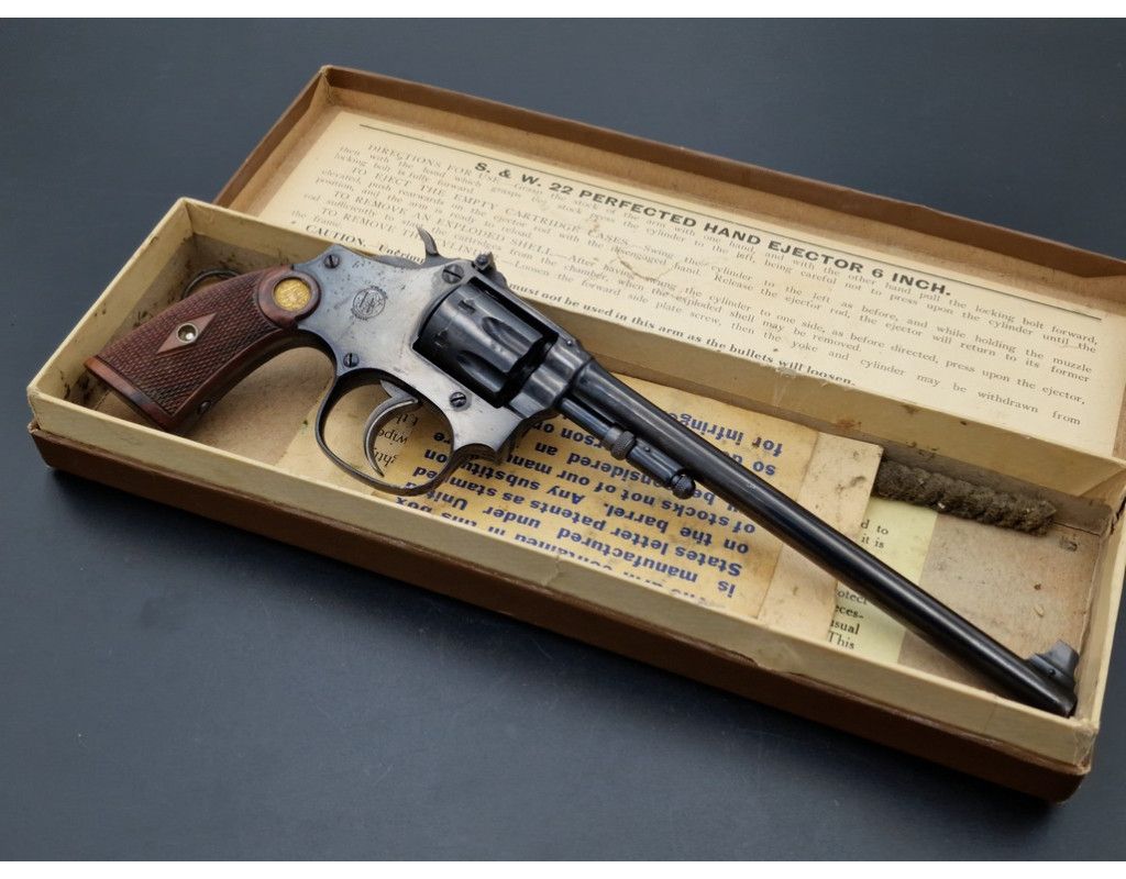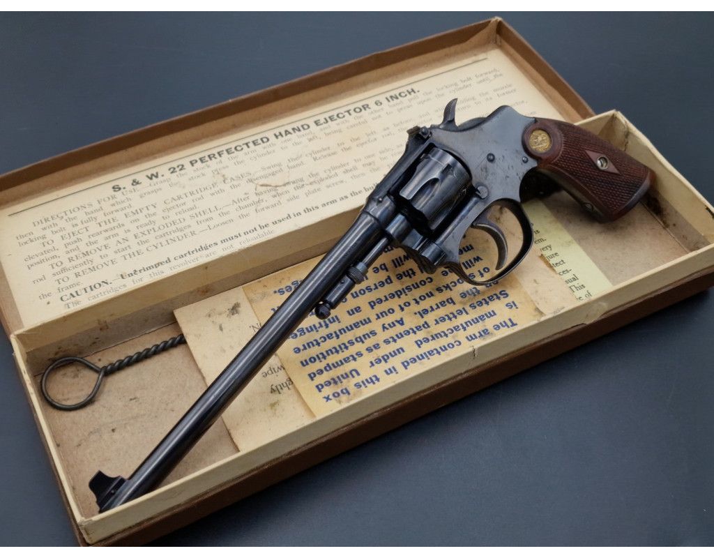 Rare revolver Lady Smith 3è modèle Target hausse réglable, à découvrir dans un état irréprochable dans son bronzage d'origine retenu dans sa totalité, chien et détente jaspés. Plaquette de crosse en quadrillés avec logos S&W dorés. Canon de 6 pouces bien marqué du fabriquant et des brevets de fabrication, rayures sans usure d'aspect miroir. Mécanique au fonctionnement irréprochable sans aucun jeu. Arme dans sa boite d'époque.