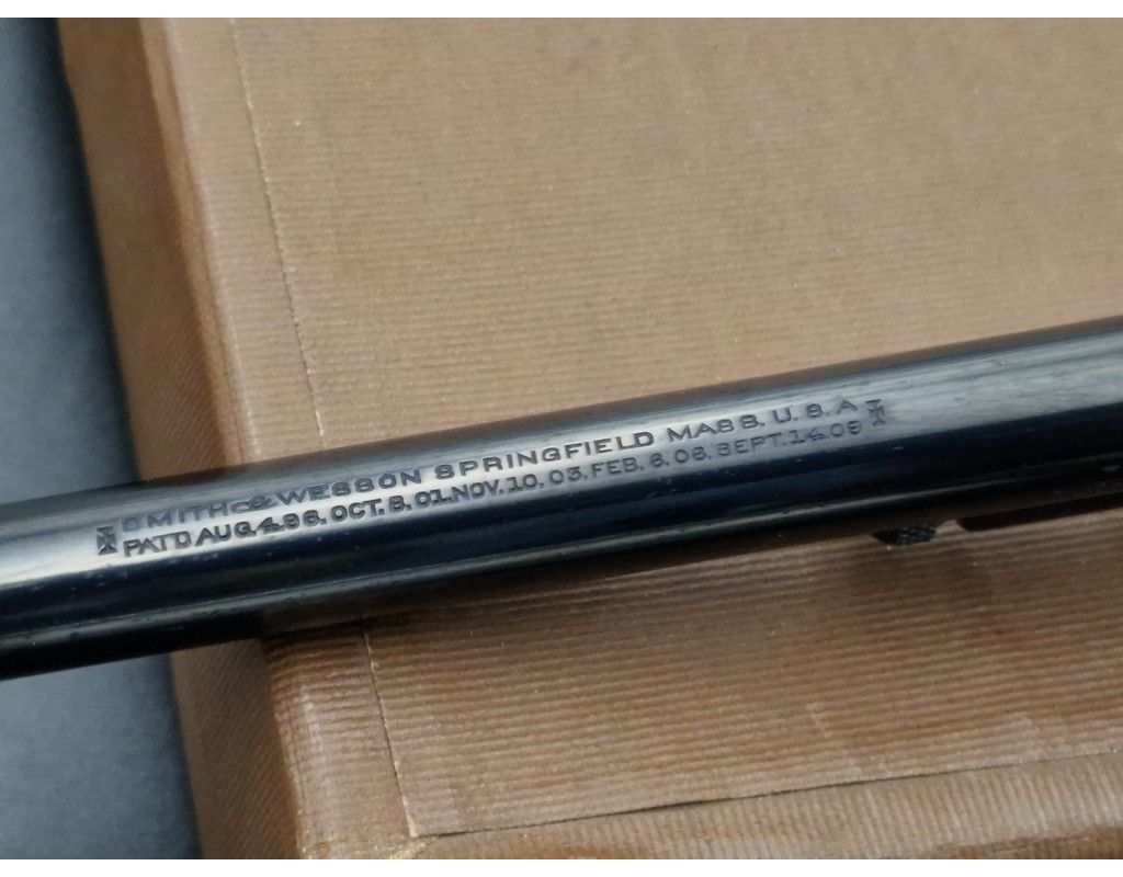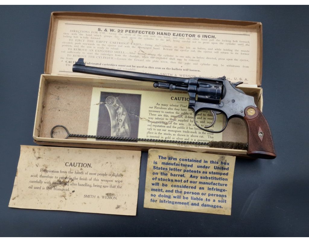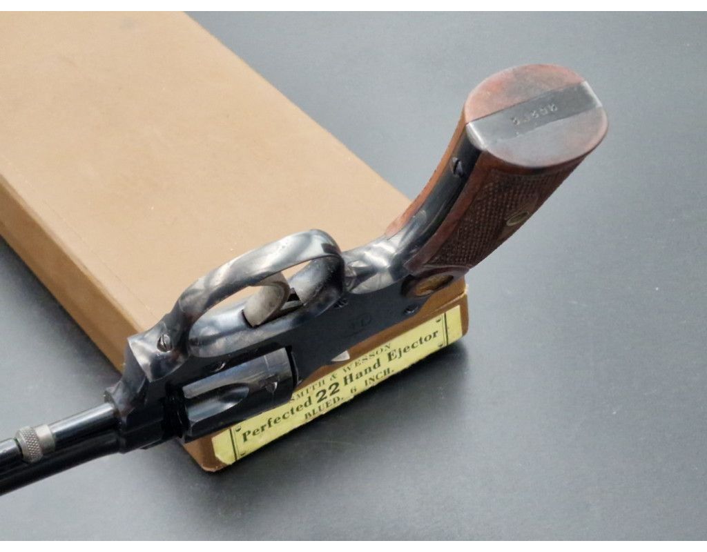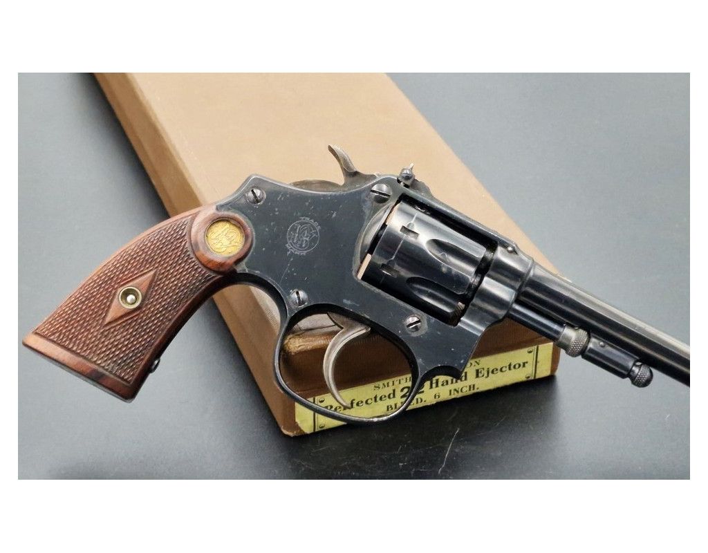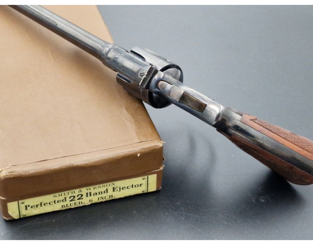 Rare revolver Lady Smith 3è modèle Target hausse réglable, à découvrir dans un état irréprochable dans son bronzage d'origine retenu dans sa totalité, chien et détente jaspés. Plaquette de crosse en quadrillés avec logos S&W dorés. Canon de 6 pouces bien marqué du fabriquant et des brevets de fabrication, rayures sans usure d'aspect miroir. Mécanique au fonctionnement irréprochable sans aucun jeu. Arme dans sa boite d'époque.