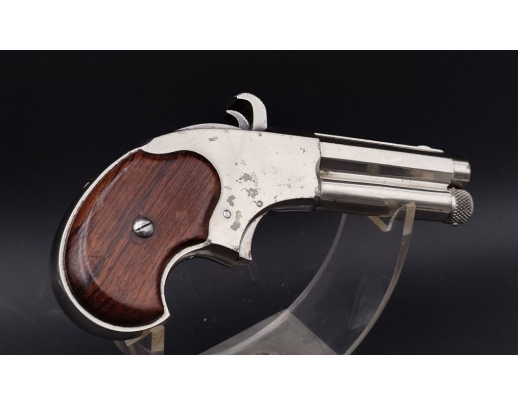 Arme à découvrir dans sa finition d'origine nickelée sans usure particulière. Mécanisme complet et parfaitement fonctionnel. Calibre 32 "extra court" percussion annulaire à magasin tubulaire de 5 cartouches. Canon octogonal de 3 pouces (76mm) avec marquages «E.Remington & Sons Ilion NY Riders Pat Aug 15th 1871», rayures encore bien présentes sans corrosion. Plaquettes de crosse en bois de rose.
