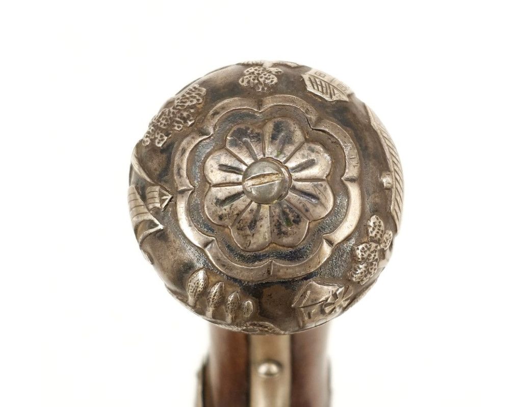 Pistolet à silex signé Bernardino actif à Rome de 1606 à 1608. Canon rond de 306mm, à pans au tonnerre marqué « Gironimo Dafino » actif au tout début XVIIè en même temps que Lazaro Cominazzo, platine et chien à col de cygne à corps rond, bassinet fer sans bride. Garnitures en argent, à décor repoussé de maisons, fleurs et feuillages, carquois et entrelacs. Décors en fer derrière la queu de culasse. Crosse en noyer à fines entures en bordure de la calotte. Calibre 13mm. Longueur totale 47cm