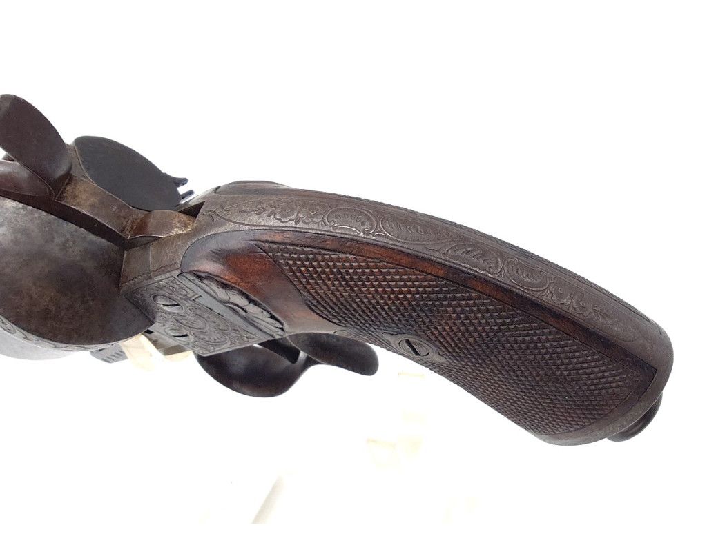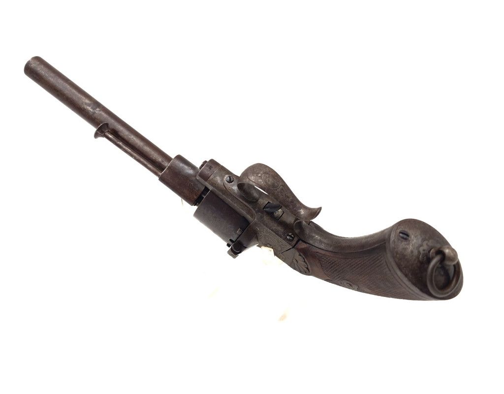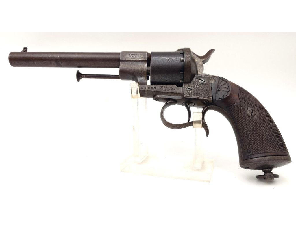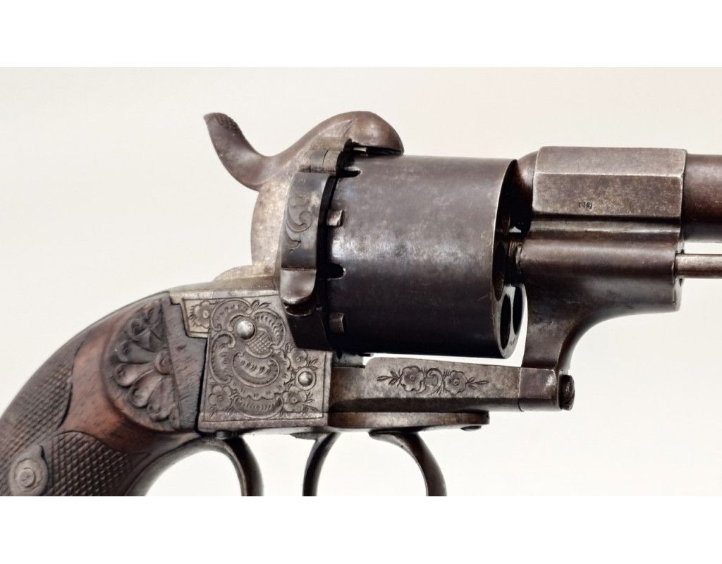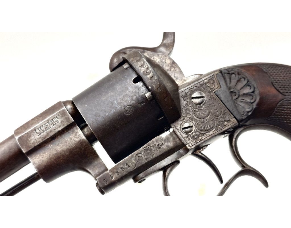 Revolver d'Officier Lefaucheux modèle 1854 fabrication liégeoise, finition luxe gravée de fleurs. Bronzage patiné sans oxydation. Mécanisme complet et fonctionnel sans usure particulière, canon à pans puis rond de 153mm rayures profondes sans usure, quelques taches interne. Plaquettes de crosse en noyer quadrillées et sculpté de palmettes. Marquage Invention Eugène Lefaucheux invention breveté sur le canon, poinçon ELG sur le barillet et JC devant le pontet.