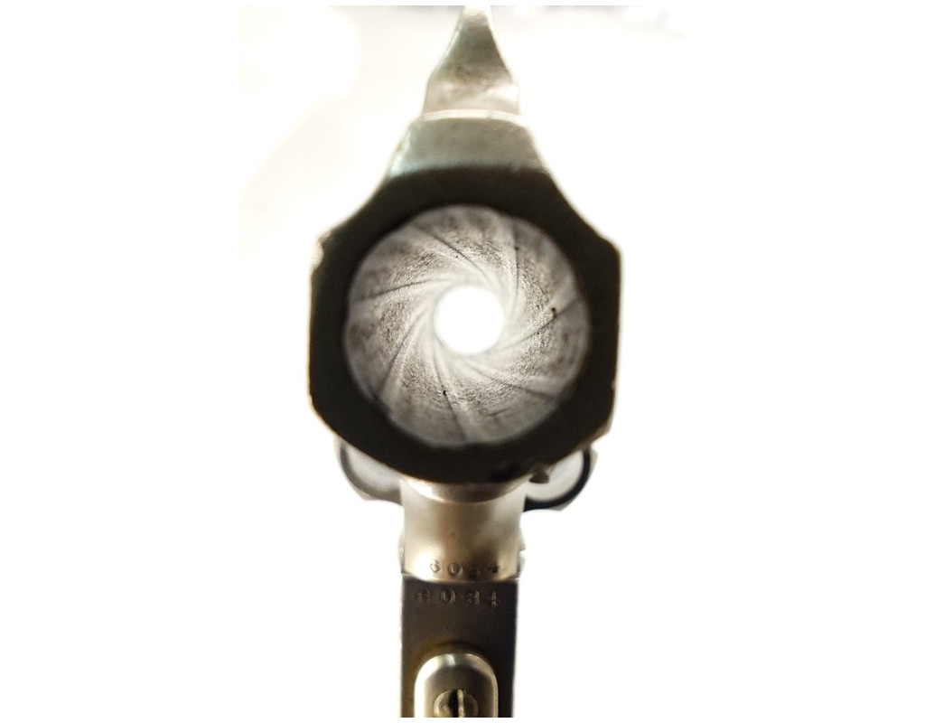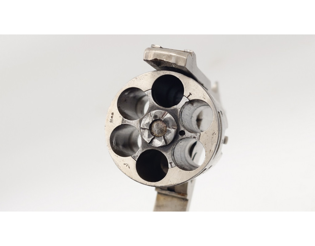 Finition nickelée d'origine avec patine et taches d'oxydation, une partie du barillet nettoyé. Mécanisme complet et fonctionnel avec toutes pièces d'origine, rayures usagée et légèrement tachées, plaquette de crosse d'origine dont celle de gauche accidentée et recollée. Possibilité d'en trouver d'autres dans le stock de pièces détachées au magasin.