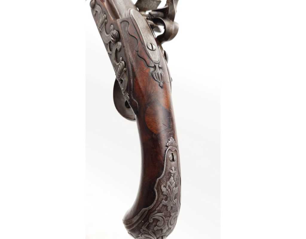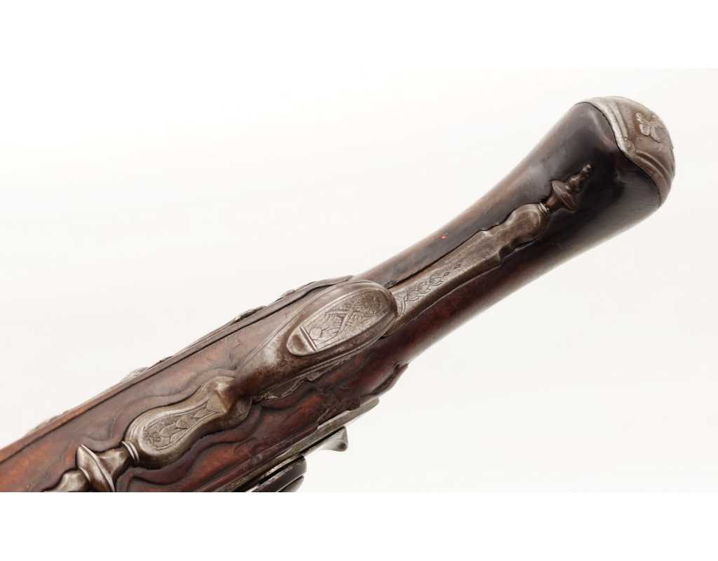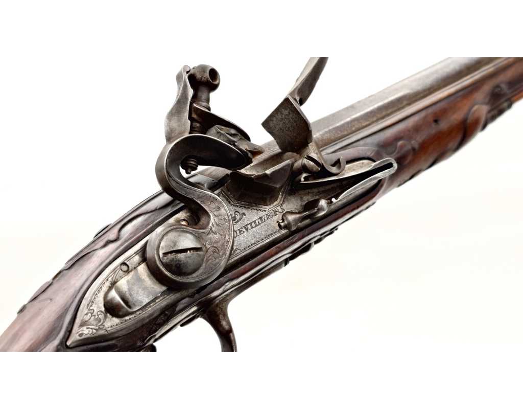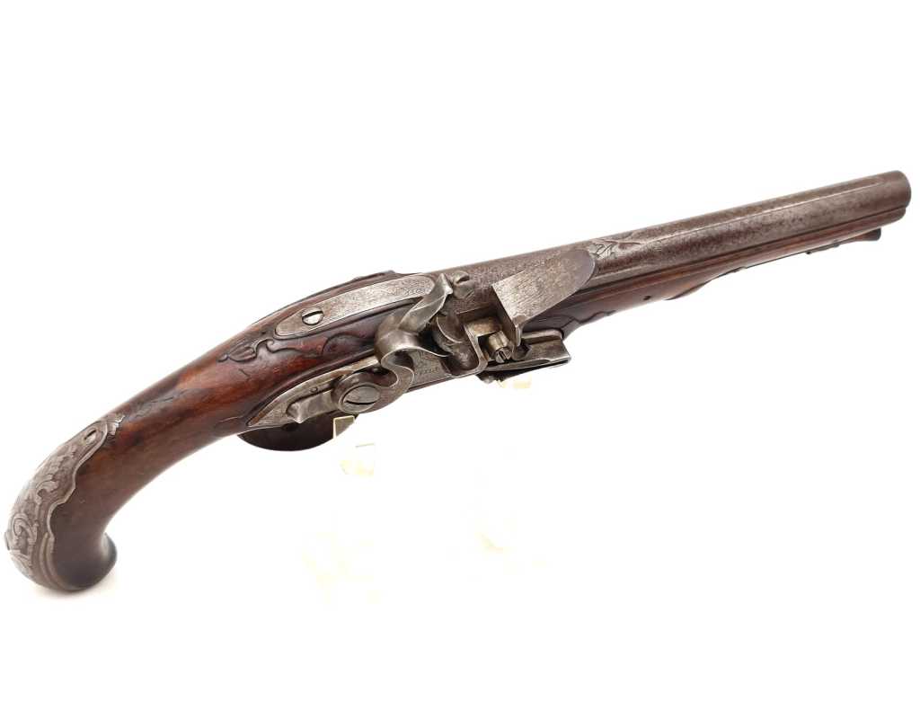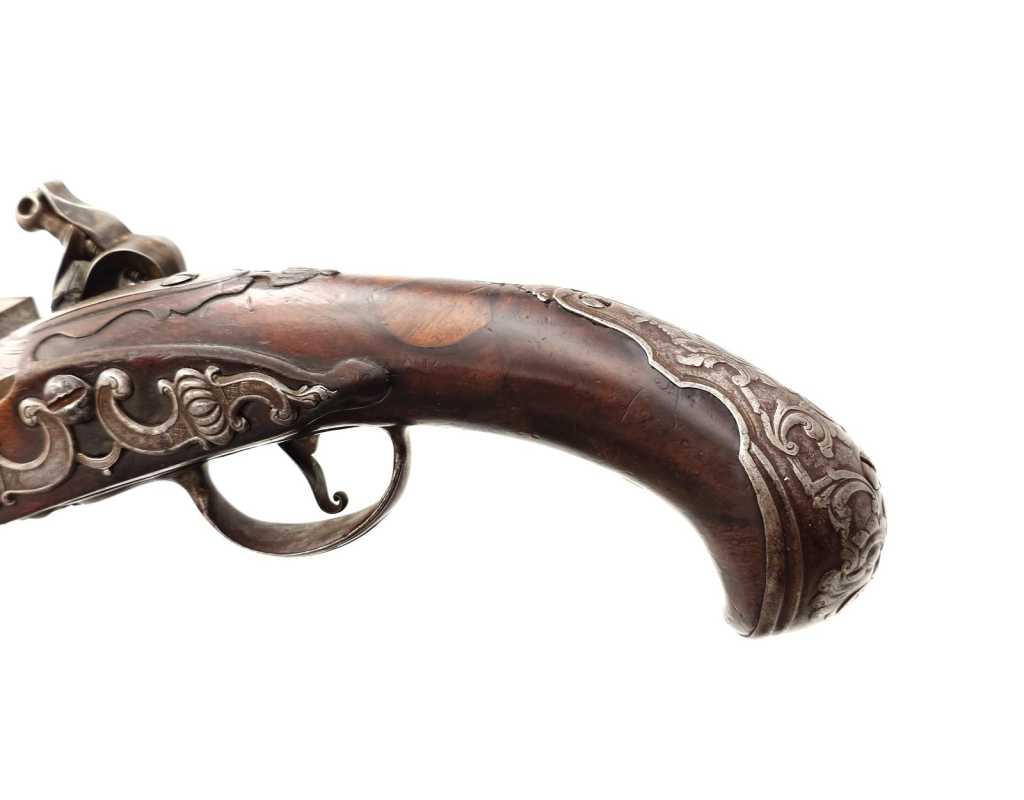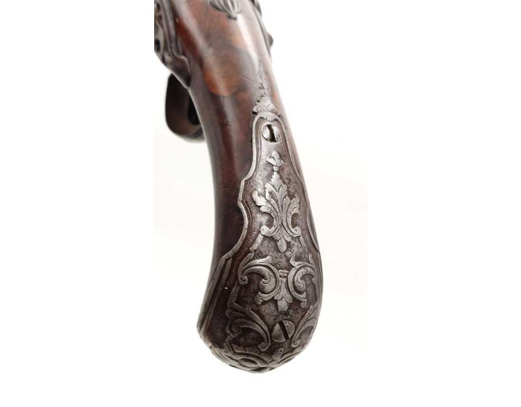 Pistolet de voyage à silex du XIIIè signé de l'arquebusier Henri Devillers actif de 1734 à 1762 à Liège. Entièrement monté en fer avec platine à corps plat, chien à col de cygne à sureté arrière, mécanisme fonctionnel, bassinet sans garde feu qui atteste une production précoce vers 1740. Canon rond à pans latéraux et bande de visée, long de 22cm, calibre 14.4mm. Contre-platine et pontet ouvragés, calotte à figure de grotesque. Fines gravures et ciselures, belle patine de l'ensemble. Monture en noyer, crosse à bec de corbin, moulures, léger manque entre la platine et la détente recourbée. Longueur totale environ 39cm.