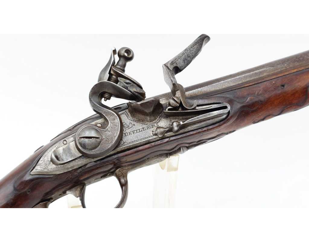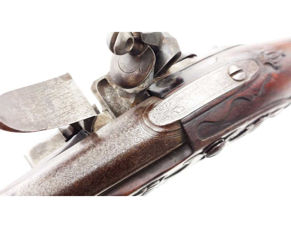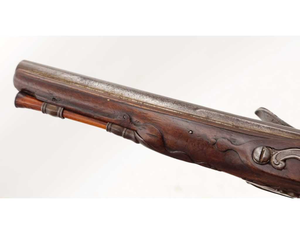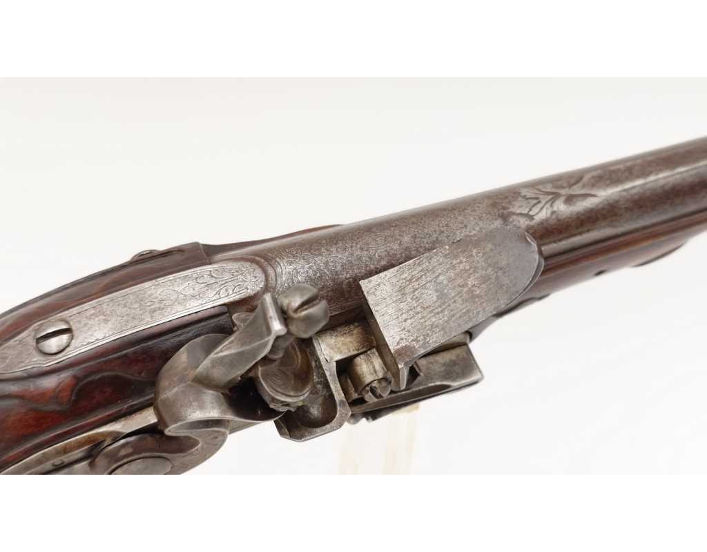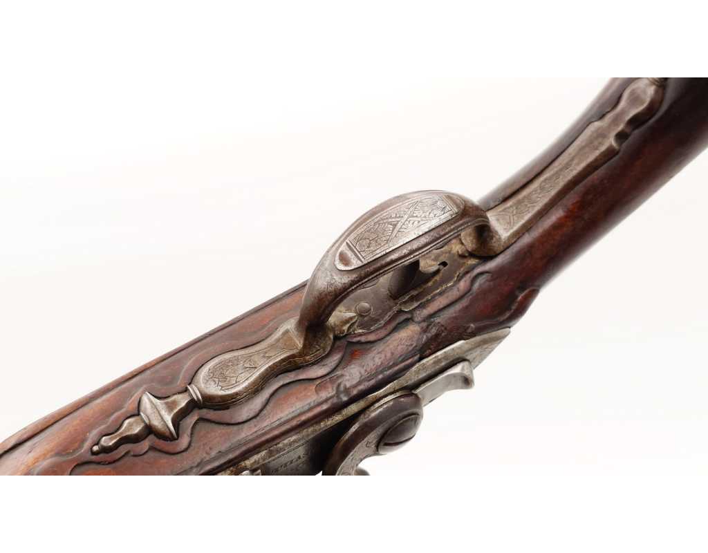 Pistolet de voyage à silex du XIIIè signé de l'arquebusier Henri Devillers actif de 1734 à 1762 à Liège. Entièrement monté en fer avec platine à corps plat, chien à col de cygne à sureté arrière, mécanisme fonctionnel, bassinet sans garde feu qui atteste une production précoce vers 1740. Canon rond à pans latéraux et bande de visée, long de 22cm, calibre 14.4mm. Contre-platine et pontet ouvragés, calotte à figure de grotesque. Fines gravures et ciselures, belle patine de l'ensemble. Monture en noyer, crosse à bec de corbin, moulures, léger manque entre la platine et la détente recourbée. Longueur totale environ 39cm.