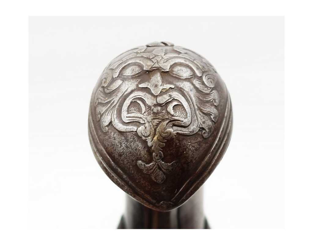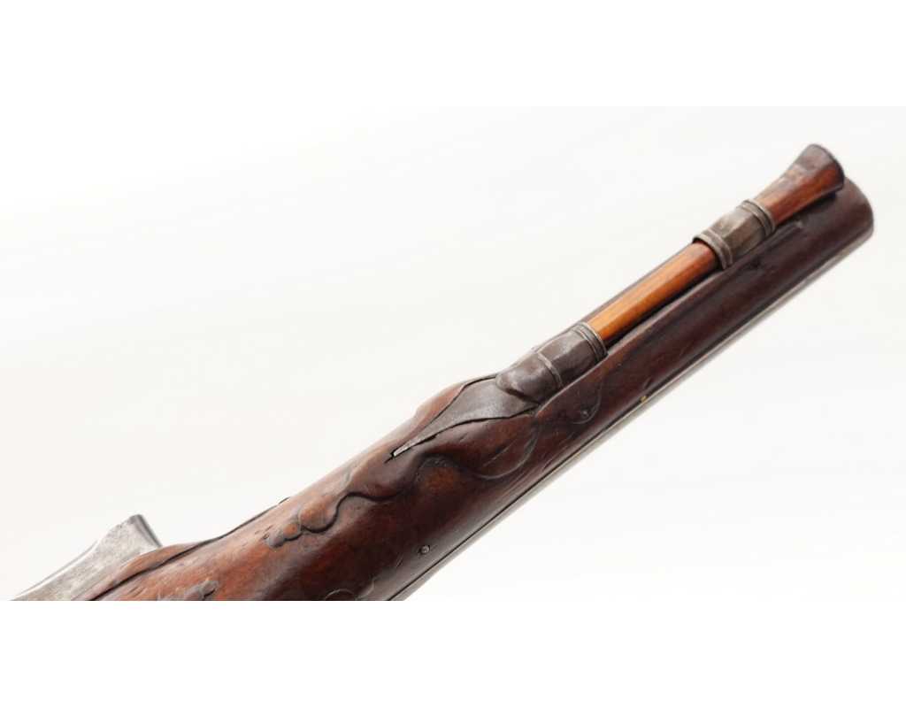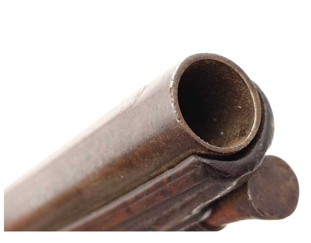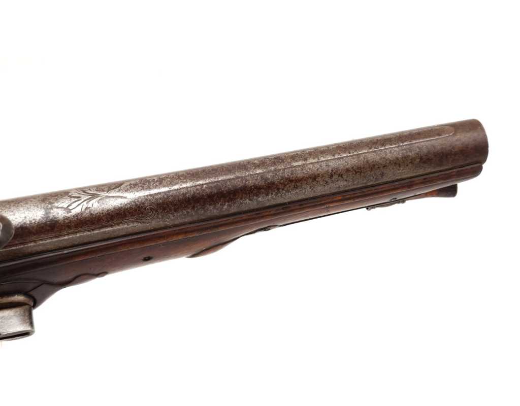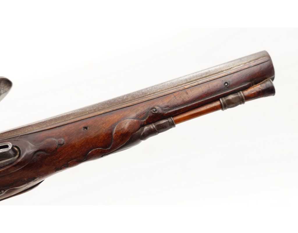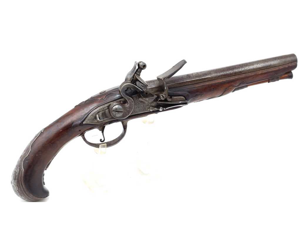 Pistolet de voyage à silex du XIIIè signé de l'arquebusier Henri Devillers actif de 1734 à 1762 à Liège. Entièrement monté en fer avec platine à corps plat, chien à col de cygne à sureté arrière, mécanisme fonctionnel, bassinet sans garde feu qui atteste une production précoce vers 1740. Canon rond à pans latéraux et bande de visée, long de 22cm, calibre 14.4mm. Contre-platine et pontet ouvragés, calotte à figure de grotesque. Fines gravures et ciselures, belle patine de l'ensemble. Monture en noyer, crosse à bec de corbin, moulures, léger manque entre la platine et la détente recourbée. Longueur totale environ 39cm.