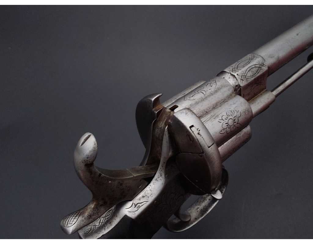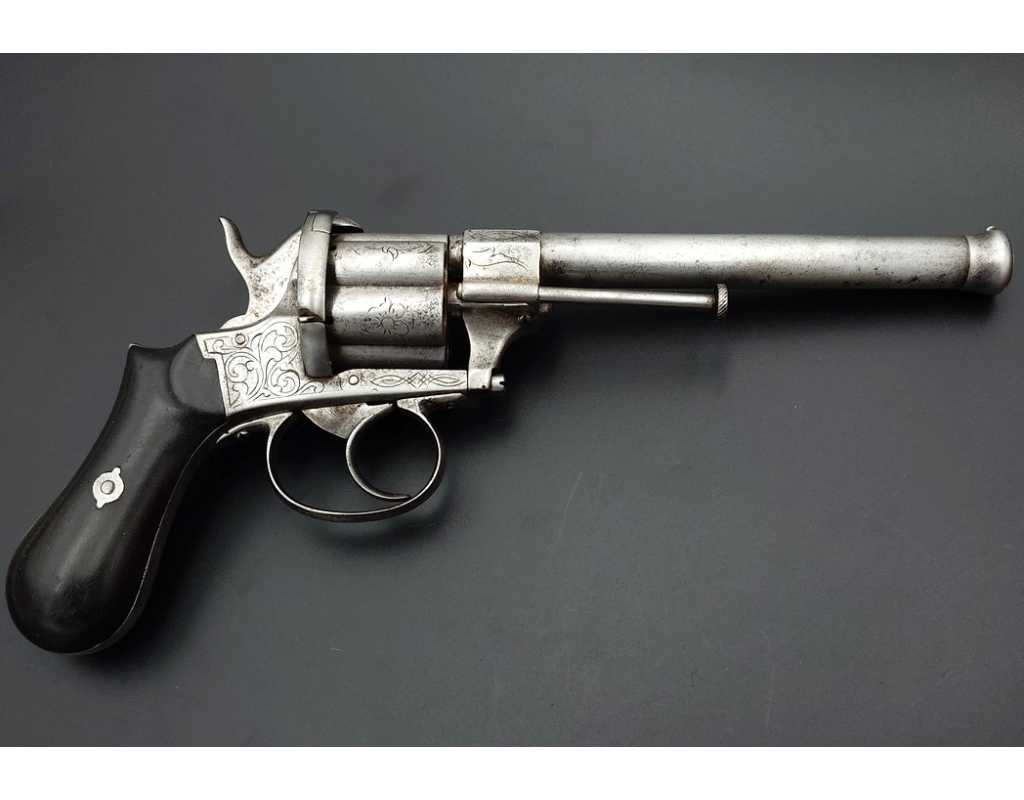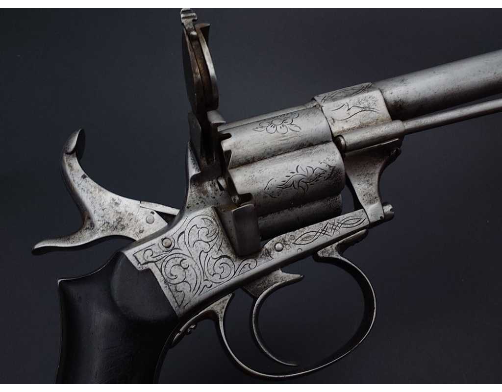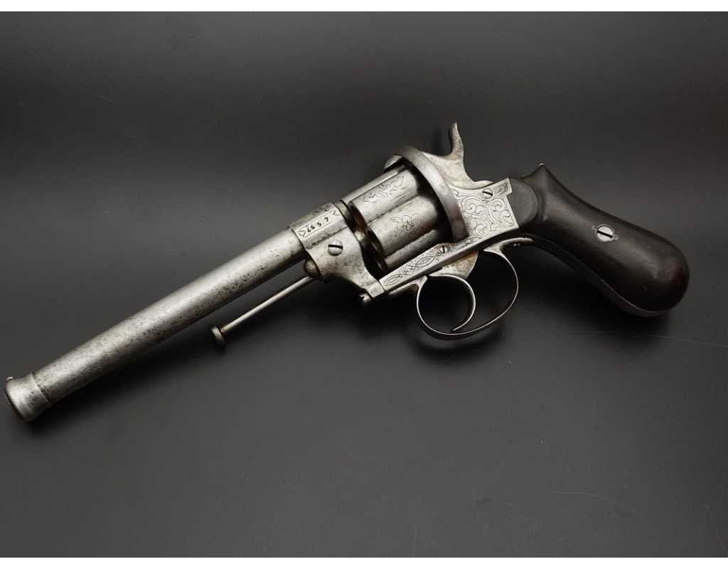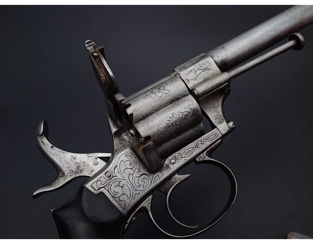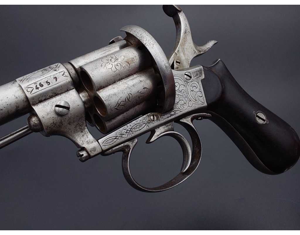 Belle fabrication belge d'un revolver à broche en calibre 9mm, fonctionnement irréprochable en simple et double action, barillet à chambres évidées capacité de 6 coups, bouche du canon renformée par un bourrelet, longueur 14.5cm à rayures profondes ternies et légèrement tachées. Finition d'origine patinée sans oxydation, gravures de rinceaux et de fleurs non atténuées, cadre à bouclier de protection des broches. Plaquettes de crosse en ébène lisse. Longueur totale 27cm