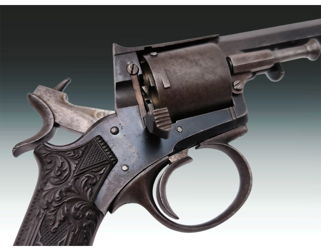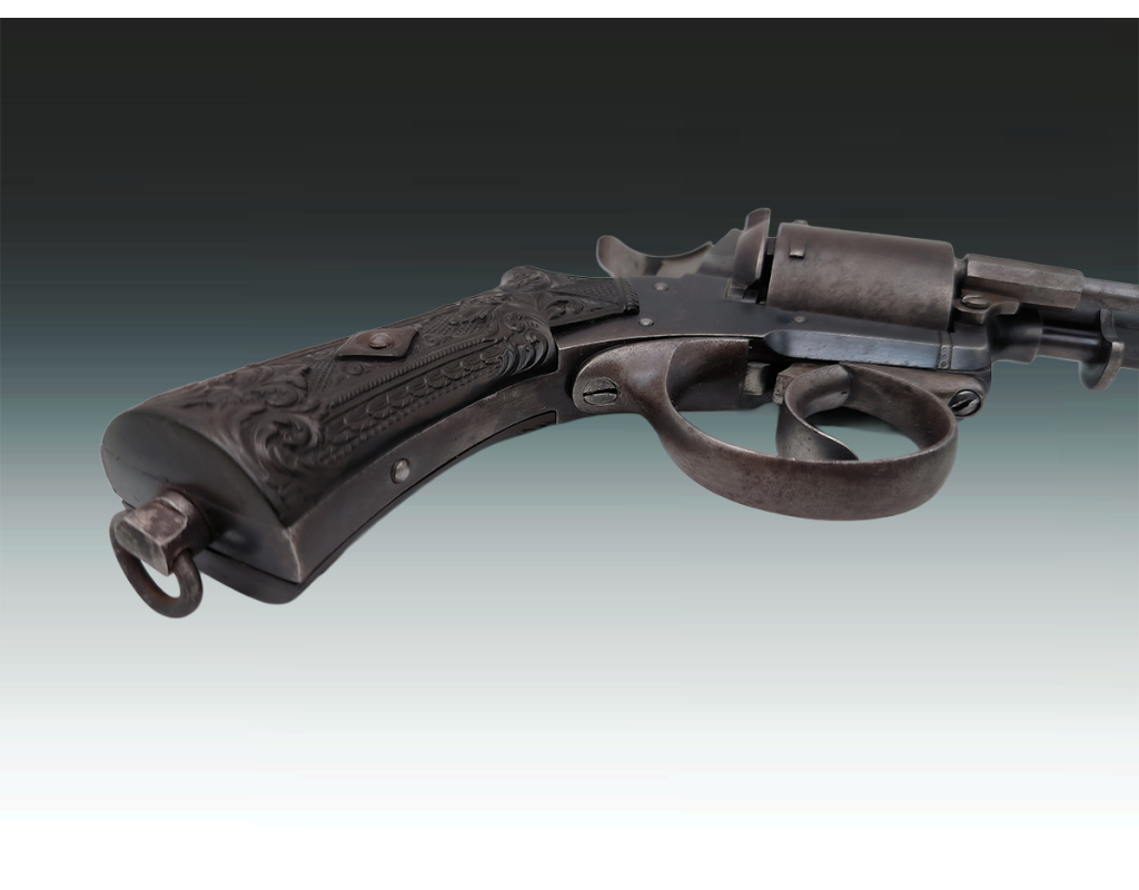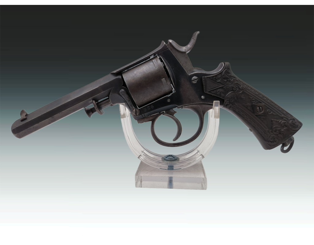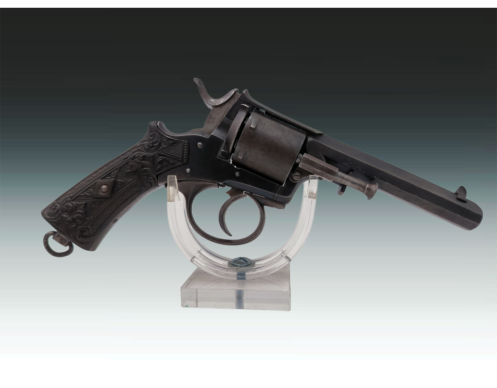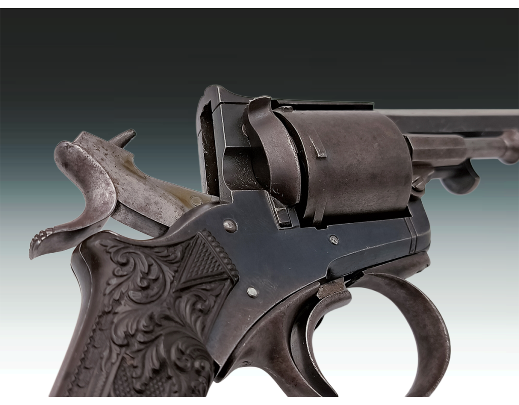 Revolver belge ou britannique de type Tranter 6 coups calibre 320 long simple et double action. Finition bronzée avec légère patine sans oxydation. Mécanisme fonctionnel sans jeu. Canon long de 10.2cm, belles rayures sans usure ni tache. Superbe plaquettes de crosse en gutta percha finement sculptées. Longueur totale 23.5cm. Aucun poinçon ni marque décelé.
