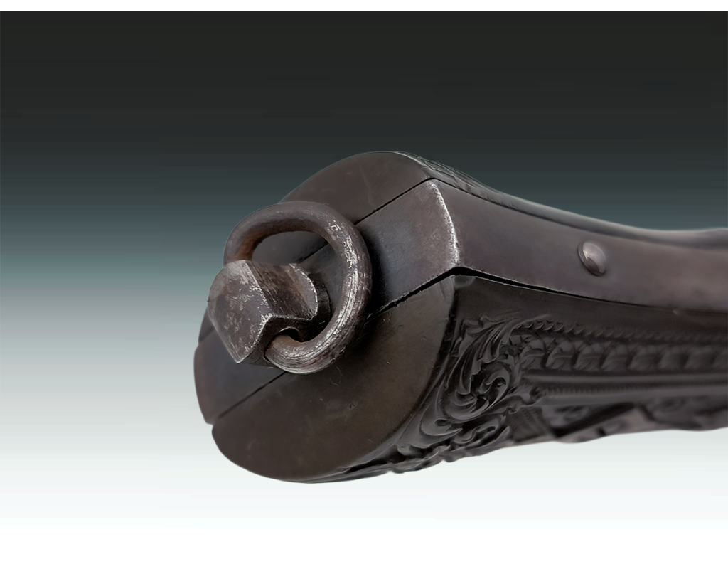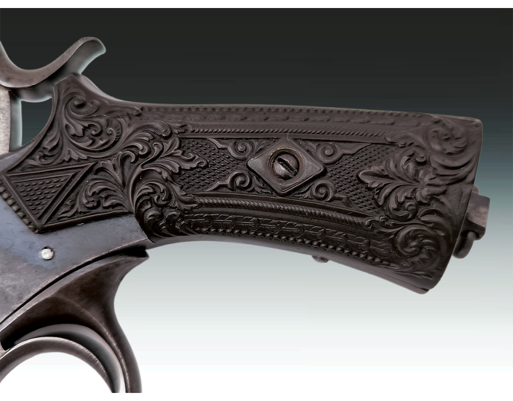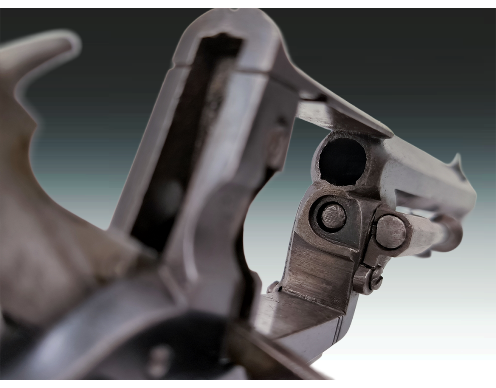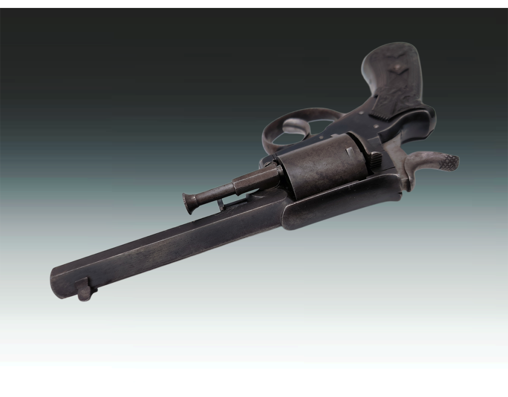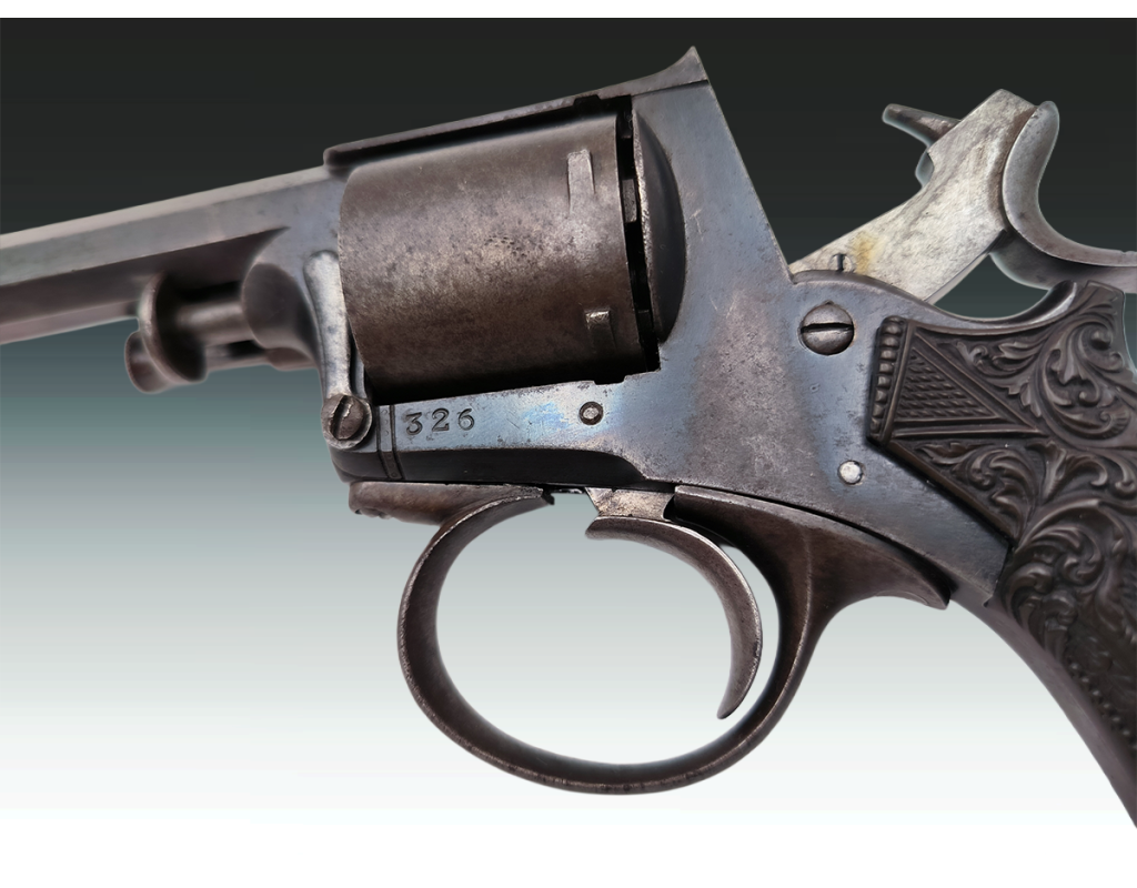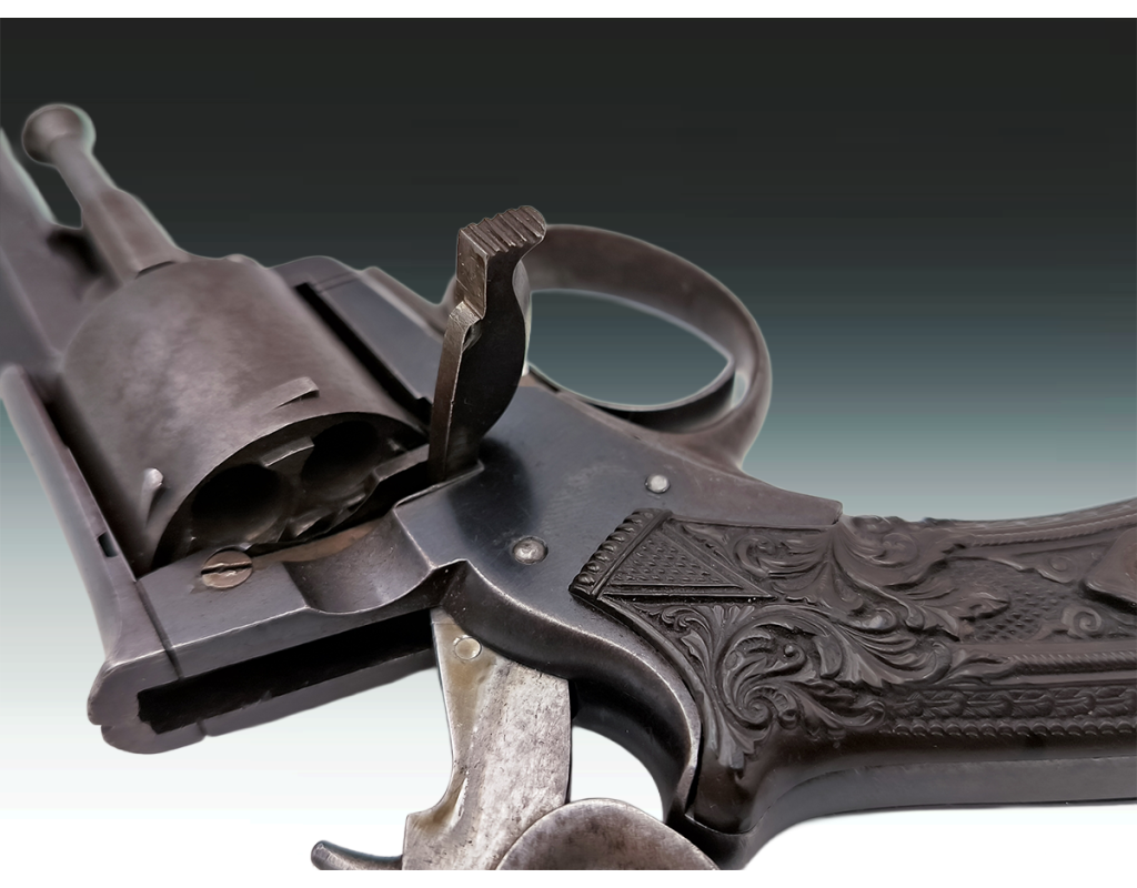 Revolver belge ou britannique de type Tranter 6 coups calibre 320 long simple et double action. Finition bronzée avec légère patine sans oxydation. Mécanisme fonctionnel sans jeu. Canon long de 10.2cm, belles rayures sans usure ni tache. Superbe plaquettes de crosse en gutta percha finement sculptées. Longueur totale 23.5cm. Aucun poinçon ni marque décelé.
