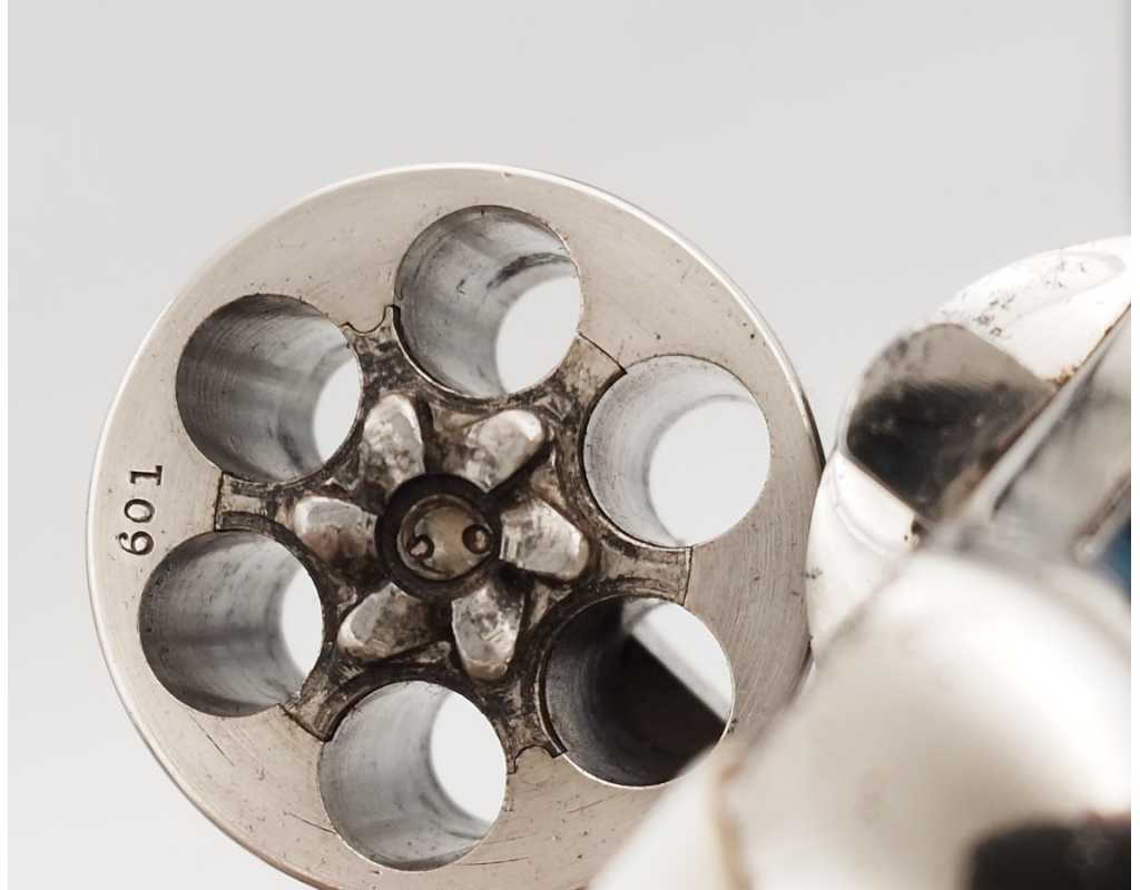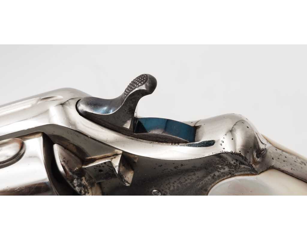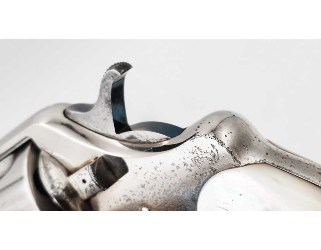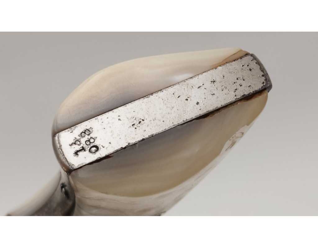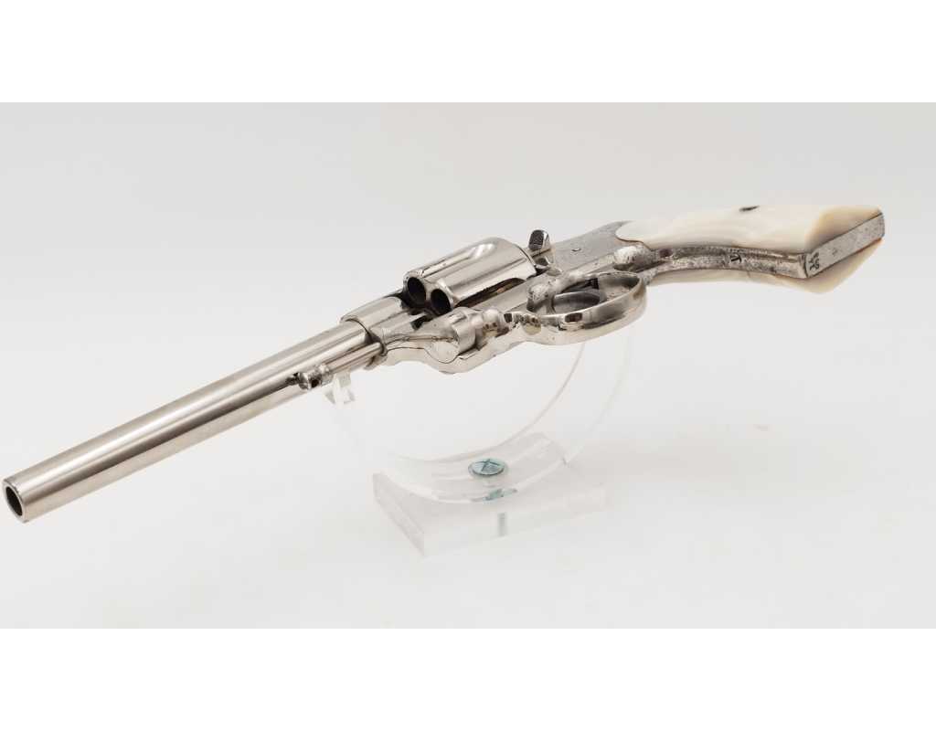 Bel exemplaire d'un revolver Colt modèle 1889 Navy en finition luxe nickelé d'origine produit jusqu'en 1894 à seulement 31000 exemplaires, numéroté 13083 le notre est sorti de l'usine en 1891. Légères lacunes du nickel sans oxydation, marquages sur le canon non atténués ainsi que le cheval cabré sur le cadre. Chien et détente encore bleuis. Mécanisme parfaitement fonctionnel, très souple sans aucun jeu de verrouillage. Canon long de 6 pouces, rayures brillantes sans usure particulière, fines taches d'oxydation localisées. Rare plaquettes de crosse en nacre sans manque. Longueur totale 31cm.