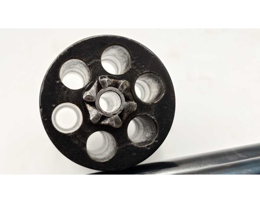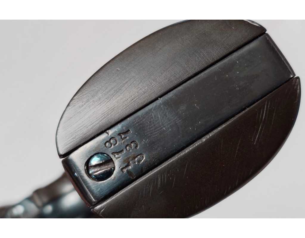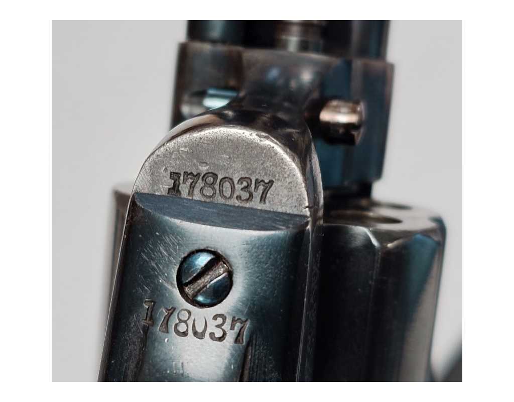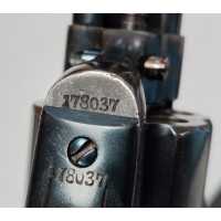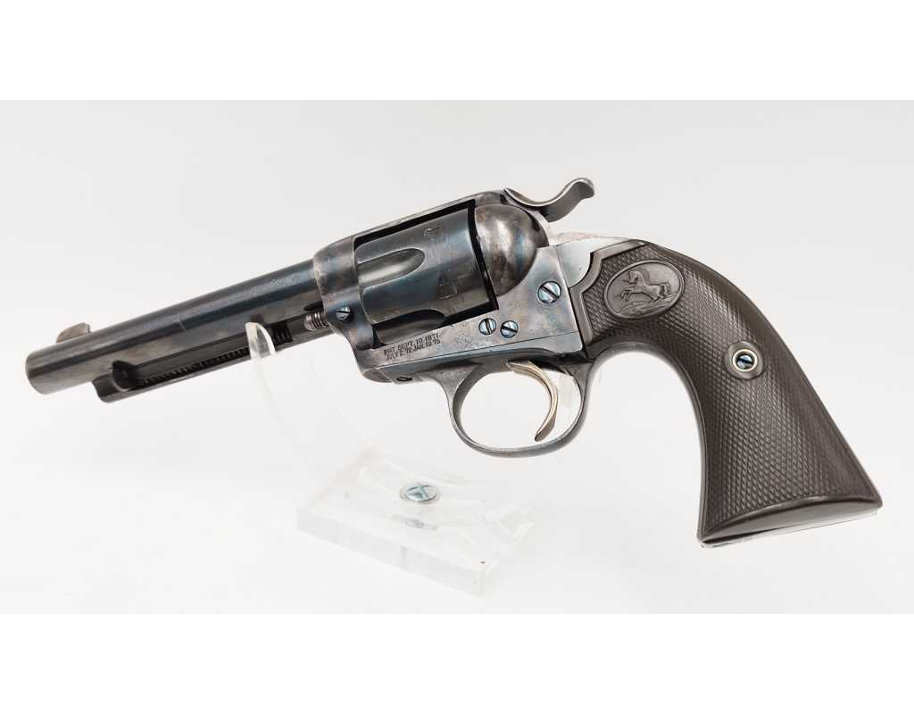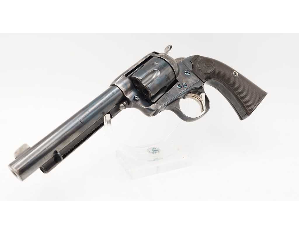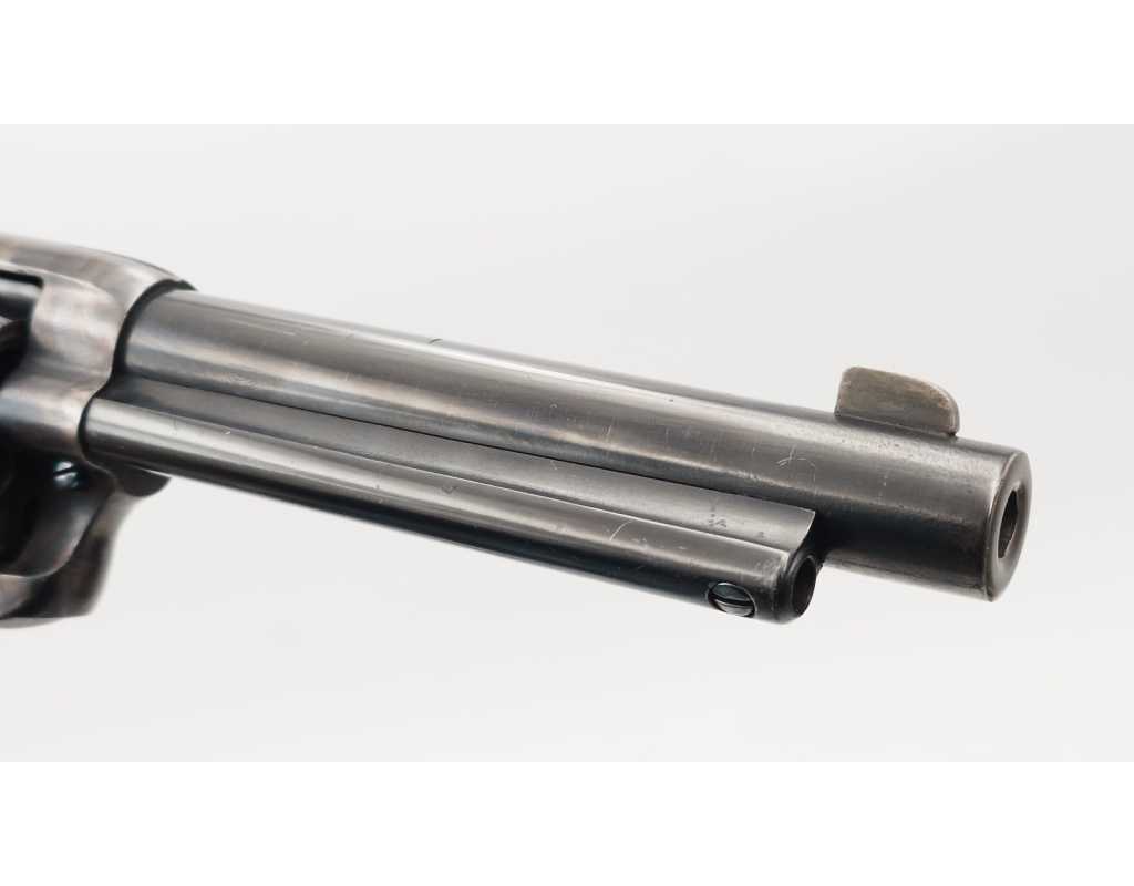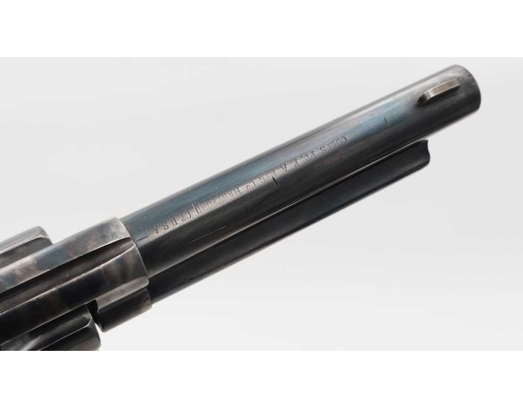 Adresse Colt sur le canon, indication du calibre latérale, patent et cheval cabré sur la carcasse bien lisibles. Mécanisme complet et fonctionnel bien souple, toutes pièces d'origine au même numéro, aucun entre fer entre le canon et le barillet, excellent verrouillage sans jeu, indexation parfaite. Canon de 5 pouces et demi à rayures brillantes sans usure particulière. Plaquettes de crosse en gutta-percha légèrement usagée.